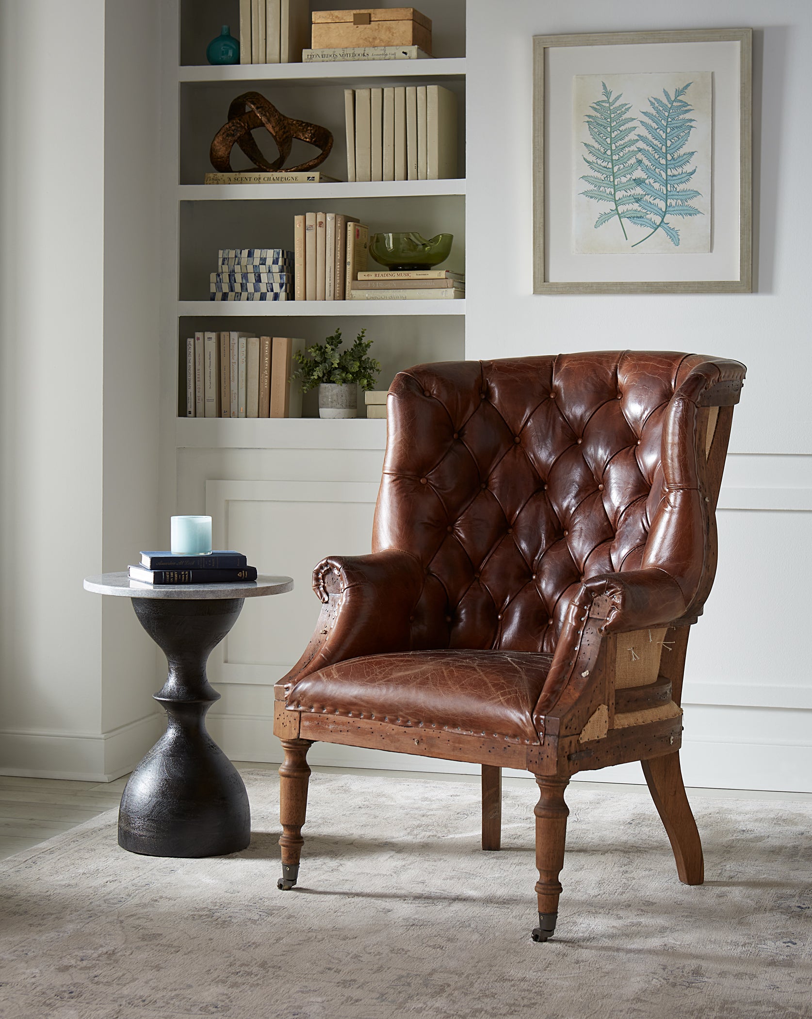 Reminiscent of a classic club chair, our Charles collection of traditionally designed arm chairs bring a luxurious look to any home. This Charles club chair is handcrafted in a vintage cigar leather and features a classic diamond-shaped button pattern along the seat back with a solid hardwood frame in classic walnut finish. The cushion seat is molded for ultimate comfort while the hand carved legs and deconstructed back exude a European charm, making this chair the perfect addition to any library or living room. This pre-assembled Charles chair is ready-to-use and of the finest quality, and with its vintage feel, it will make an effortless addition to any home.