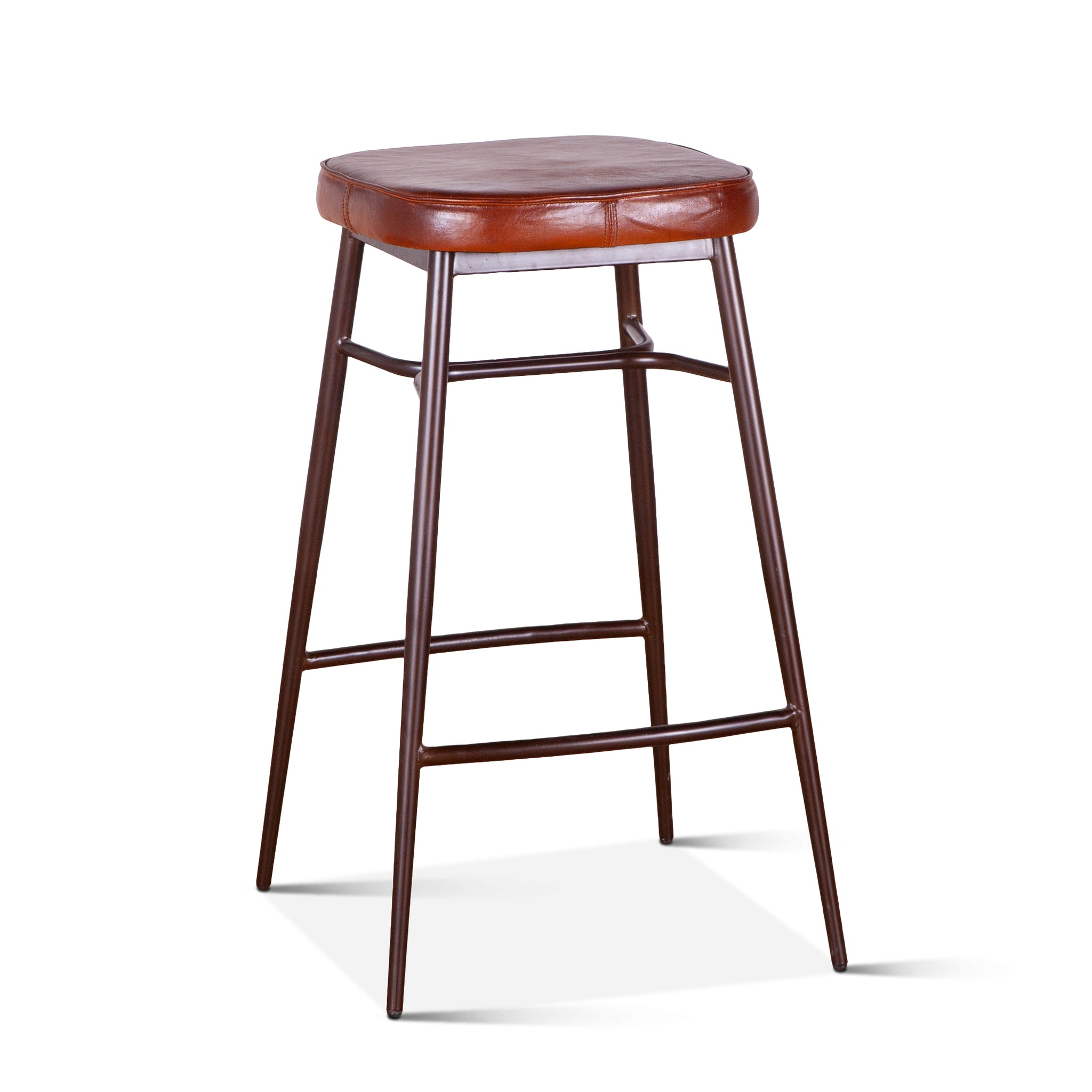 • Bar stool has an upholstered genuine goat leather seat in vintage tan color