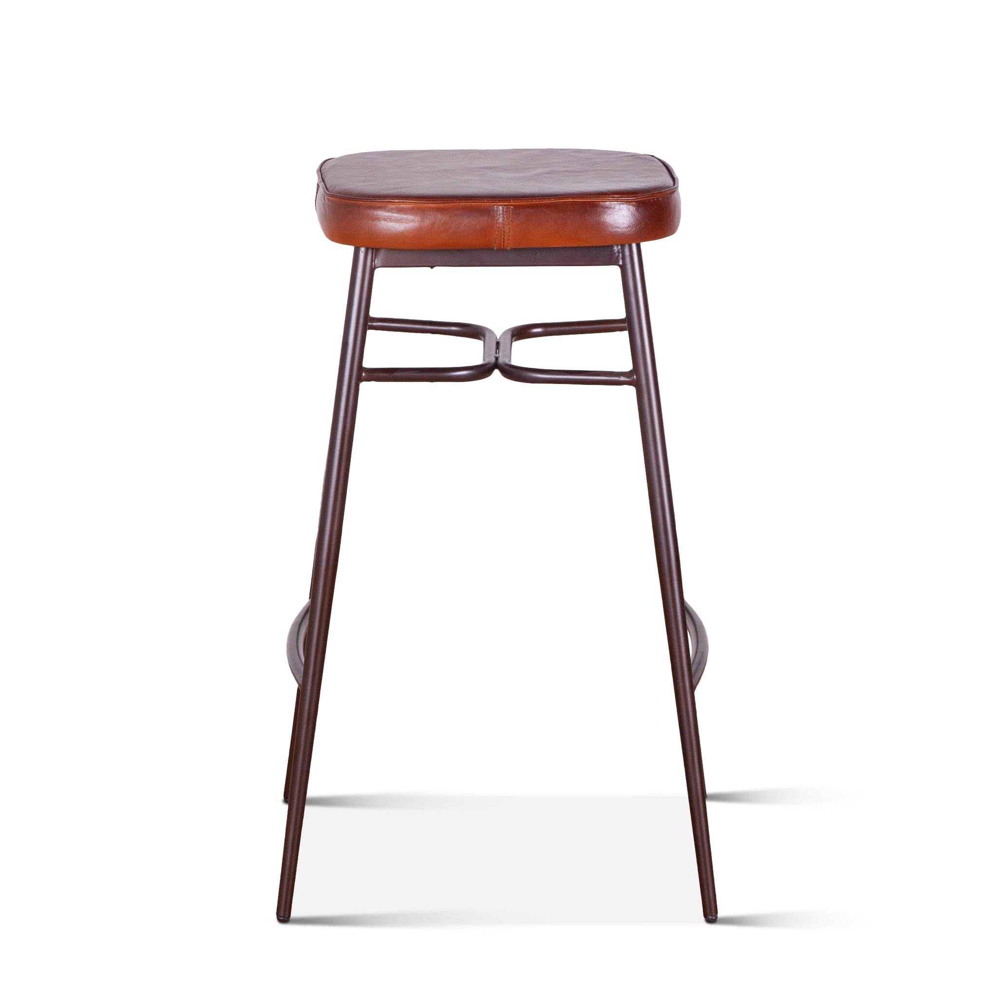 The Hudson collection of retro-inspired chairs are sure to a add vintage charm to any home. The rich goat leather of this stool is molded for ultimate comfort, while the stitched detailing accentuates the retro look of the seat. The iron frame and legs have a powder coated brown finish, and levelers with caps adorn the feet to protect all types of flooring. Pair with your favorite bar or countertop for a casual gathering spot, or add to an industrial desk for a stylish work space. The stool is pre-assembled and is made with materials of the finest quality, making it an effortless addition to any home.