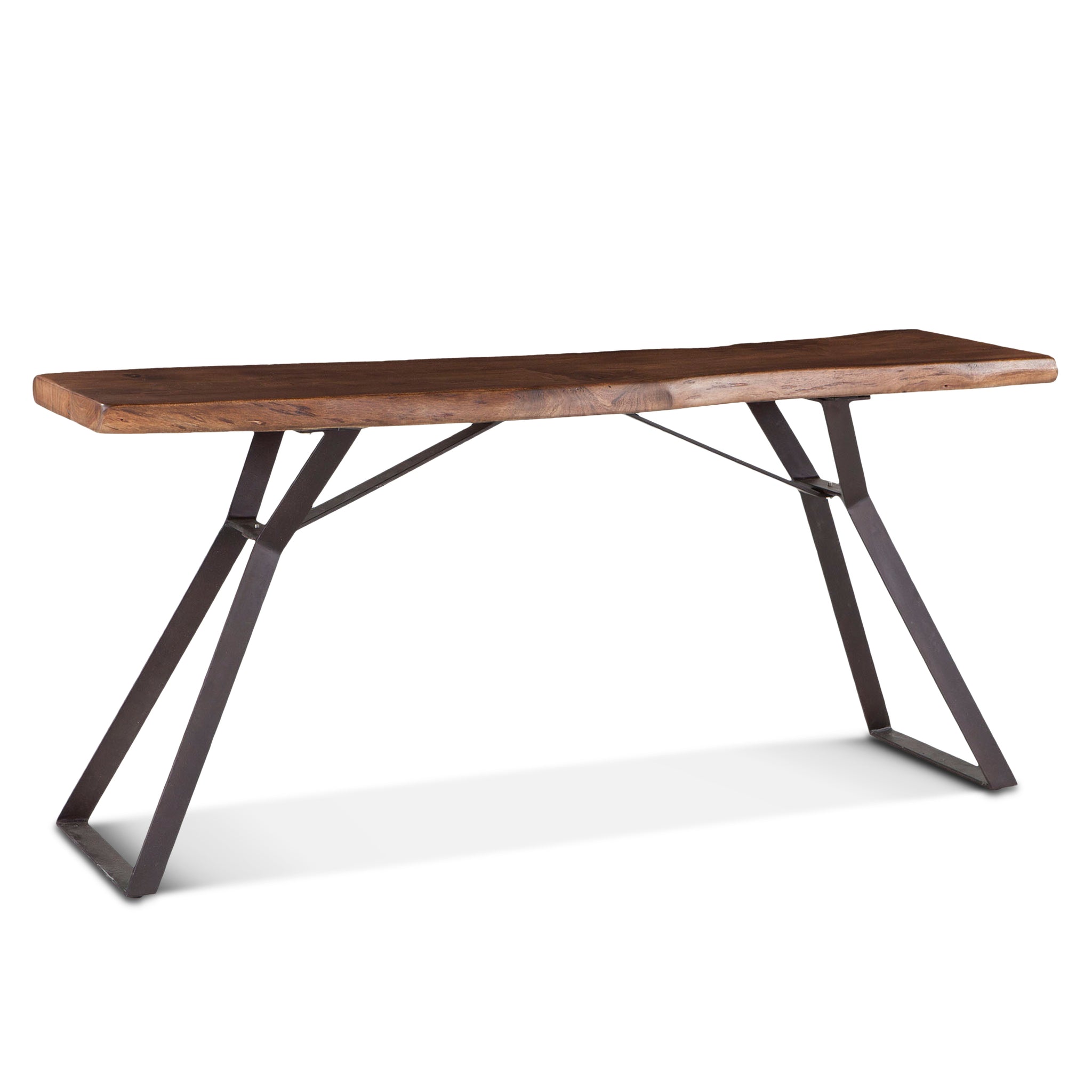 The Nottingham collection elevates mid-century modern to the next level with sustainable organic materials and modern design elements. Casual enough for a beachfront oasis, yet modern enough for a European loft style home, the Nottingham collection has furniture pieces for every room in your home. With a classic charm and air of sophistication, the hand-crafted live edge table top is cut from a thick acacia wood slab featuring curved edges, and the water-based catalyzed walnut finish on the acacia wood top offers durability while showcasing the natural grain of the wood. The table's top rests on a black, hand-forged iron base to create a fusion of natural and industrial elements. This console table requires some assembly and with materials of the finest quality, it will be an effortless addition to any home.