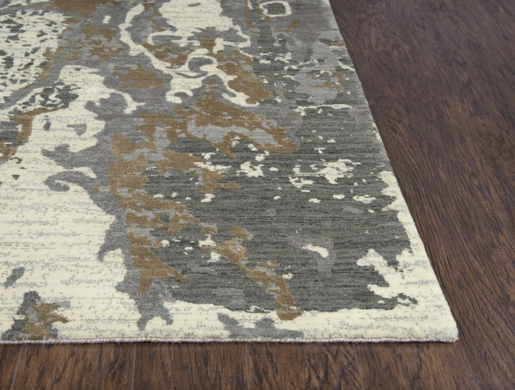 The neutral grey, ivory, and gold colors of this modern Rizzy Home Artistry Rug come together to create an abstract pattern flowing from one side to the other. Made from 80-percent New Zealand wool and 20-percent Tencel fiber blend, the gold in this rug will capture your gaze. The wool is hand-washed and hand-carved to give softness and depth to its contemporary distressed design. All sides are hand-surged to add a clean, finished edge.