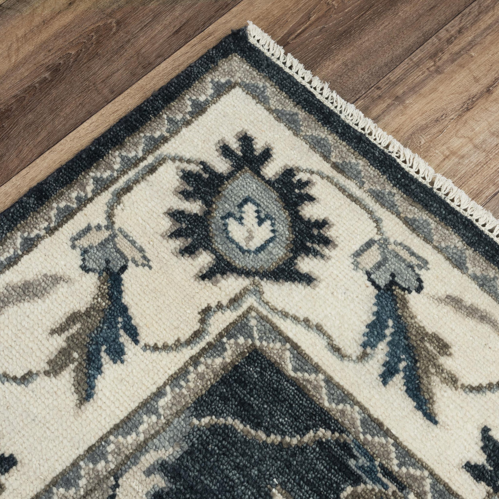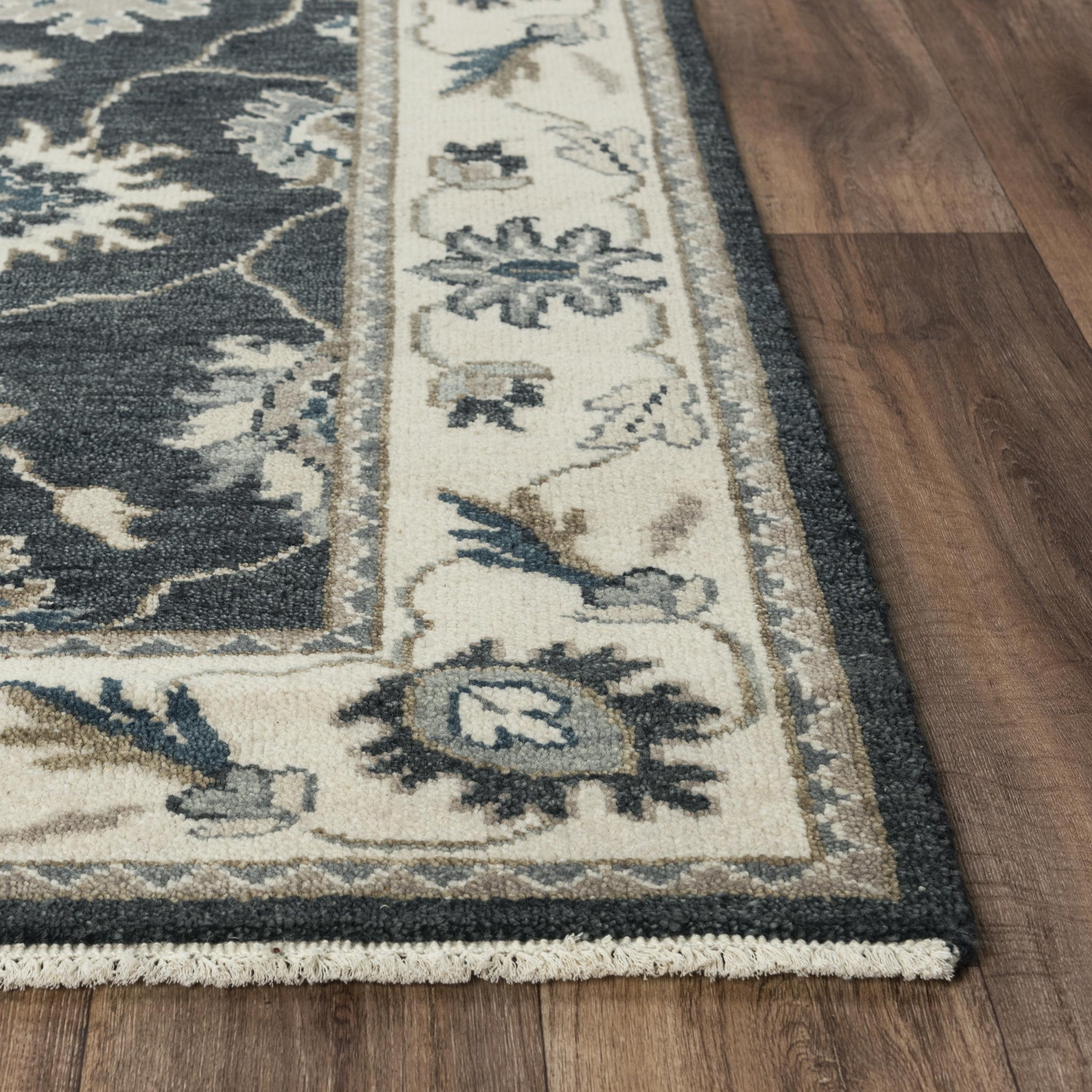 This transitional Persian-style rug will be a treasure in any home or office. Rizzy Home Ashton has created an Oriental beauty in black, charcoal, and ivory in a hand-tufted, hand-surged compliment to your decor. The hand spun New Zealand wool in this piece has soft and longwearing durability.
