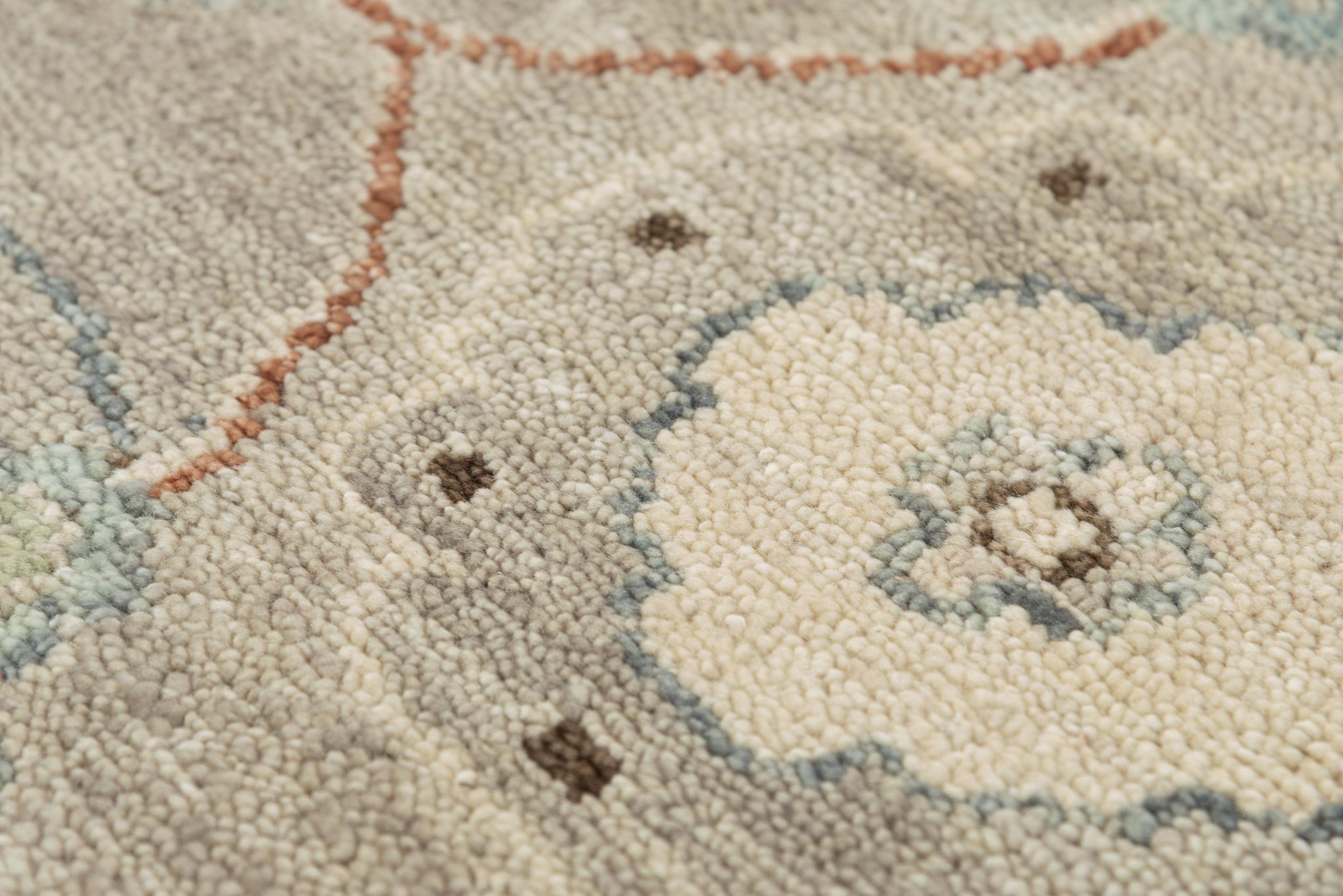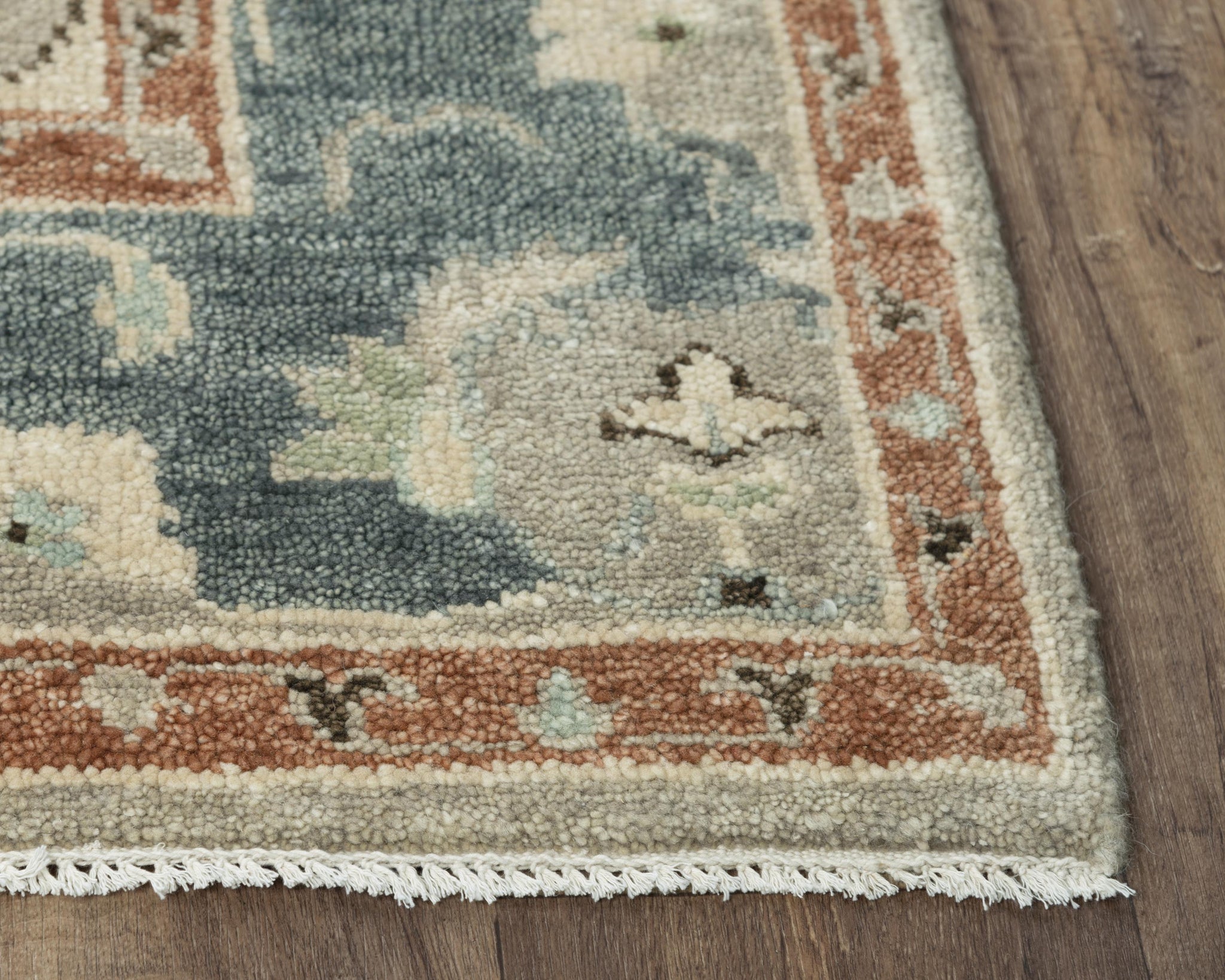 For hundreds of years traditional carpets have been fashioned and made like the Rizzy Home Belmont Light Blue Classical Rug. Hand-spun with 100-percent New Zealand wool, repeatedly hand-washed for ideal softness, the rug is hand-knotted and hand-surged. Short fringe adorns two of the edges. Rust brown, ivory, blue, and aged green florals scroll across a light grey field, sprinkled with sparks of dark brown and mint green bordered in light blue.