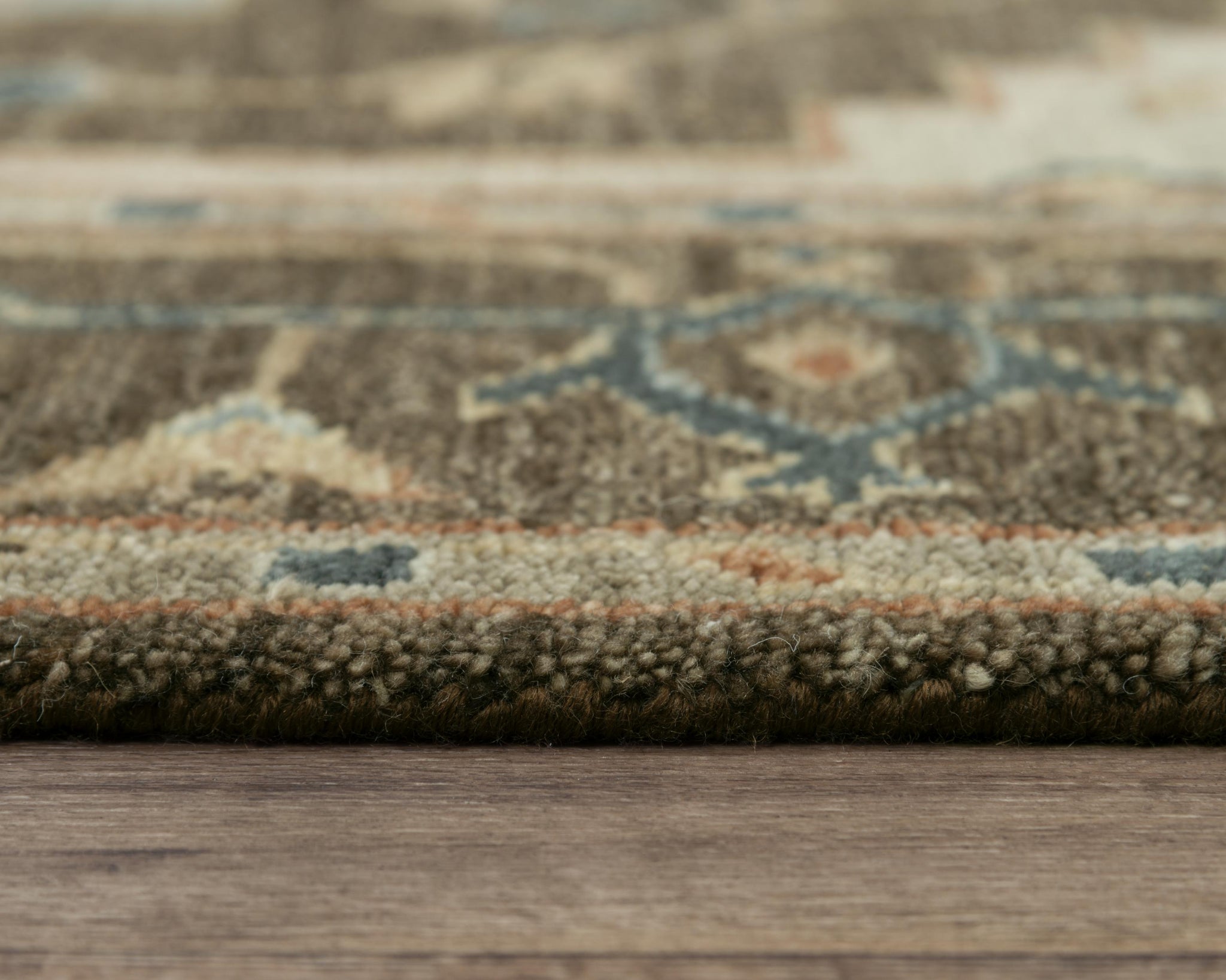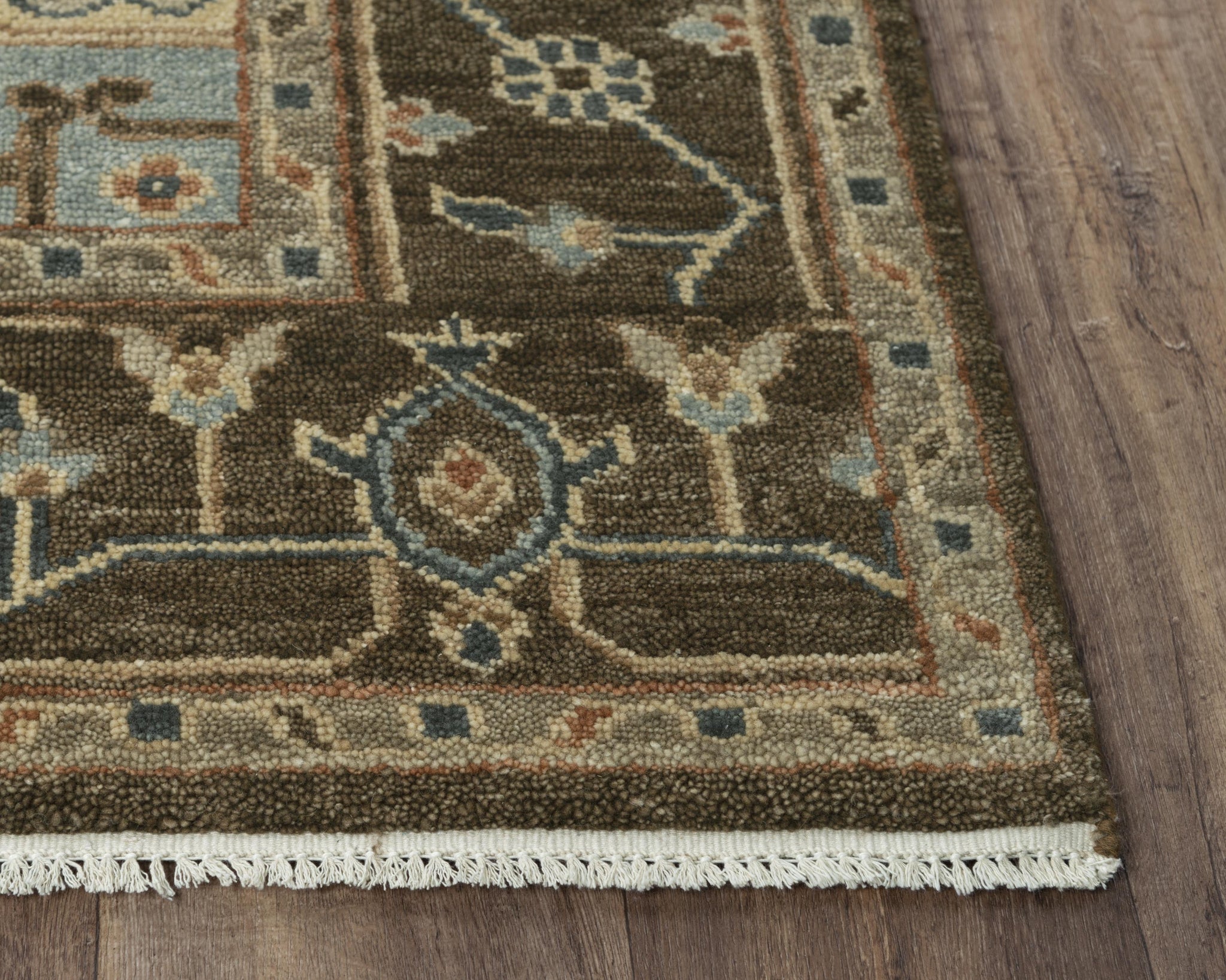 If you enjoy the traditional look of high quality workmanship this Rizzy Home Belmont Neutral Dark Brown Classical Rug is for you. Hand-knotted from hand-spun New Zealand wool. Following practices for such artwork, the rug is then processed through several hand-washings and hand-surged. At last it is finished with beautiful fringe on two edges. Neutral dark brown is beautifully contrasted by accents in light blue, ivory, beige, dark blue, with sprinklings of taupe to complete your room in traditional style décor.