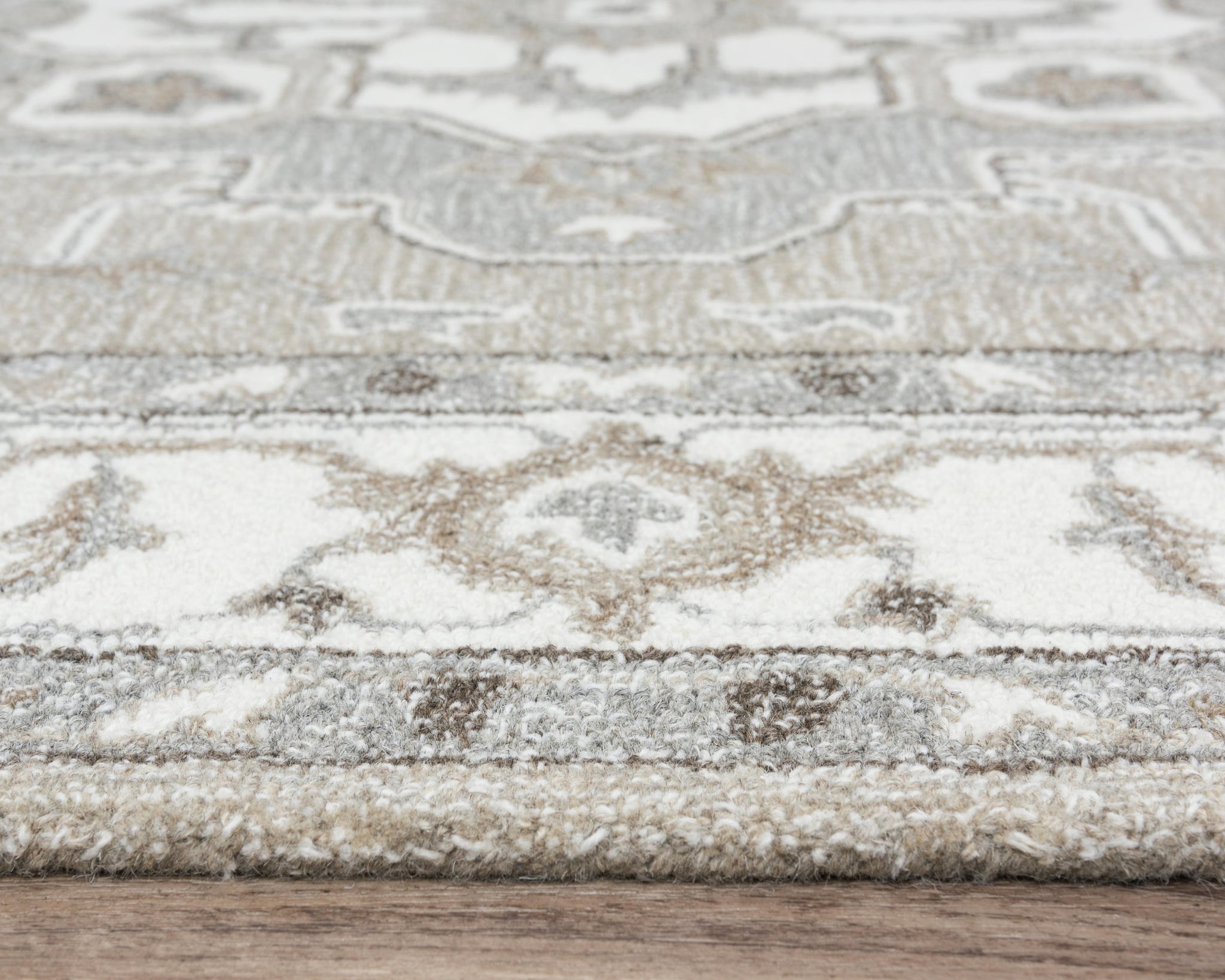 A contemporary, yet traditional pattern in light shades of beige and grey, this soft Conley Persian-style Rug from Alora Decor is made with 100-percent wool and will create a beautiful style in any room in your home. Bring the luxury home with this beautiful rug.