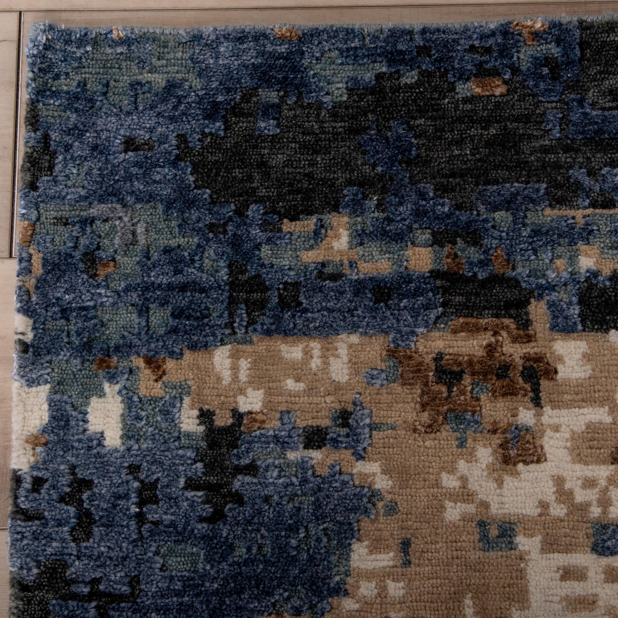 Artisanal craftsmanship meets contemporary elegance in this stunning rug from Rizzy Home's prestigious Evolution Collection. Crafted with meticulous care and attention to every detail, this rug is more than just a floor covering; it's an elevated piece of art to anchor any refined space with unrivaled beauty and sophistication. Hand-knotted, this rug features a luxurious cut pile crafted from a blend of Durapoly and wool, ensuring both durability and indulgent softness underfoot. Adorned in a rich colorful palette of teal, grey, black, brown, beige, and ivory, this rug boasts beautiful updated fashion colors that breathe life into any room. Its abstract design adds a touch of modernity and flair, making it the perfect anchoring centerpiece for any refined décor or chic ultramodern interior.