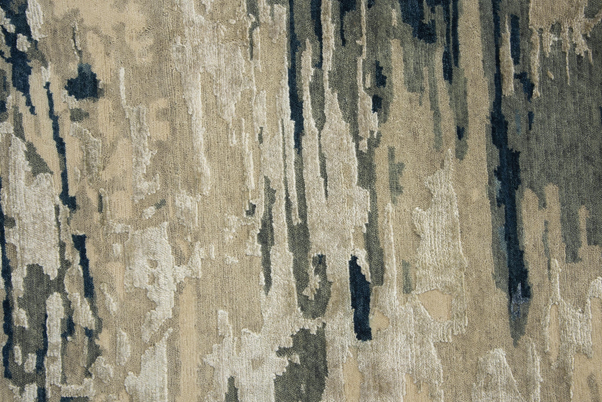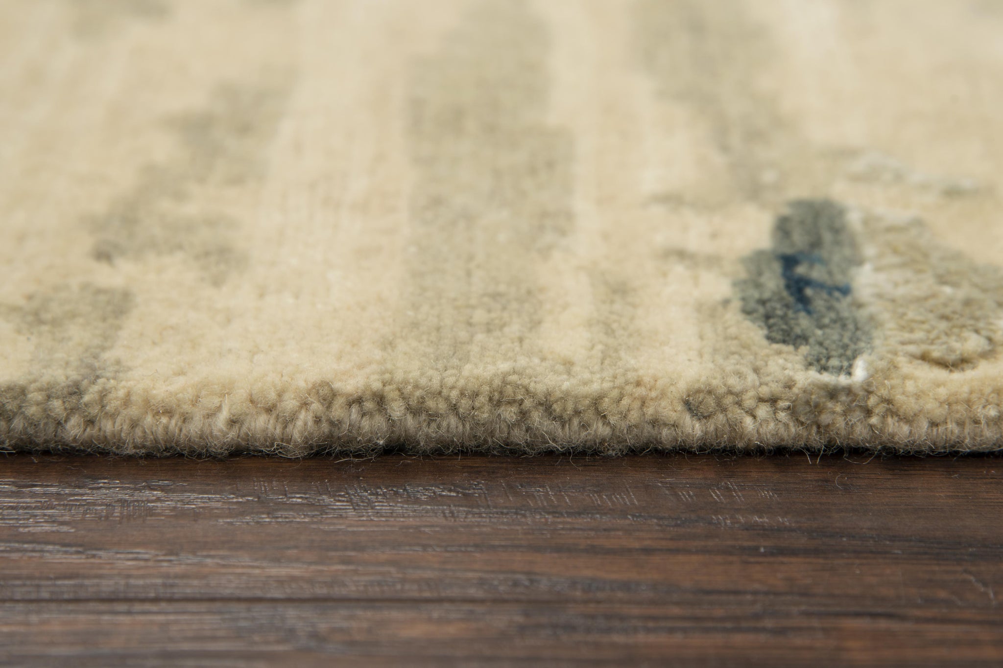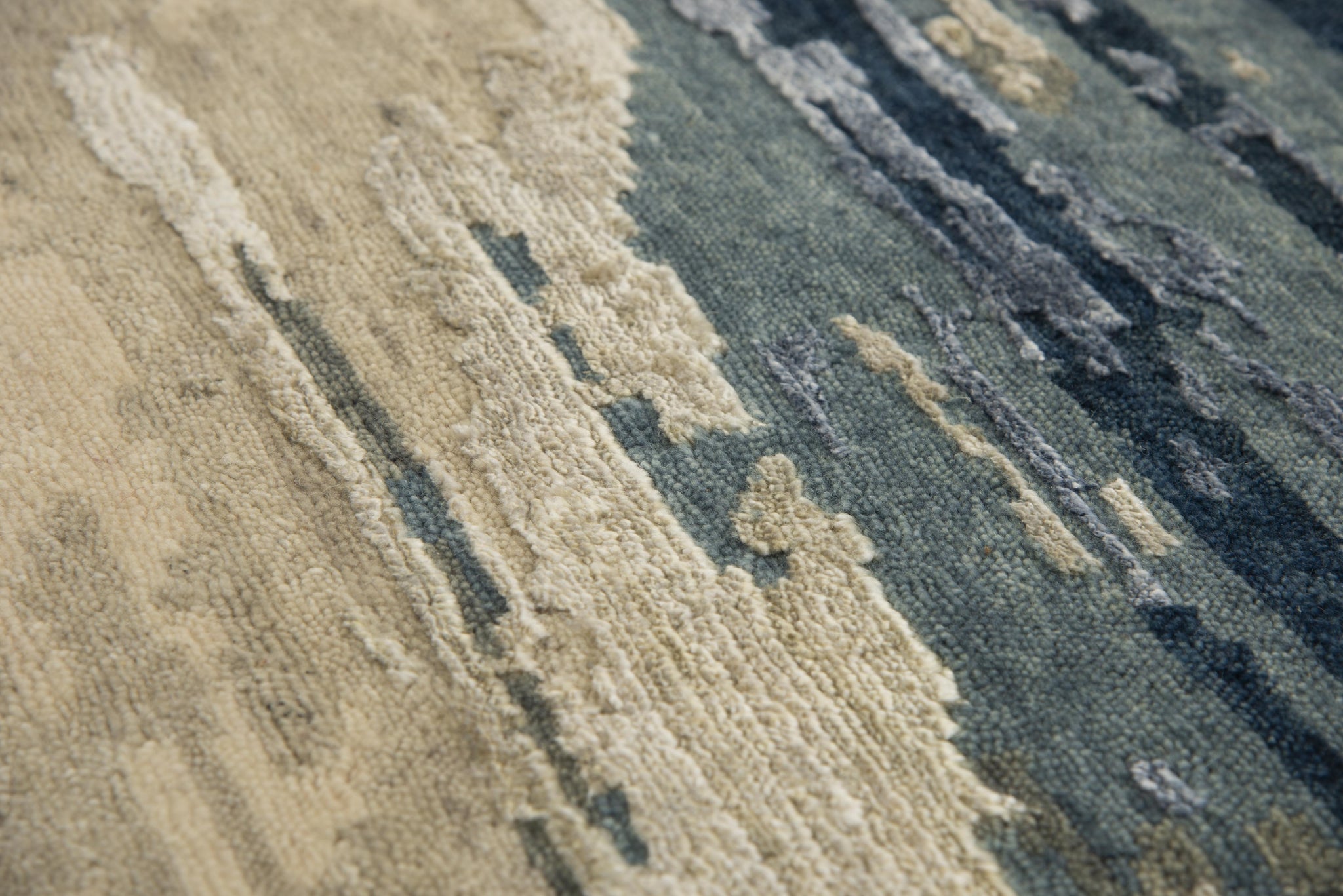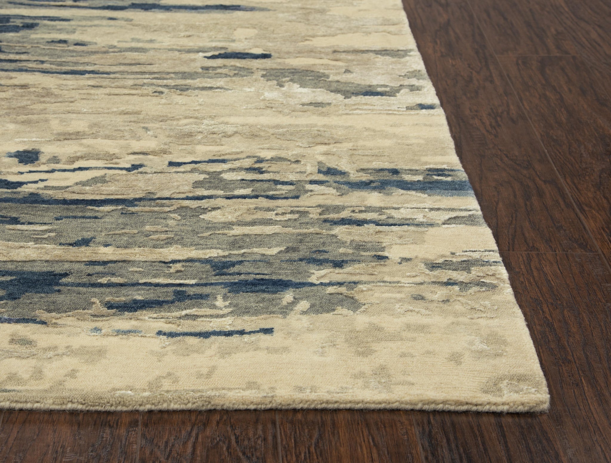 The Finesse Abstract Rug by Rizzy Home boasts sublime striations of blues and greys against a beige background, crafted with expert artisan techniques. The multi-level pile is created through hand-carving and knotting a blend of warm wool and shimmering Tencel fibers, resulting in a visually captivating texture. This rug is the perfect addition to a transitional or modern style home décor.