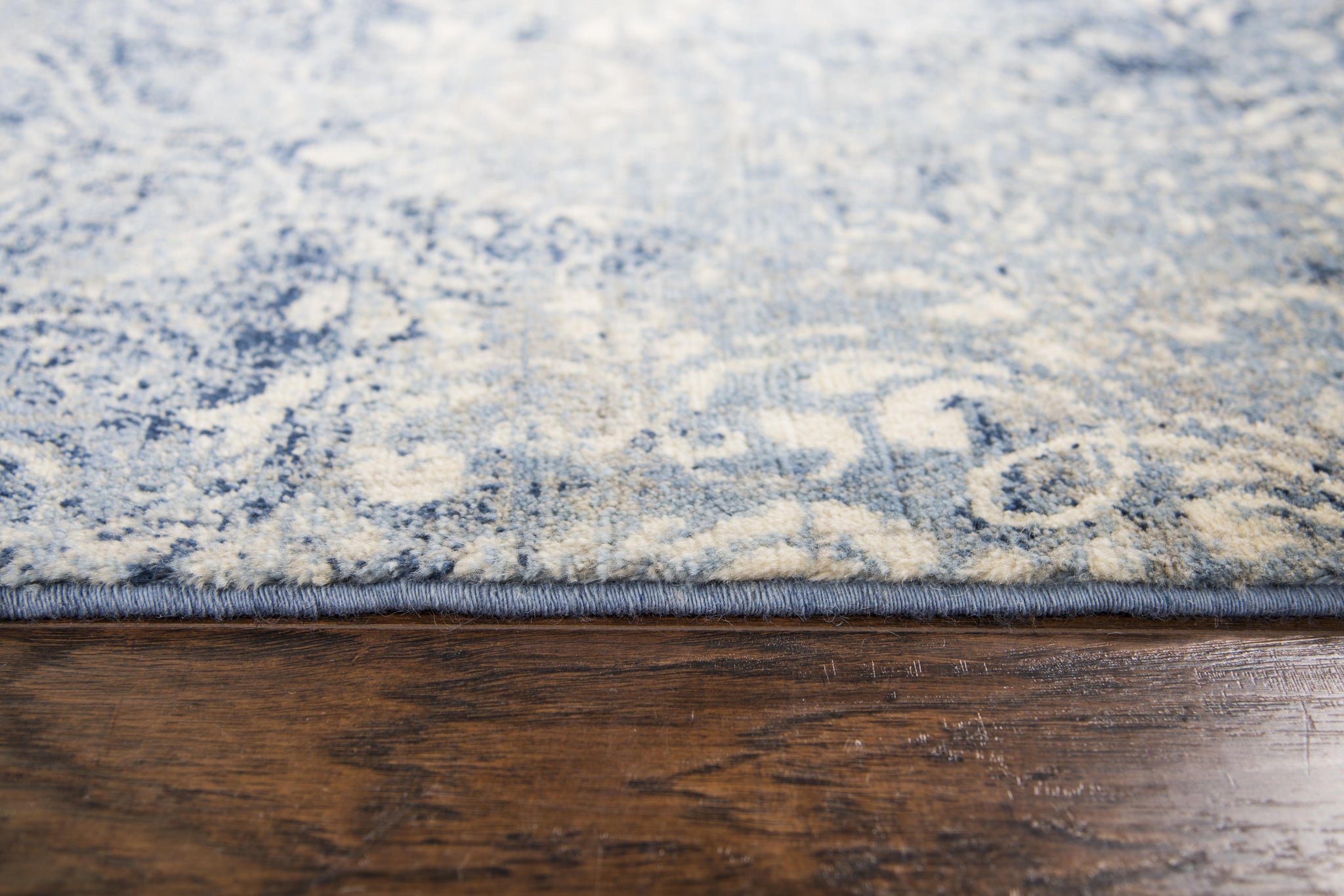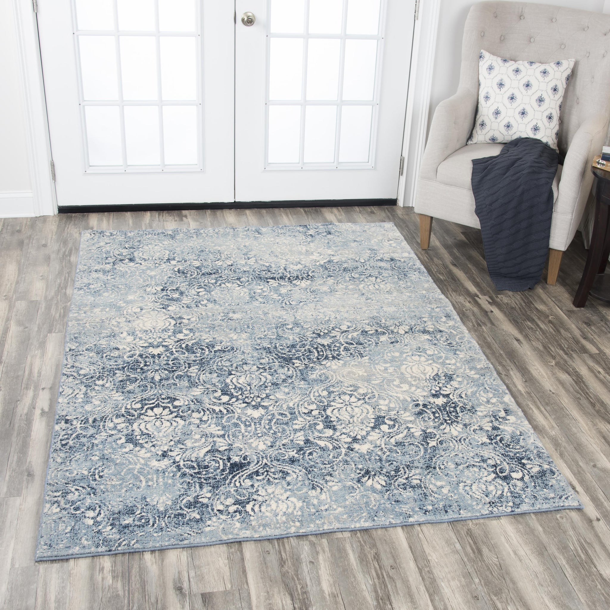 Shades of blue and ivory give this Rizzy Home Gossamer Blue Damask Rug a distressed look that will make the perfect backdrop for any room. Made of 100-percent New Zealand wool, this rug has a transitional, contemporary style and a bound edge. The beautiful damask design will complement your home. This power-loomed rug is hand-washed and hand-finished, perfect for your living or dining room or even bedroom.