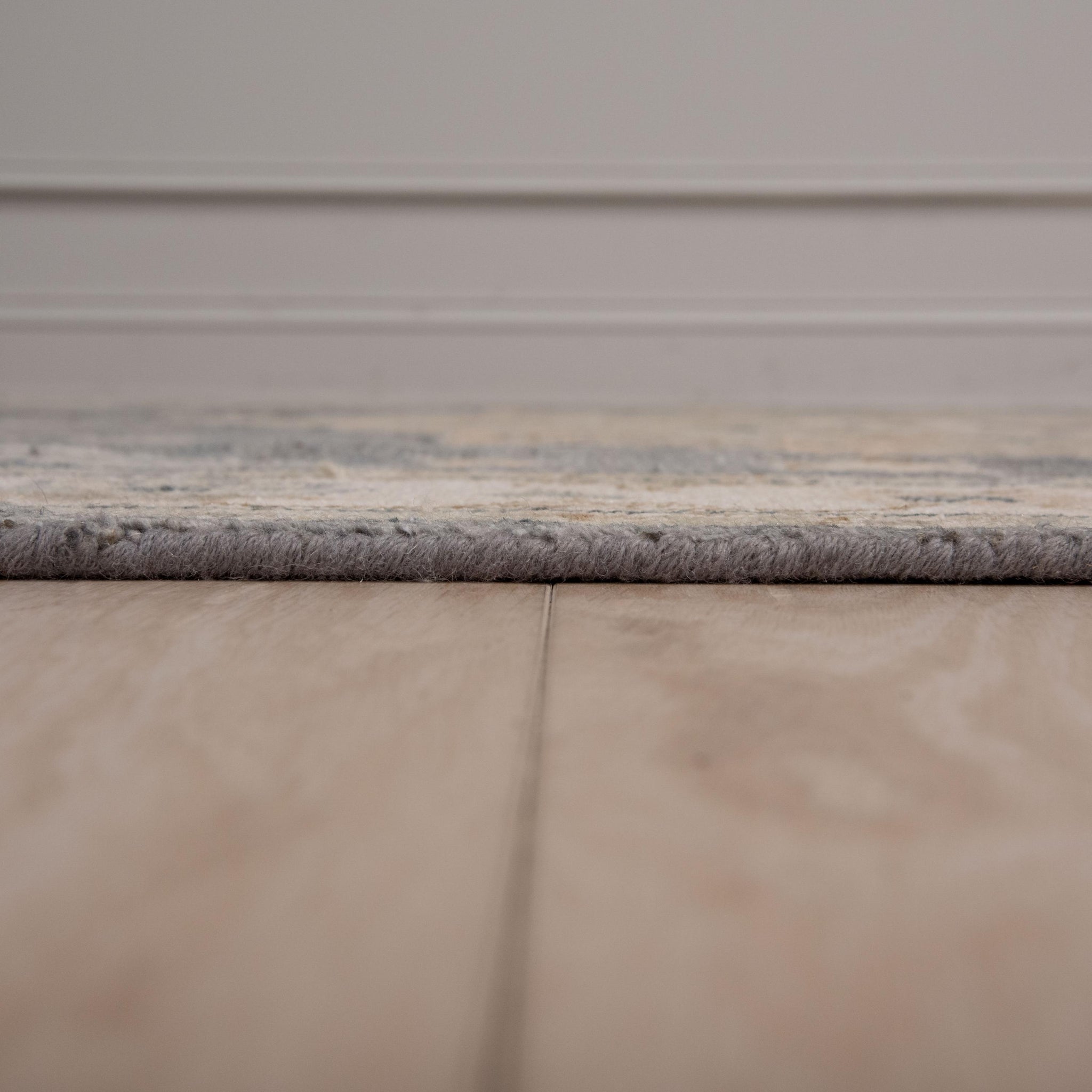 Transform your home with this stunning and graceful Hallmark Collection rug from Rizzy Home. Its elegant design, sophisticated color palette, and rich textures add a touch of charm and refinement to any room, making it the perfect statement piece for those who appreciate the finer things in life. Hand-knotted with meticulous precision, this rug exudes an air of elegance and distinguished allure. Crafted from sumptuous 100% wool and featuring a luscious cut pile, it offers a tactile experience like no other, enveloping your feet in luxurious comfort with every step. With no backing, it seamlessly integrates into your décor, allowing its rich colors and intricate design to take center stage. Adorned in a palette of shades of grey, beige, brown and black, this rug boasts a mesmerizing medallion pattern bordered by timeless motifs, bridging the gap between traditional and contemporary allure. Each rug in the Hallmark Collection is a testament to centuries-old construction techniques, hand-finished and hand surged in India by skilled artisans.