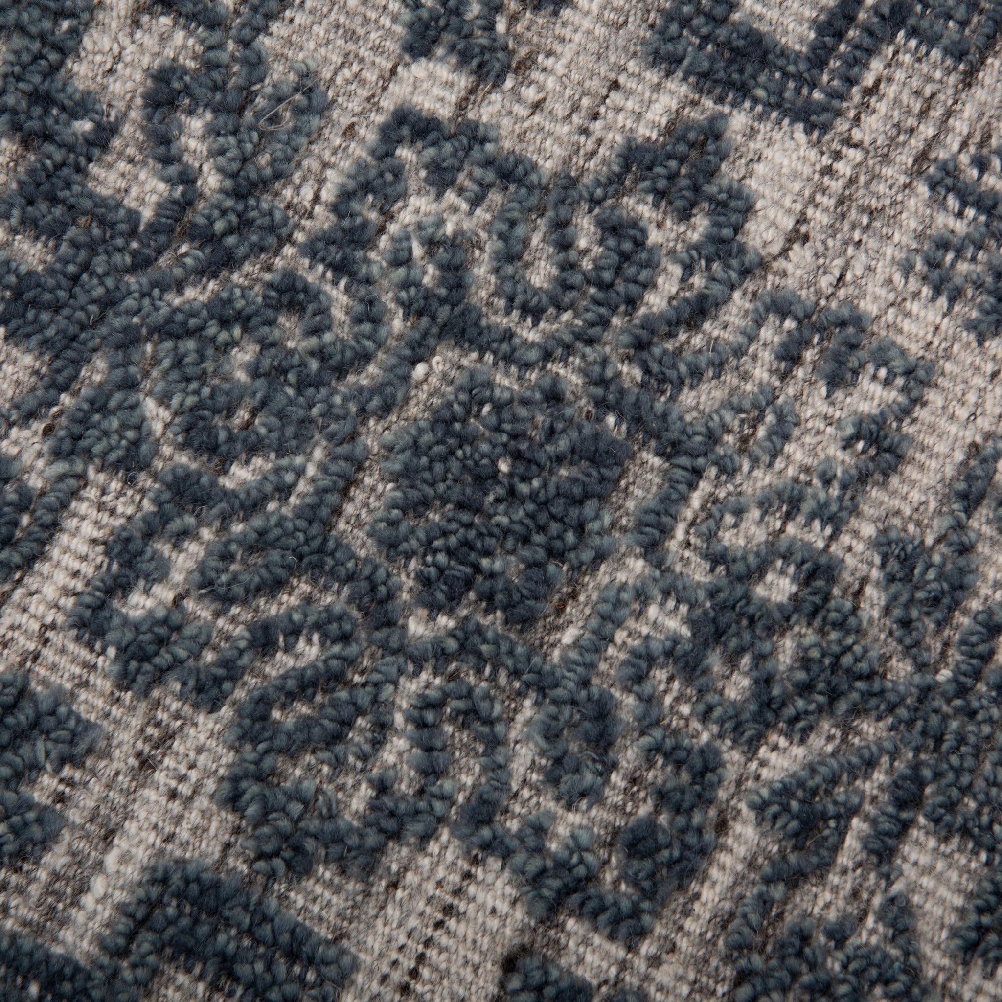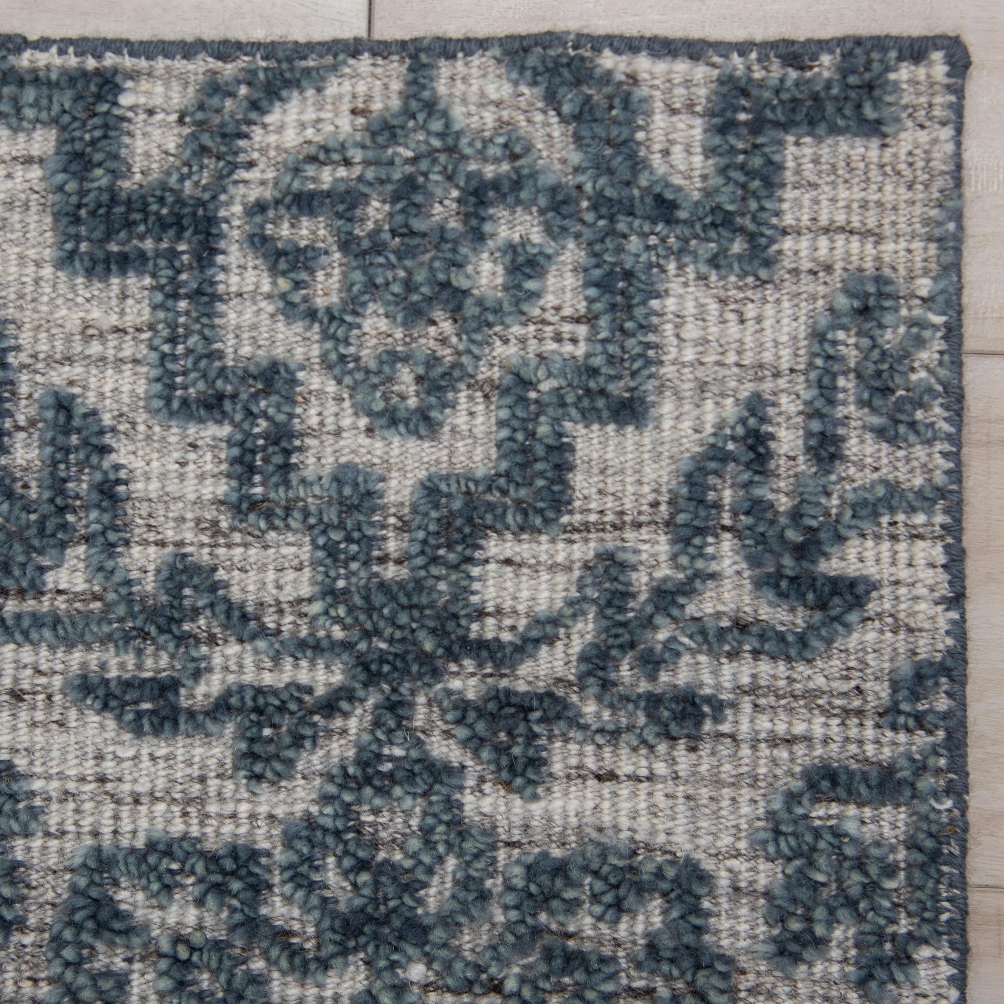 Add some timeless sophistication to any interior with this Rizzy Home Coquette Collection rug. Hand-knotted from 100% wool with a luxurious cut pile, this rug combines luxurious comfort with exceptional durability in a capitivating geometric diamond design in shades of navy blue, slate gray and ivory, exuding both traditional charm and heightened elegance. Crafted in India using centuries-old techniques, each rug is a masterpiece of artisanal skill with incredible attention to the smallest detail. Hand-finished and hand surged for a flawless finish, it exemplifies understated elegance and refined beauty. This rug makes a perfect statement piece in any room to build your décor ensemble around. Whether in a living room, bedroom, or study, its gorgeous construction and beautiful shades of thunderstorm blue and slate gray create a serene ambiance that complements any space effortlessly.