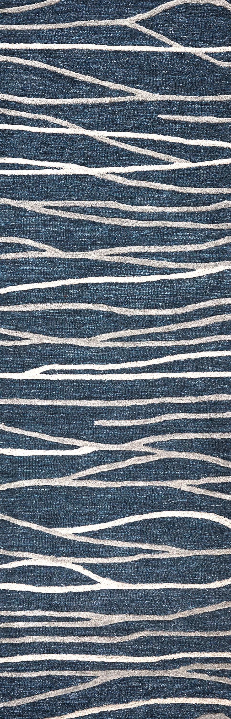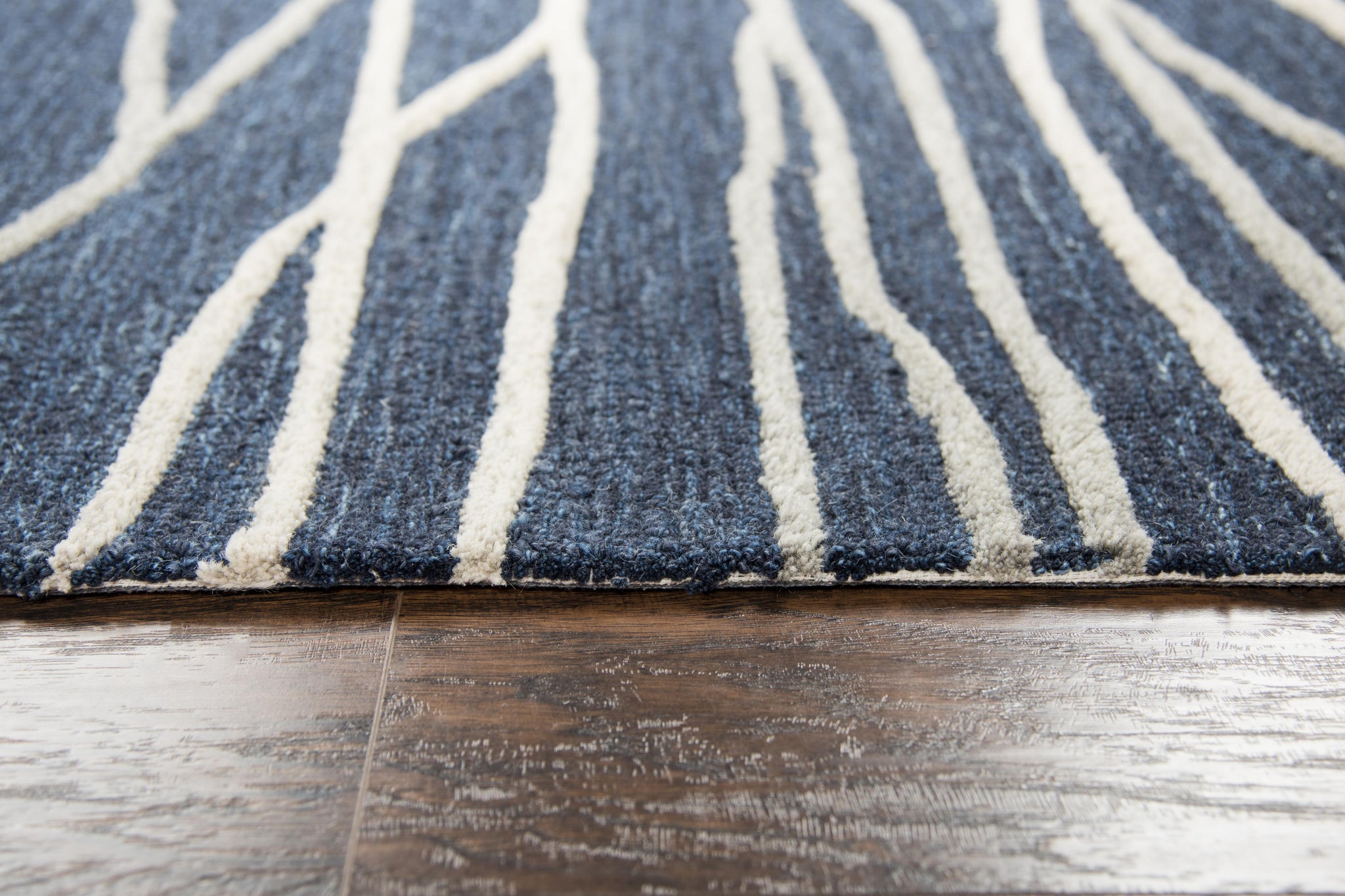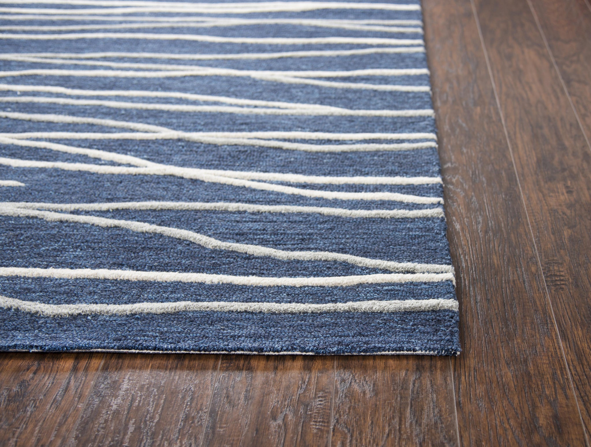 Make your neutral decor pop with the Rizzy Home Idyllic Navy Lines Wool Rug. With 100-percent wool, tufted by hand, this piece makes a lovely focal point anchoring your room. The contemporary wavy line design is created in natural ivory and grey longer cut pile on a navy blue field of shorter loops. The edge is clean and modern, perfect for any space in your home.