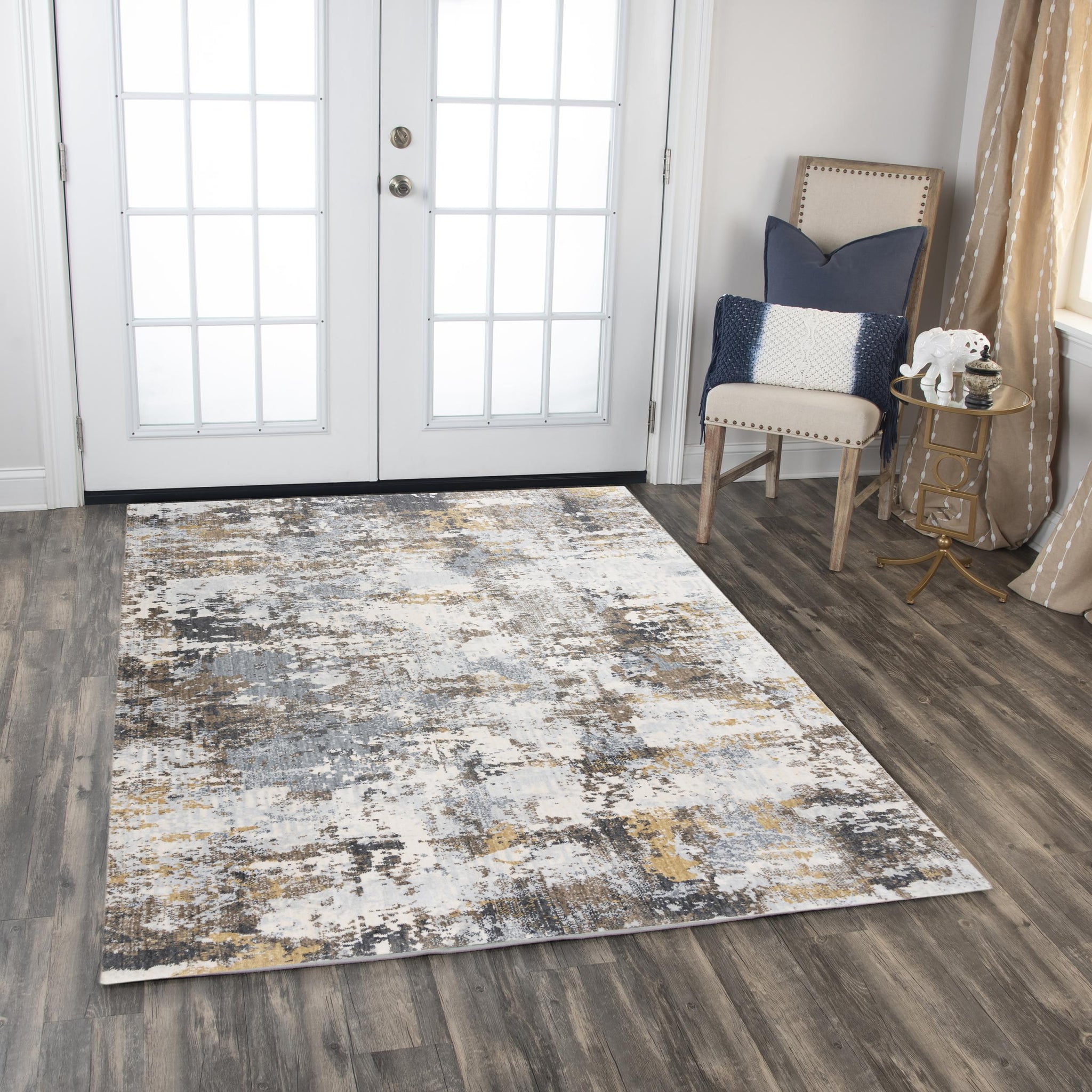 This area rug from Rizzy Home’s Jasper Collection boasts an artistically inspired abstract design in bold hues of ivory, white, sky blue, honey gold and earth brown. Its hybrid recycled polyester construction make it not only an eco-friendly option, but also ensure that it’s easy to clean and ultra-durable for highly traveled areas. The earth toned palette and ultramodern style of this rug can support an array of interior décor motifs and accents for a truly transitional rug that's timeless.