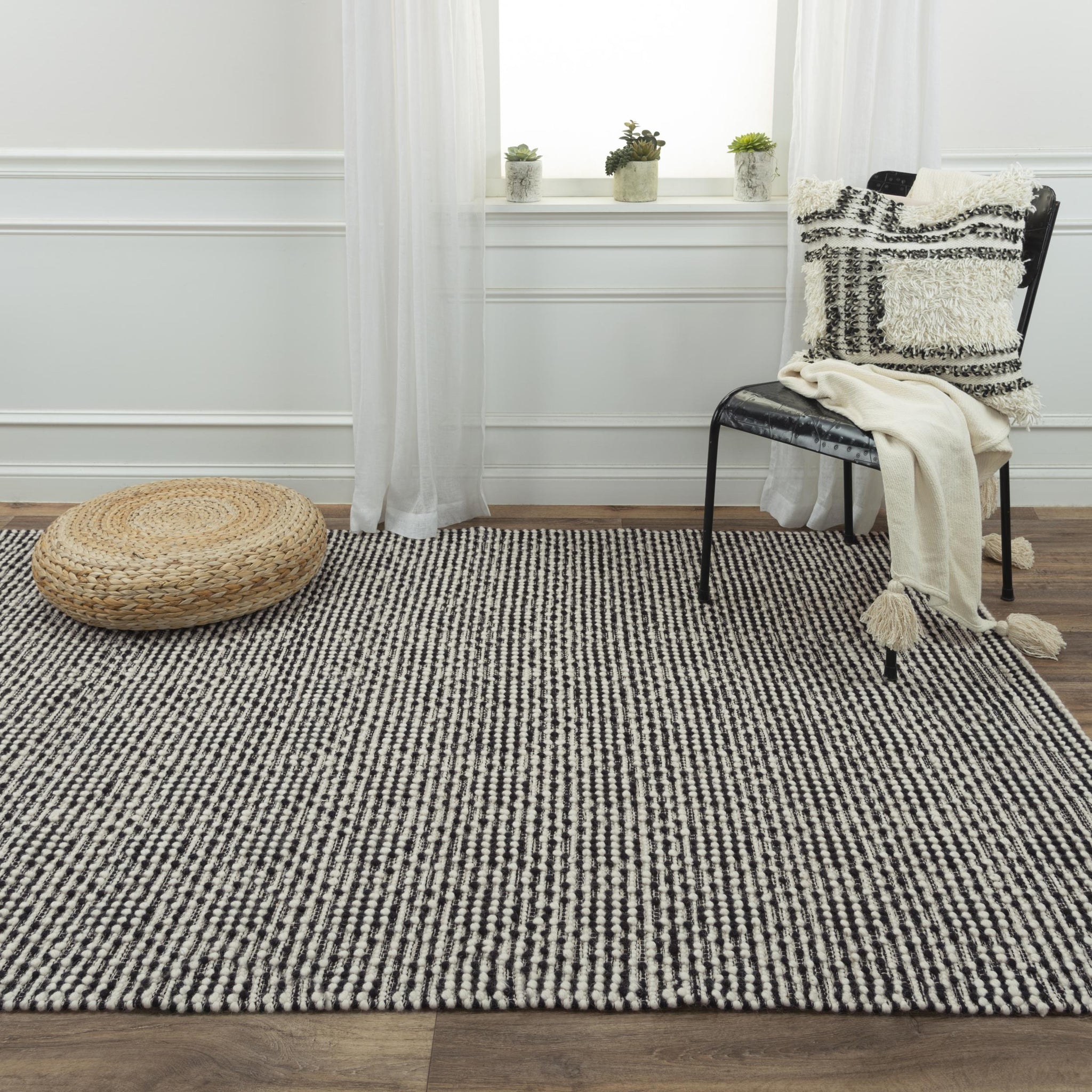 The black geometric pattern of this Alora Décor Kerala Rug exemplifies a bold and timeless modern/ bohemian style. The meticulously hand woven, 100-percent jute construction of this piece serves as a beautiful indoor floor covering. Bring nature into your home with this stunning rug.