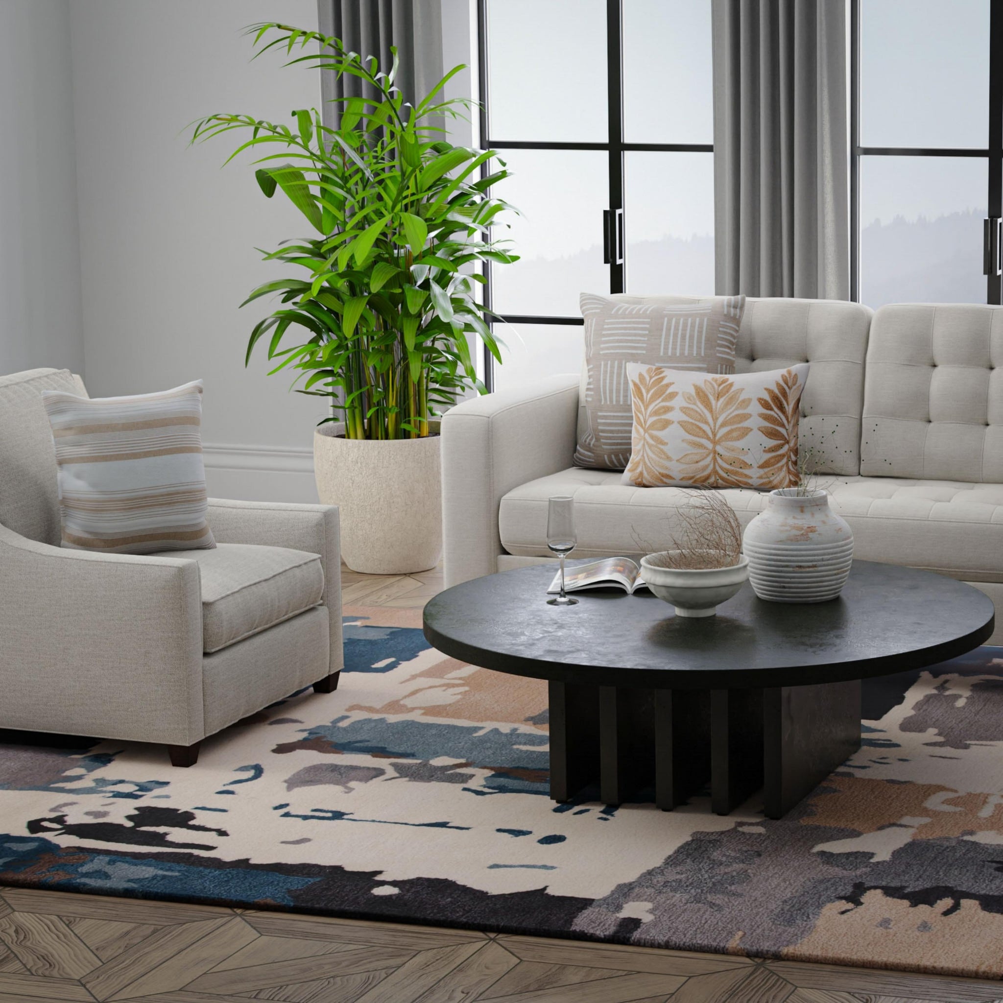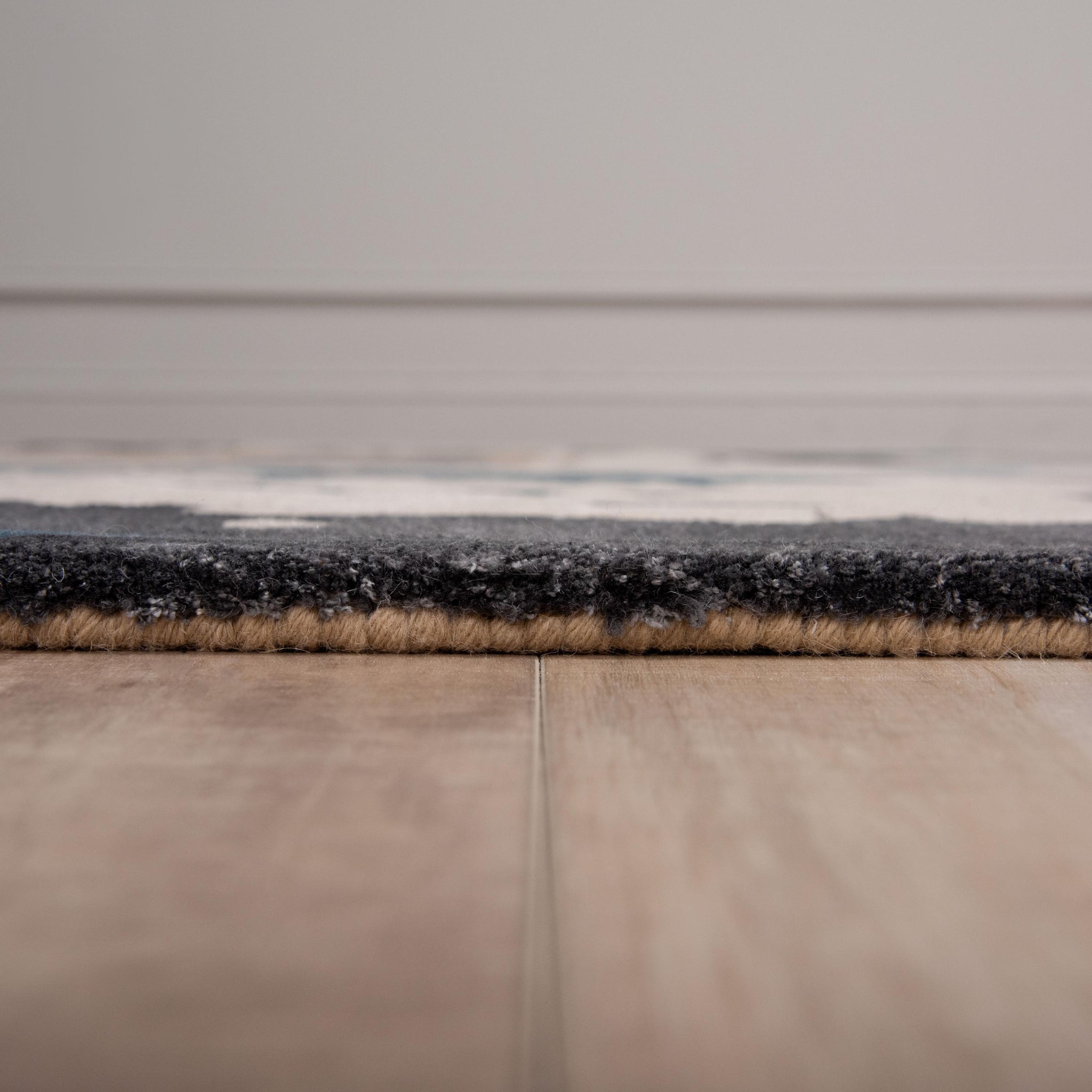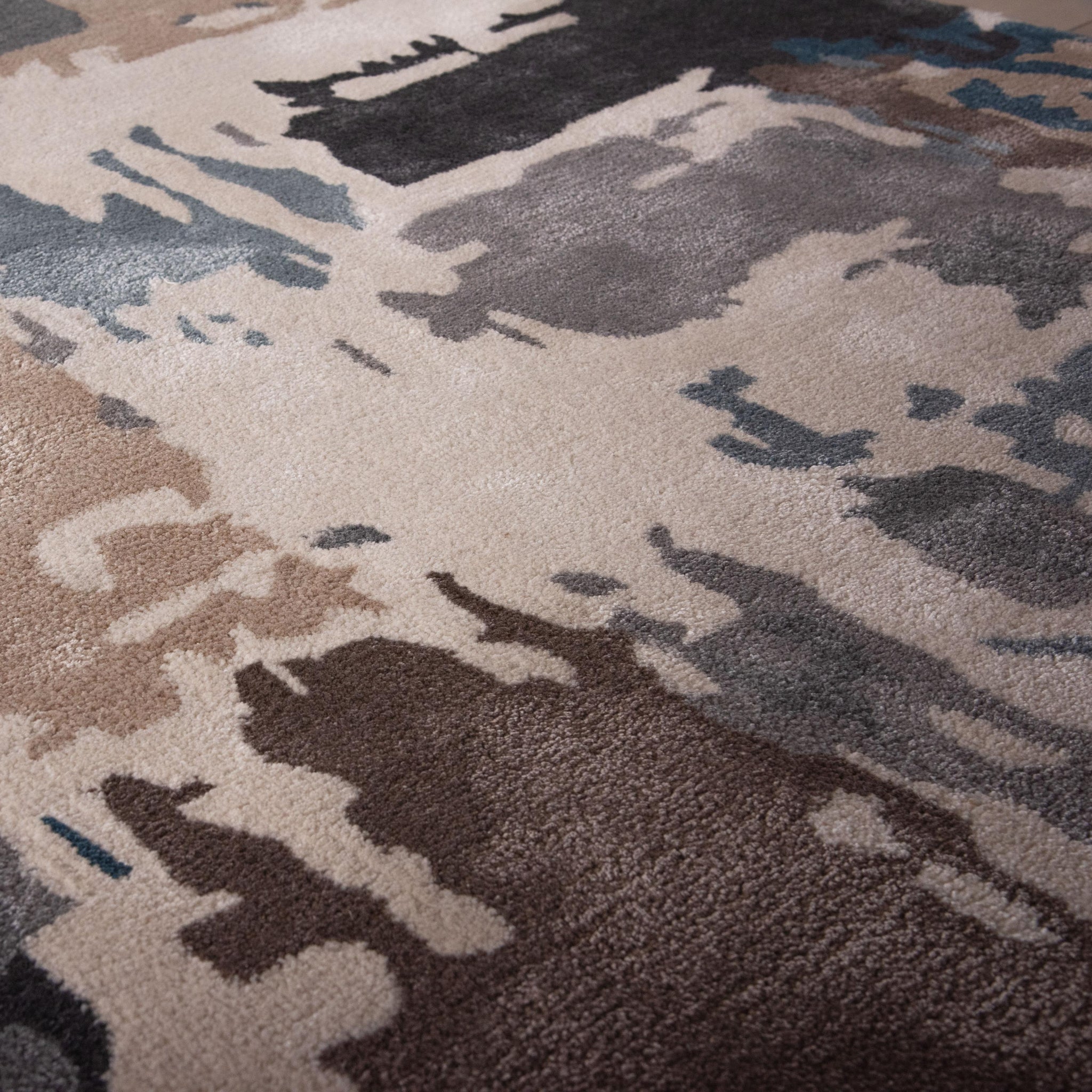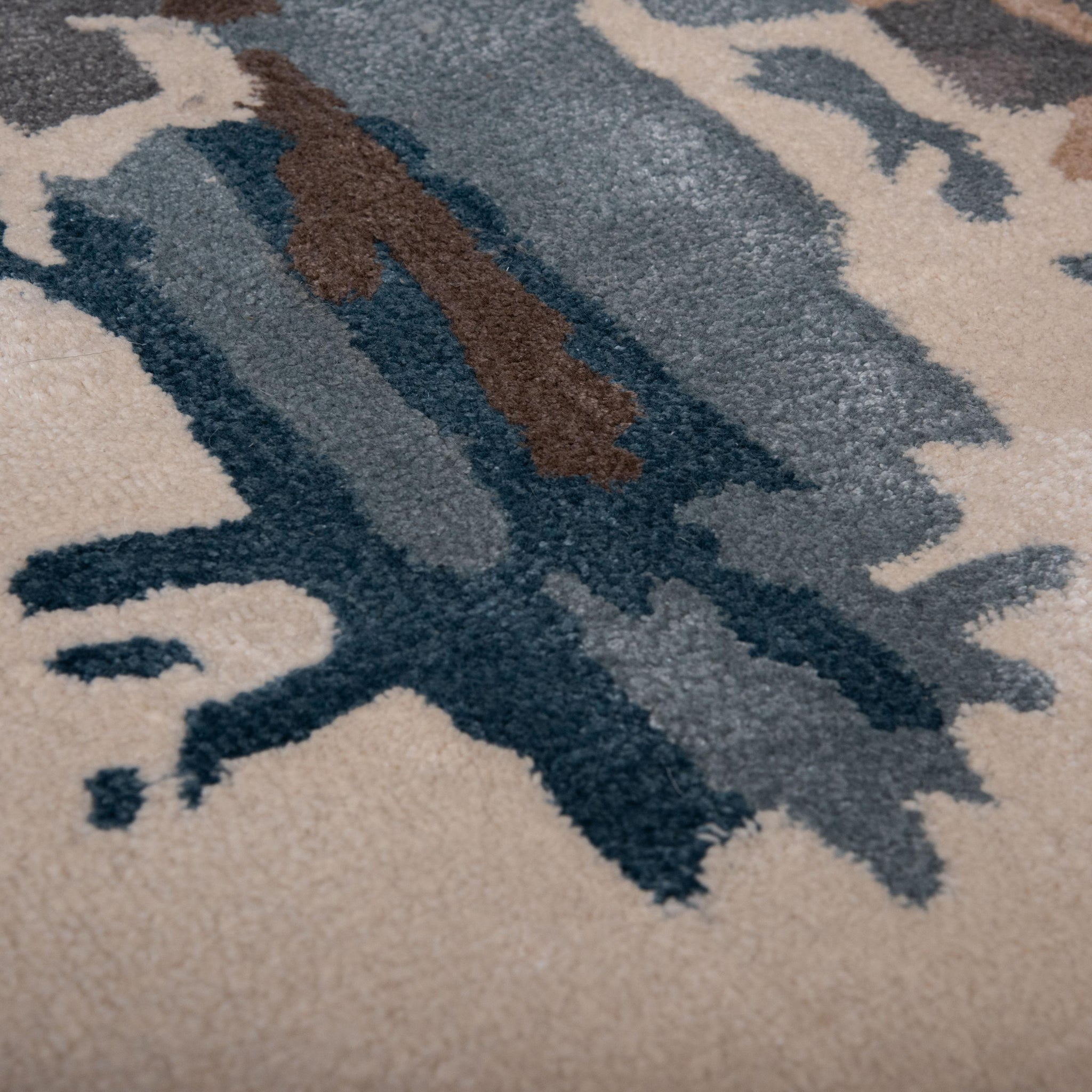 This work of art rug from the Rizzy Home Kinetic Collection is simply captivating. The design is not just a floor covering; it's a true work of art that can anchor any interior style motif with its eclectic charm. Hand-tufted with care, this rug features a luxurious cut pile crafted from a Durapoly and wool blend, ensuring both durability and supreme softness underfoot. Its ultra-dense construction provides unparalleled quality, while shimmering accents add a touch of subtle sophistication. In a striking colorway of blue, dark teal, grey, charcoal, brown, beige, and ivory, this rug boasts an incredible abstract design that exudes modern contemporary flair with artistic influence. Each detail is meticulously hand-serged in India, showcasing unparalleled craftsmanship. Elevate your space with the chic and modern allure of this eclectic statement piece that effortlessly enhances any interior with its beautiful colorway and uniquely designed aesthetic.