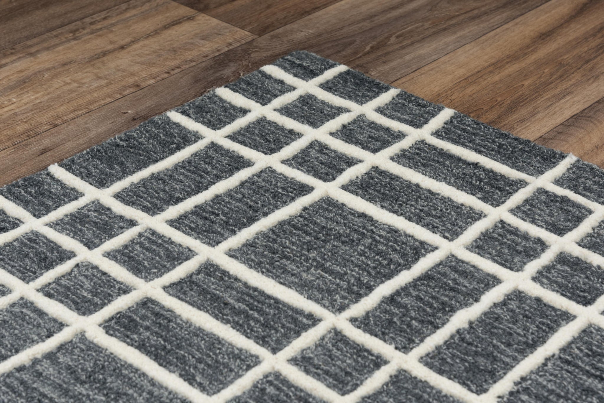 Add some modern elegance to any living space with this sleek, contemporary rug from the Rizzy Home Lofton Collection. This hand-tufted rug features a luxurious cut and loop pile, meticulously crafted from 100% premium wool and backed with durable cotton canvas for added stability. Rich slate gray color shades bring warmth and depth to any room in beautiful style. The geometric shapes and exclusive design blend ultramodern and transitional styles, creating a gorgeous and simply refined look that will complement any smart décor.