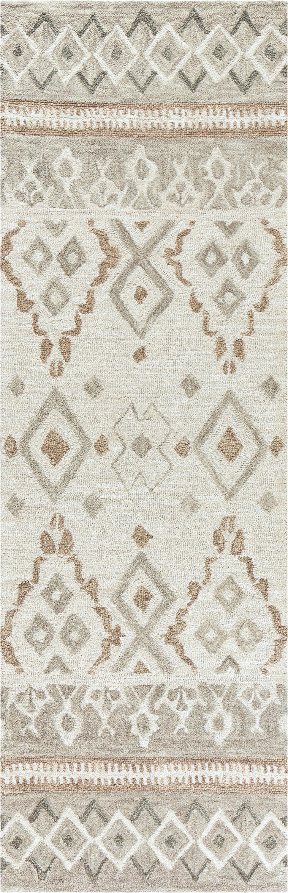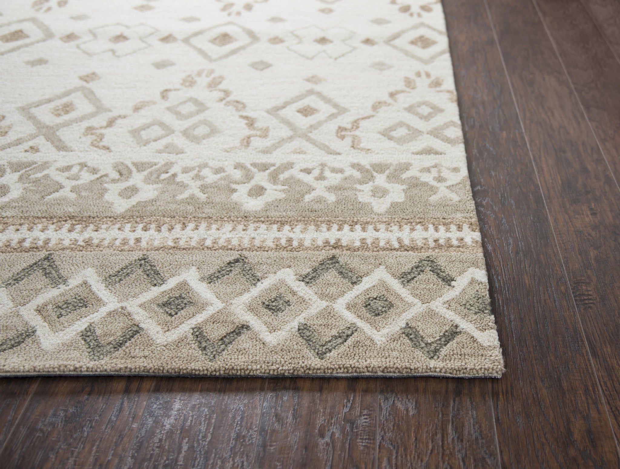 Delightful diamonds and sprightly floral bands are featured in this Rizzy Home Opulent Ivory and Beige Rug. This piece is hand-made using the finest wool that is woven into the unique pattern of this rug. This rug has a cotton back that is stitched to the top allowing the pattern to run completely to the edges for a beautiful finished look -- an ideal choice for your contemporary home or office décor.