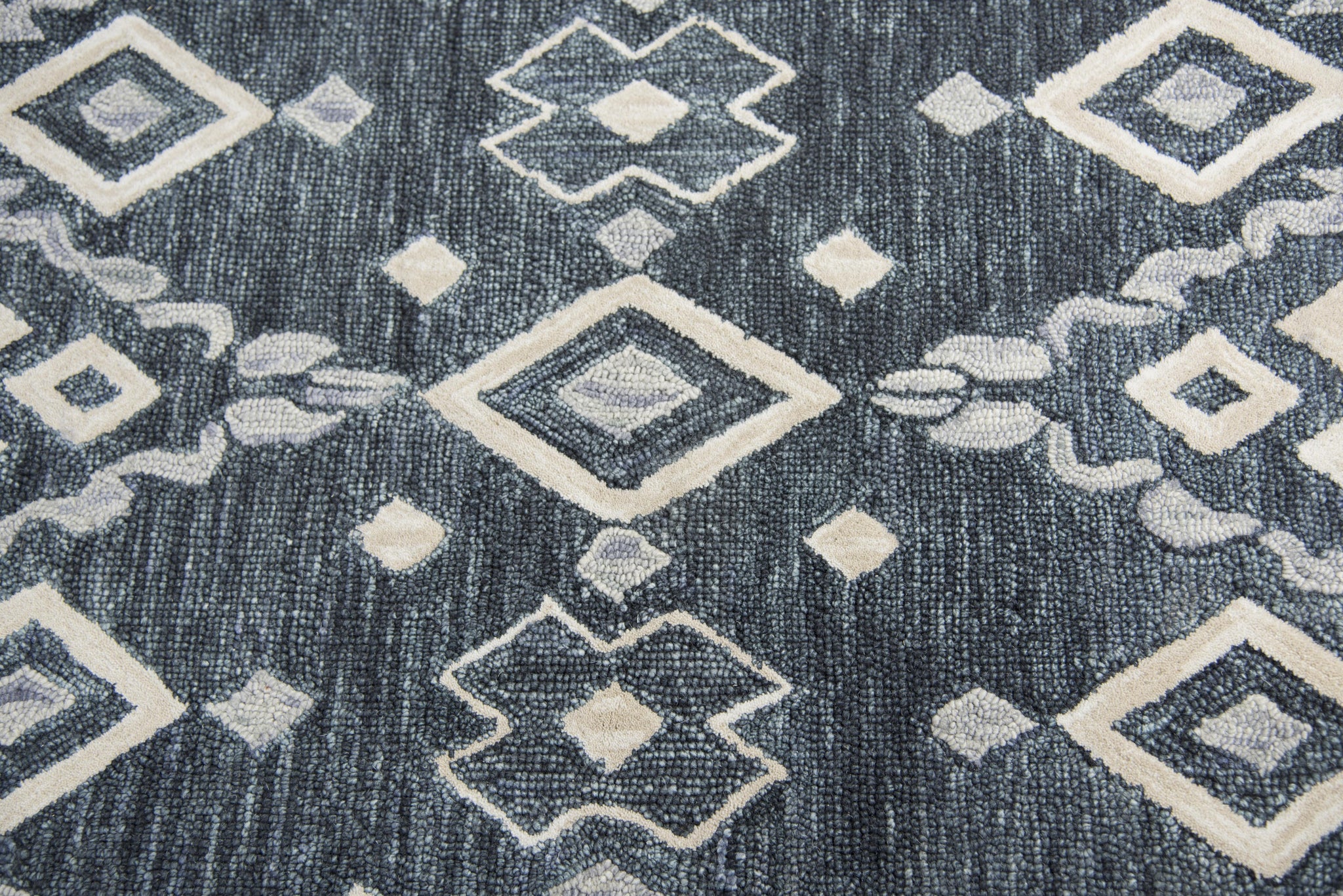The Rizzy Home Opulent Geometric Rug boasts a stunning array of diamonds and delicate floral patterns in its unique design. Handmade from 100% wool, this rug features a single level pile, offering both warmth and durability. The deep indigo blue of the center stripe accentuates the neutral ivory mirrored patterns, making this rug an eye-catching addition to any room in your home.