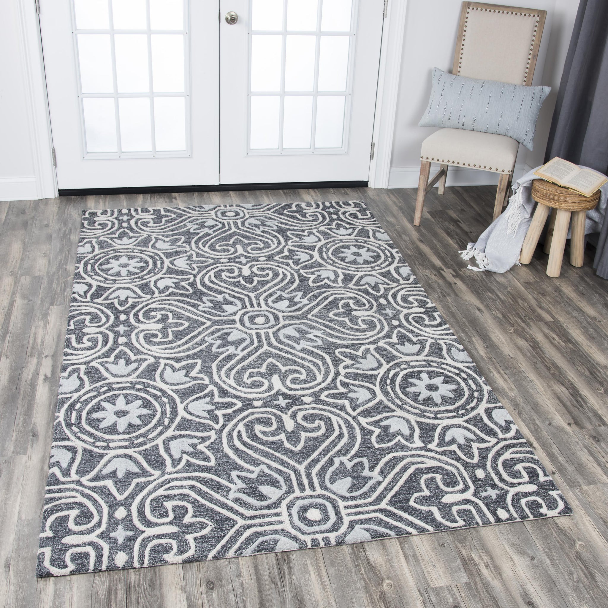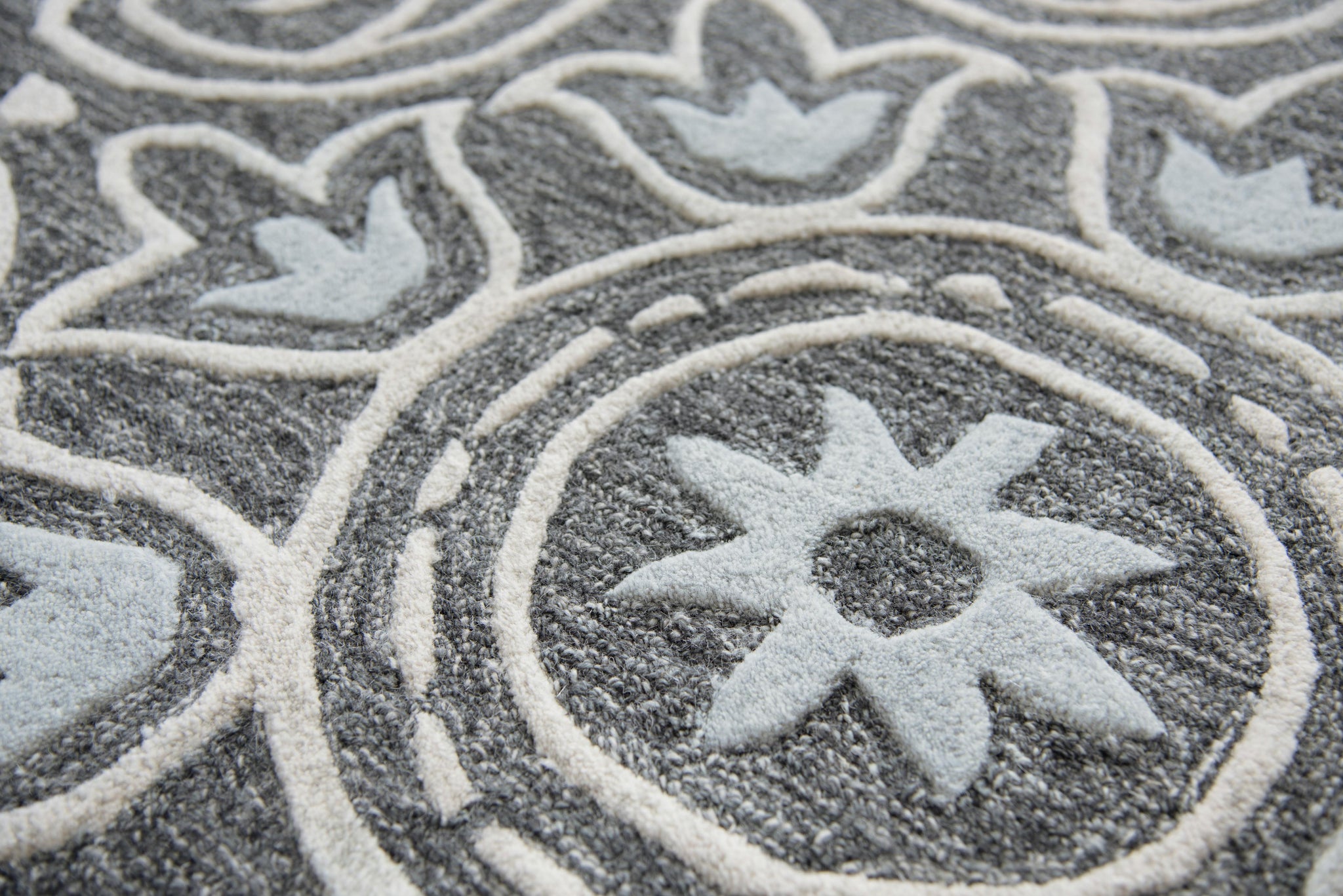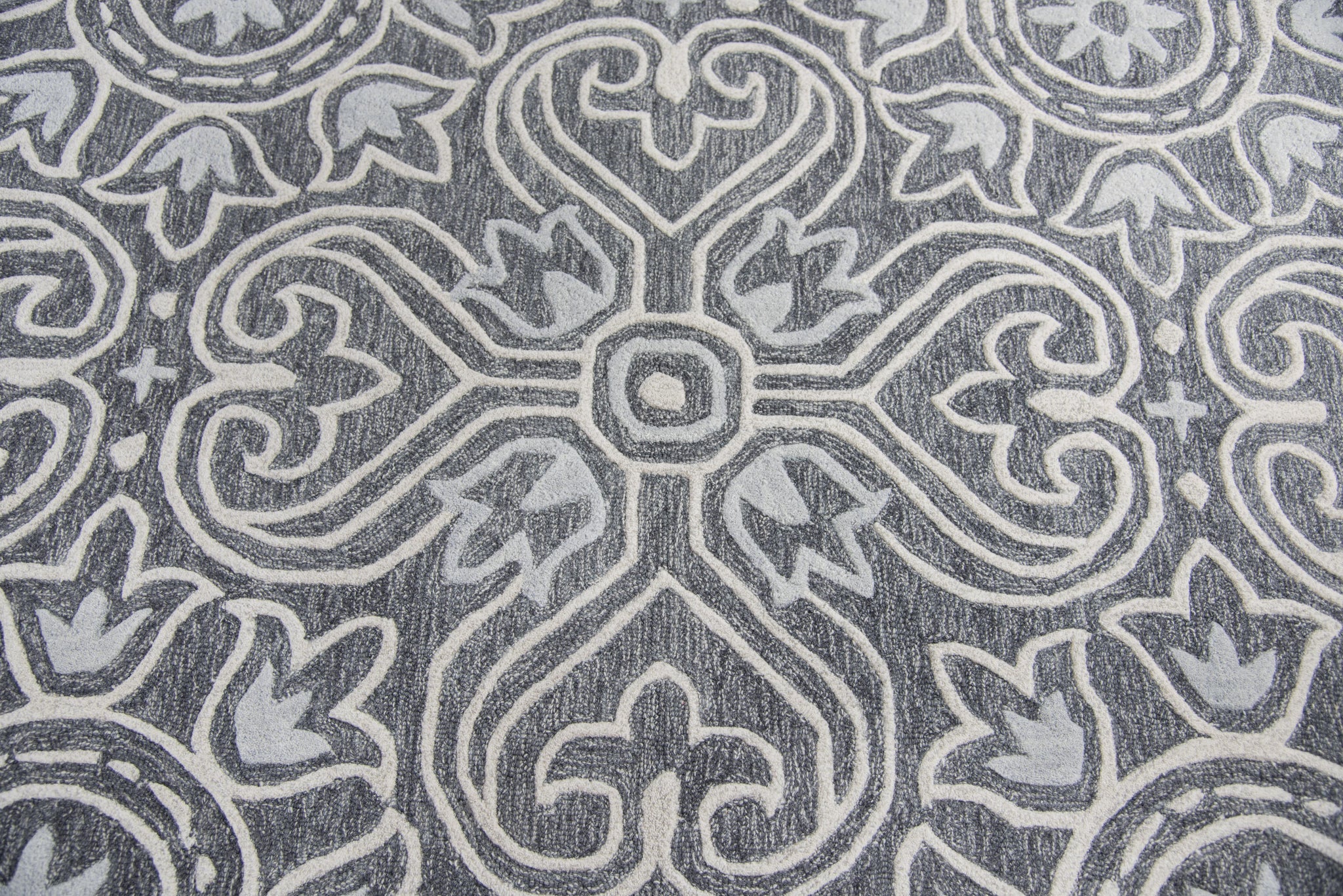 Rizzy Home Opulent has created an intriguing pattern of tulips and fleur de lea medallions in this quality hand made, hand tufted gem. Sure to be a statement in your home for years. The grey and baby blue yarn in 100-percent wool combine different dyeing techniques of trend color and yarn thicknesses, high and low cut piles and loop pile to make a dramatic touch .