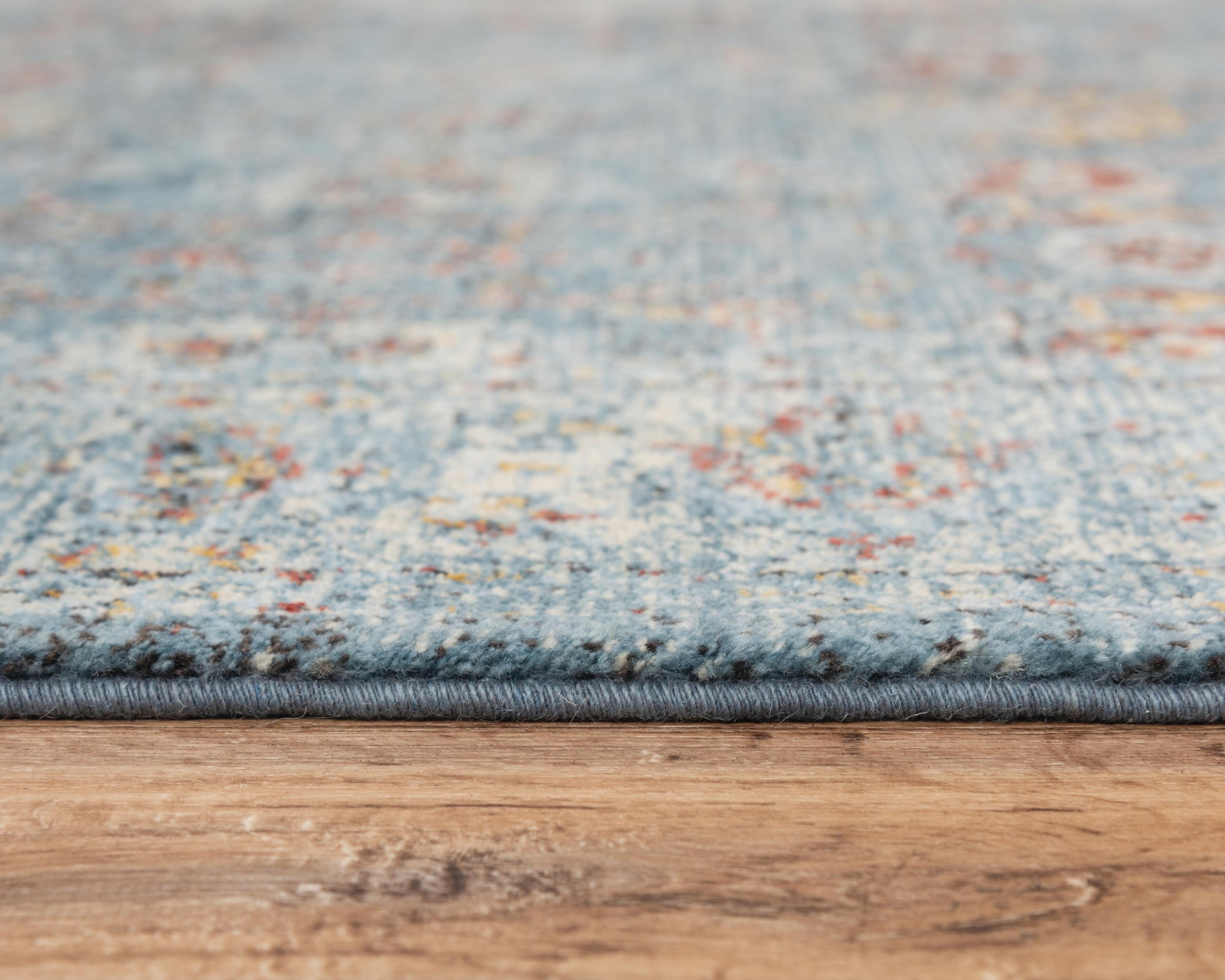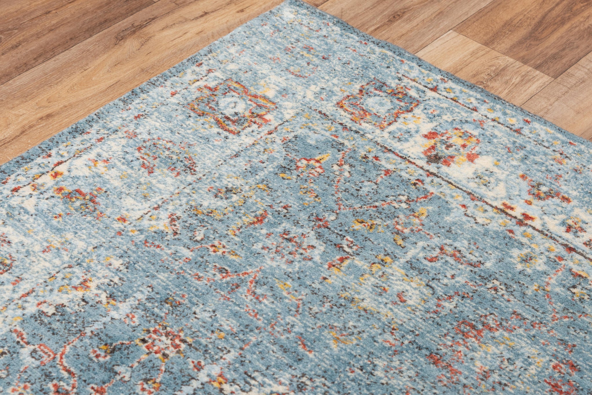 Give a lift to your home with this Rizzy Home Ovation Light Blue, Ivory, and Rust Wool Rug. Faded squares are featured in the center and the defining border with bright splashes of rust colors. A perfect rug for your transitional or rustic style home or office décor, this rug is made of 100-percent New Zealand hand-washed and hand-finished wool.