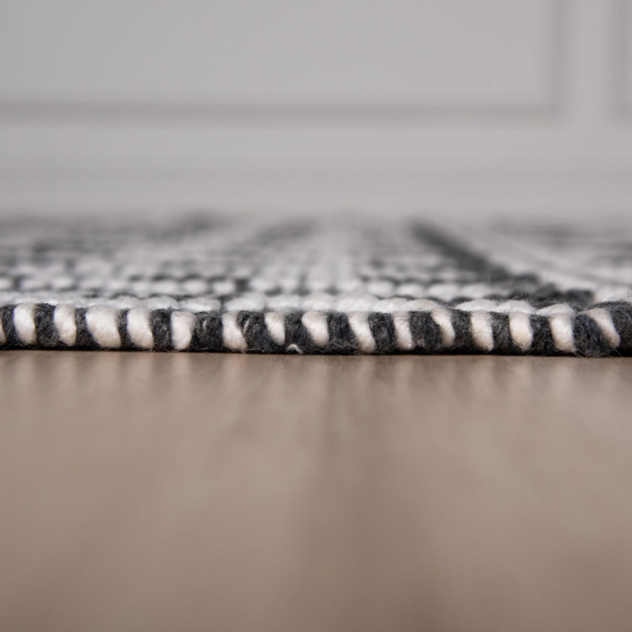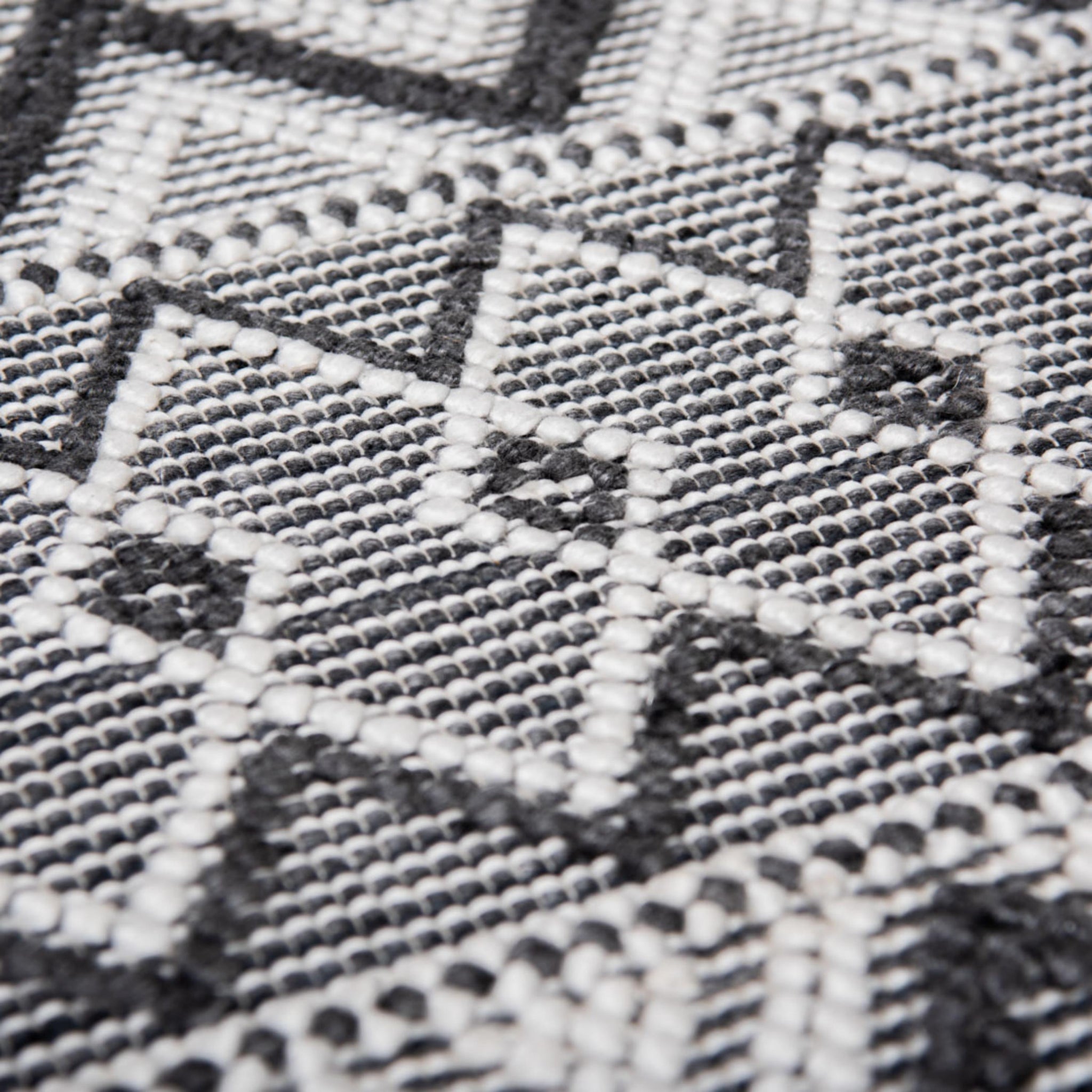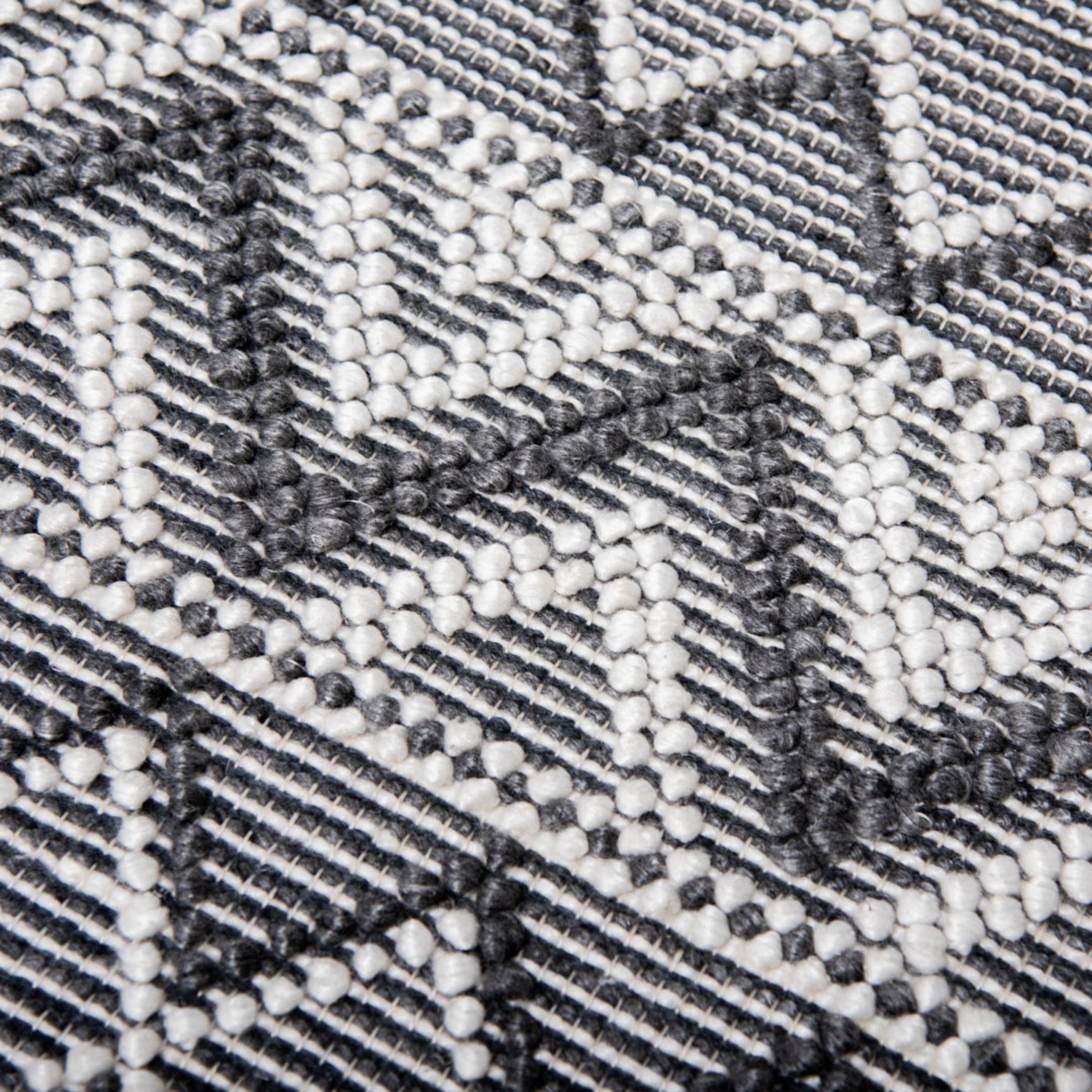 Step into the realm of modern sophistication and eco-conscious style with this rug from Rizzy Home's dynamic Pantera Collection. This striking piece, measuring isn't just a rug, it's a bold fusion of contemporary design and environmental responsibility. Hand-woven with meticulous care, this rug boasts a luxurious loop pile crafted entirely from 100% polyester, embodying both durability and exquisite softness underfoot. With no backing, it offers a plush, comforting embrace, transforming your space into a sanctuary of warmth and relaxation. Adorned in a captivating palette of cool greys, bold black, and soft ivory, this rug exudes an aura of modern sophistication. Its geometric design, featuring eye-catching chevron patterns, adds a dynamic dimension to any room, infusing it with energy and style. More than just a beautiful accent piece, this rug is also crafted with sustainability in mind. Its loop pile construction minimizes waste and environmental impact, ensuring that your home is not only stylish but also earth-friendly. IMPORTANT: While this product is water "resistant" and can tolerate getting wet, it is intended for use in a covered location that may occasionally be exposed to the elements. In the event of water saturation, it is VERY important that this product be lifted/ removed so that the product and surface it covers are allowed to dry completely to prevent the growth of mold