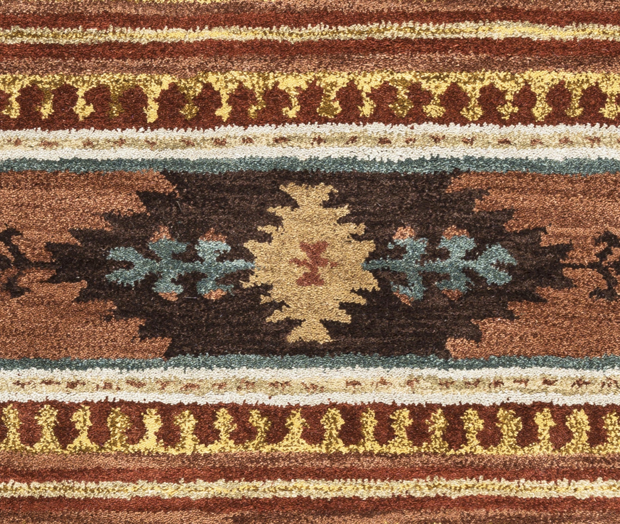 Fashioned after the Wide Ruins style of Navajo rug making, this Rizzy Home Southwest Southwestern Rug with its rich earth tones of brown, rust, tan, ivory, gold, and grey has a very intricate motif that invites the eye and mind to enjoy its beauty. A thick hand-tufted pile of 100-pecent wool makes this rug warm and inviting in any home our office southwestern style décor. Hand-surged edges will ensure your rug will look beautiful for years to come.