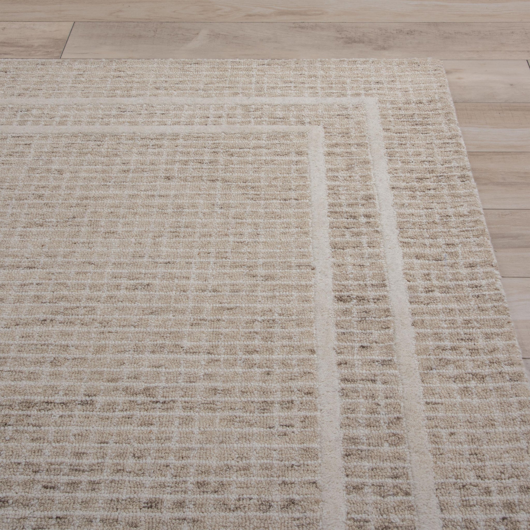 Looking for the perfect blend of modern edge and boho charm? This rug from the Willow collection by Rizzy Home checks all the boxes. Hand-tufted from a soft wool blend, this rug features pot-dyed yarns that create a rich, variegated brushstroke effect, enhancing the checkered pattern with tonal dimension. The taupe base is complemented by beige, and brown hues, framed with an ivory border that adds a crisp, graphic finish. Fully finished by hand, including hand-serged edges, Willow is a timeless blend of comfort, character, and artisanal craftsmanship.