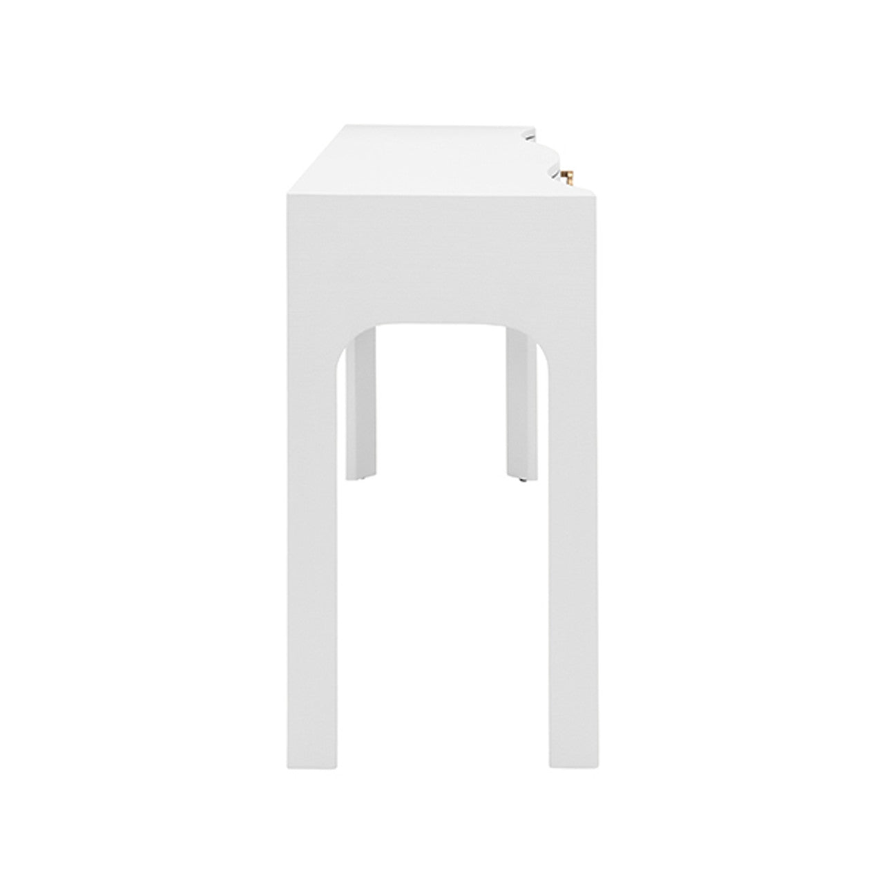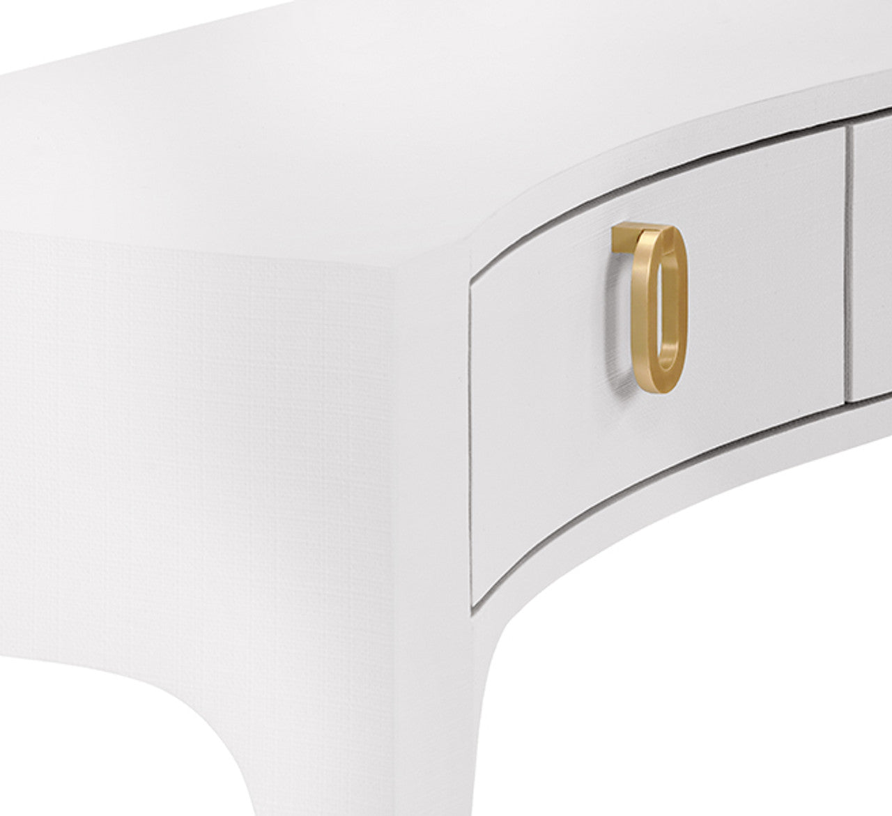 Sabrina Curved Front Console With Three Drawers In Textured White Linen With Satin Brass Ring Hardware And Glass Top