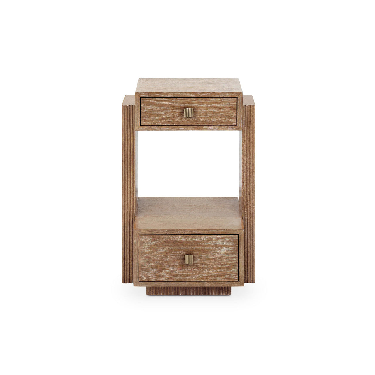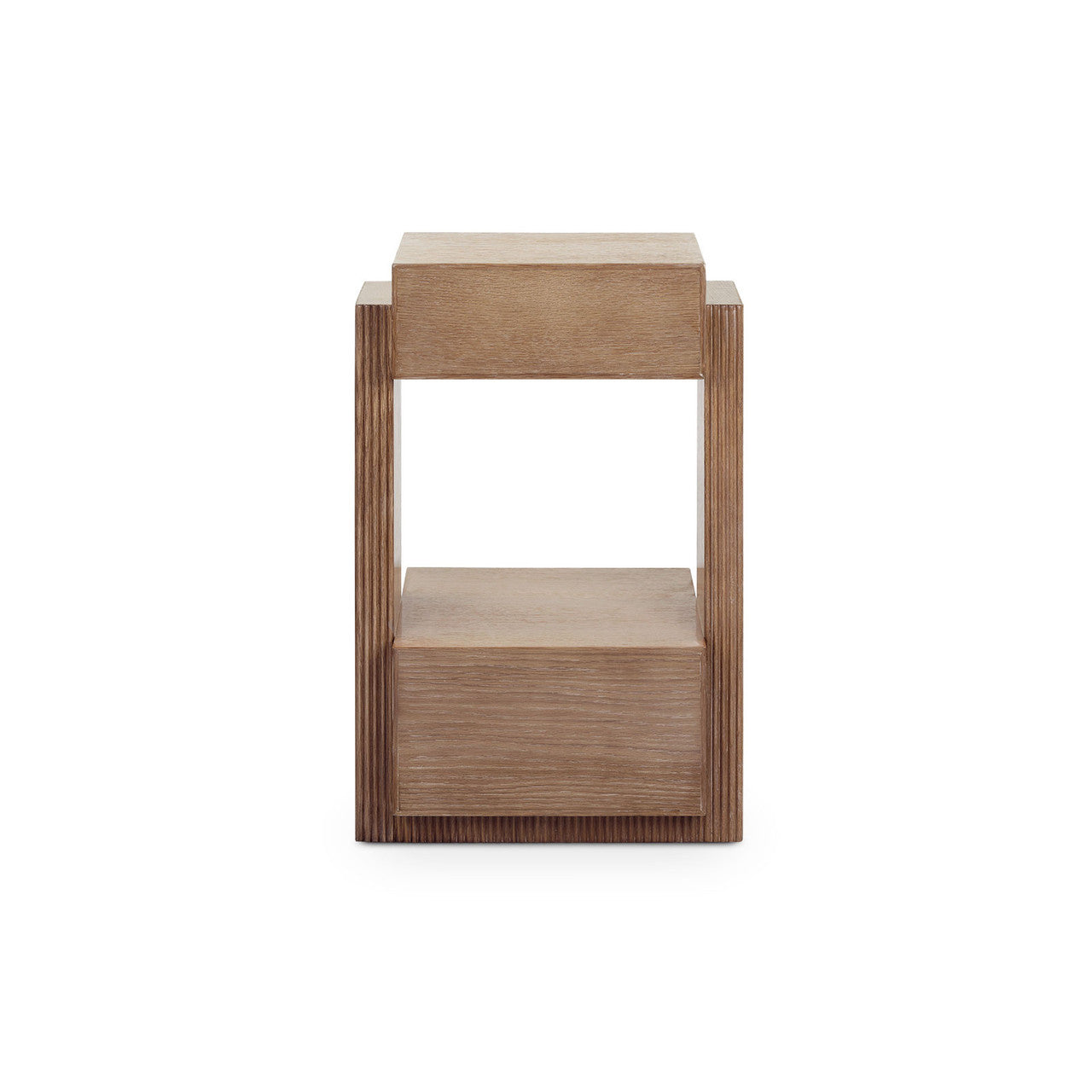 The Warren 2-Drawer End Table blends bold geometry with rich texture for a look that’s both modern and architectural. Its boxy silhouette rests on a platform base, while two rectangular drawers frame an open shelf space, creating an airy counterpoint to its solidity. The front edges of the side panels, base, and drawer pulls are detailed with a ribbed pattern, adding depth and visual interest to the clean lines. Equal parts form and function, the Warren brings a fresh perspective to contemporary design.