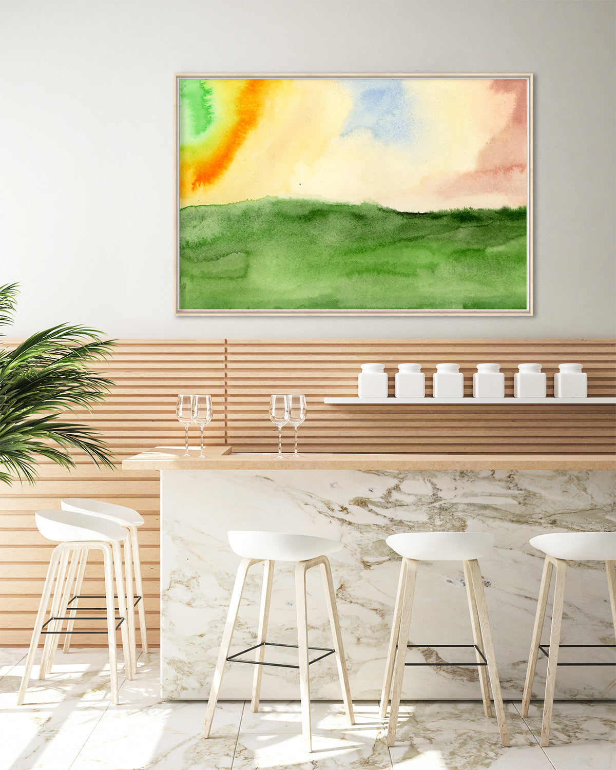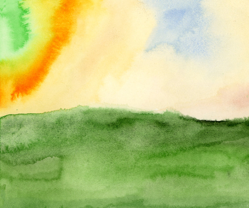 Skies of gentle yellows and oranges drift over Valerie Suter's serene watercolor landscape.