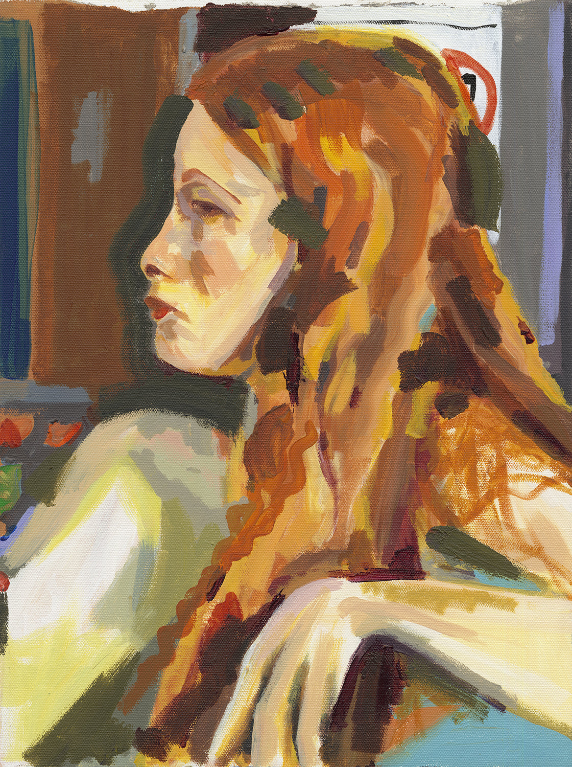 Alison Jones' "Caitlin," is a classic portrait of a woman in profile. The artist uses thick brushstrokes to create a sense of texture, accentuating the subject's long, auburn hair.