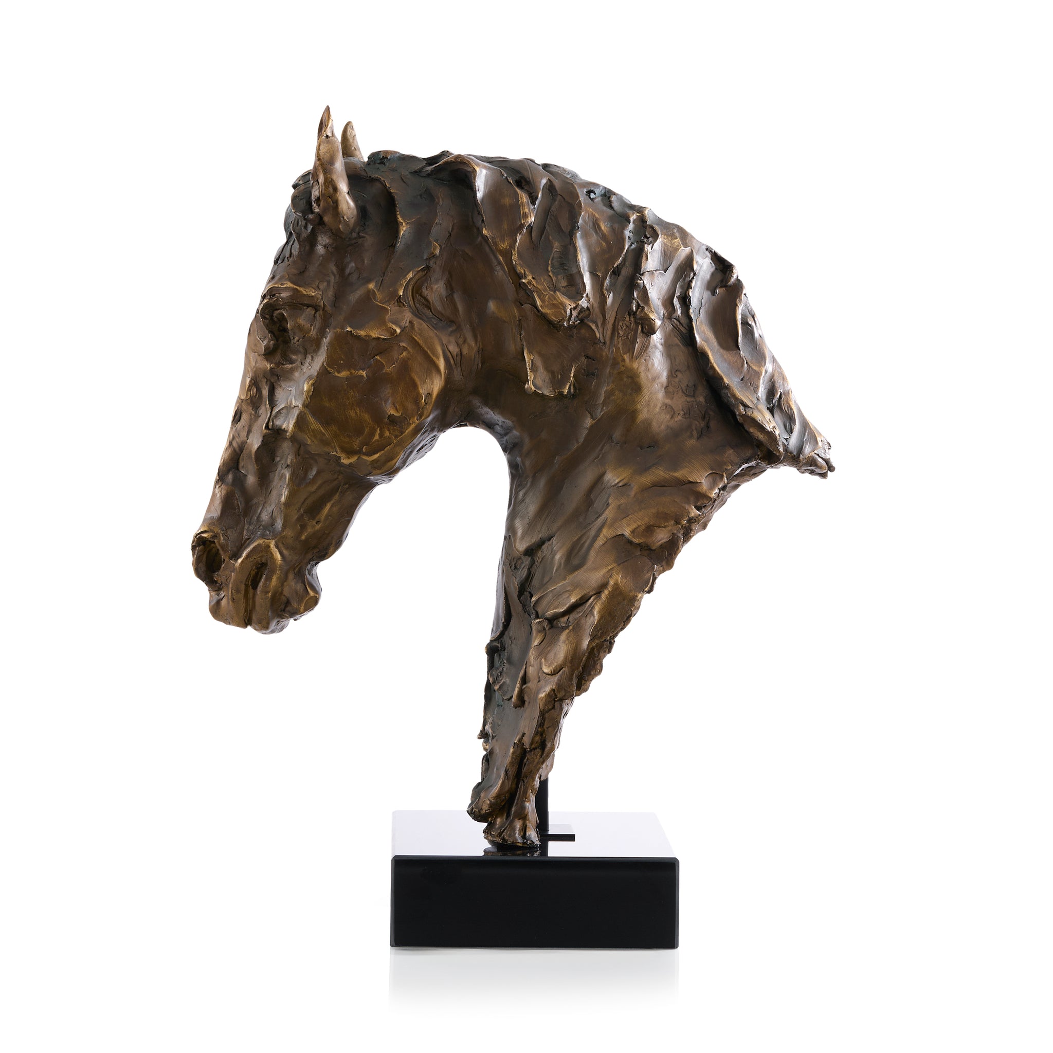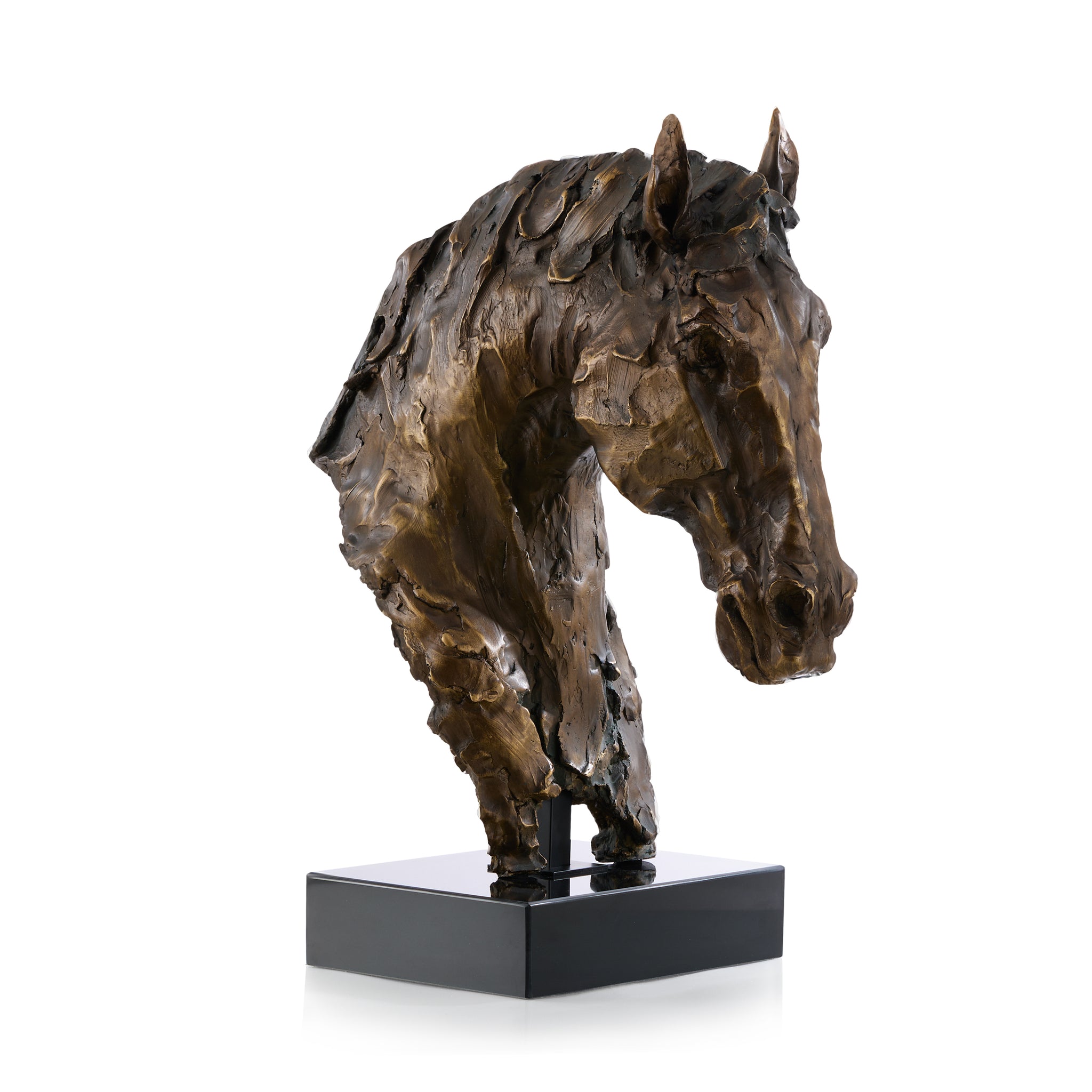 The Horse Bust captures the grace and strength of one of nature’s most majestic creatures. Finished in Bronze, this intricately detailed composite sculpture rests on a sleek metal rod and a solid black marble base, adding a timeless and refined touch to any space.