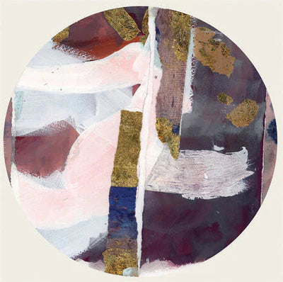 ZBC's series of gold adorned globes feature pools of color, expressive brushstrokes, and collage elements. They make up our richest series of moody tondos.