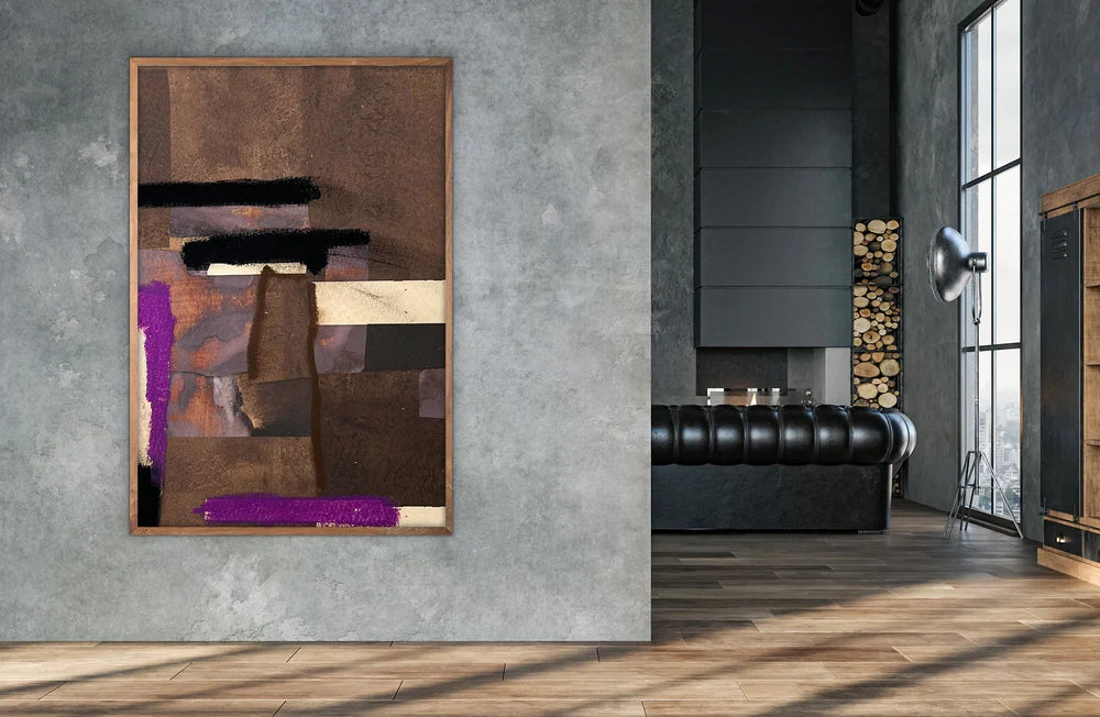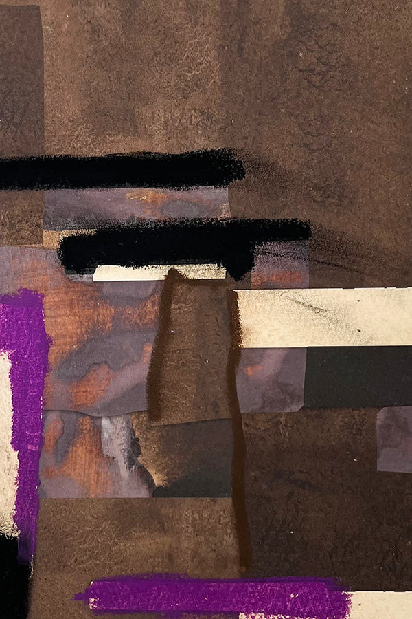 A mosaic of earth tones and midnight black, ZBC's "Tin" series is a study in texture and layered forms. Blocks of rich brown and deep plum collide, bound by strokes of stark black, creating a dense, multi-dimensional composition.