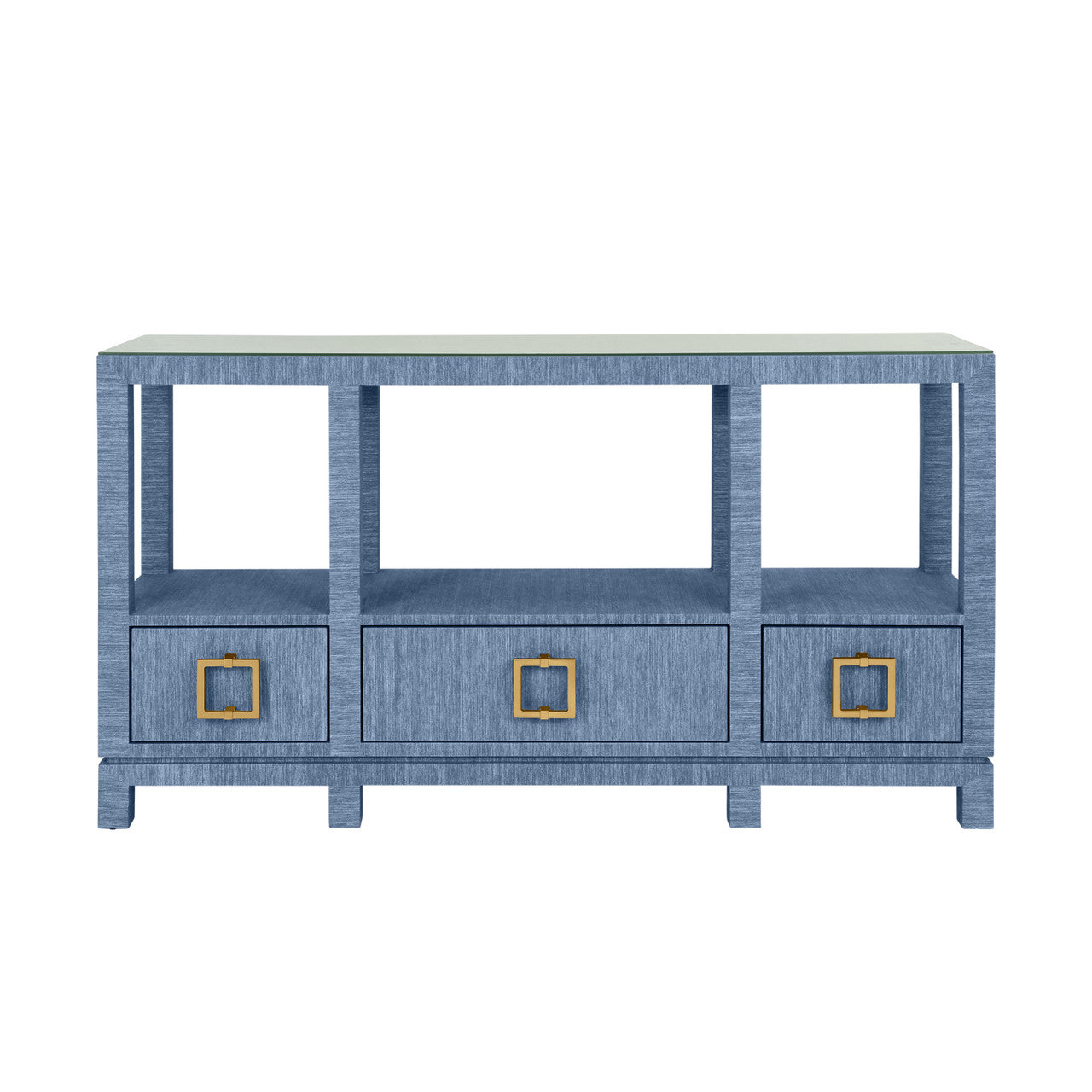 Campbell Open Shelf Console With Three Bottom Drawers And Square Satin Brass Hardware In Dyed Blue Grasscloth