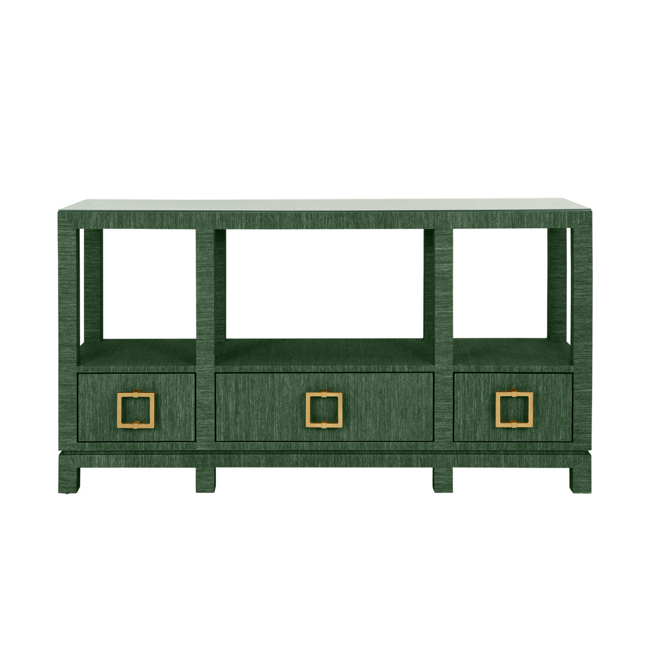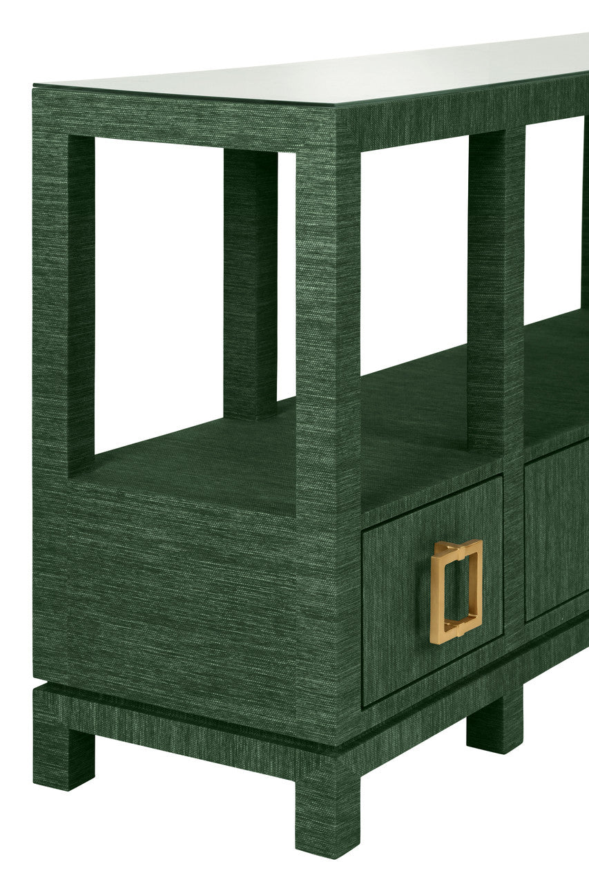 A striking blend of form and texture, the Campbell GR console is wrapped in richly dyed green grasscloth, offering a tactile elegance that elevates any space. The design features an open shelf, three bottom drawers, a practical glass top, and square satin brass hardware. This console is a standout piece for any space!