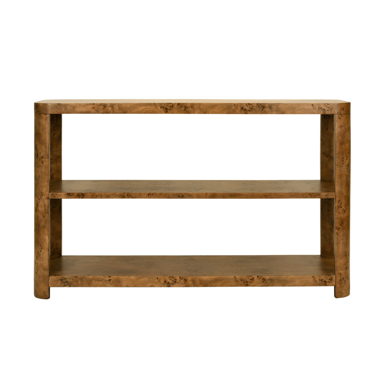 Emery Tier Tier Console With Curved Corners In Dark Burl Wood
