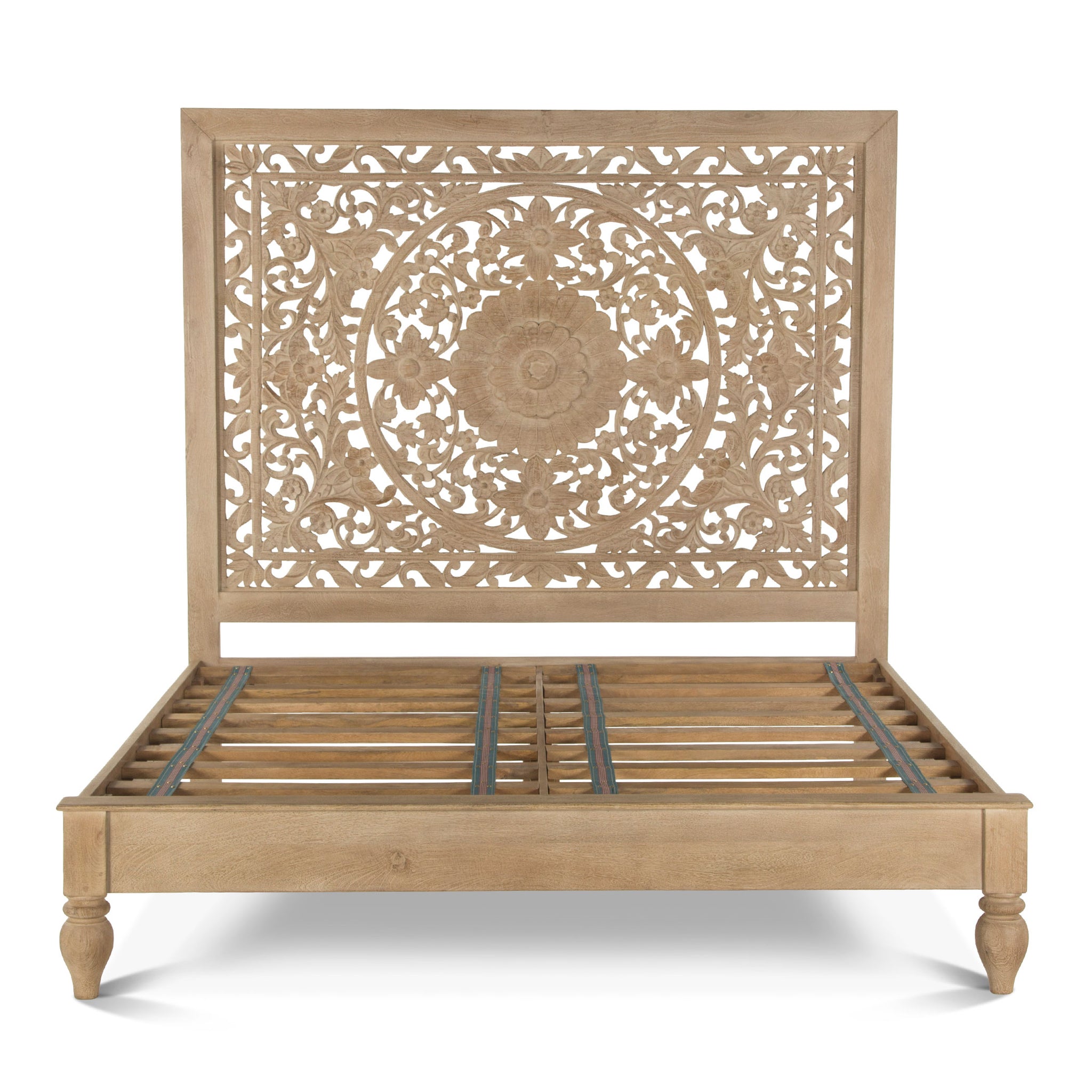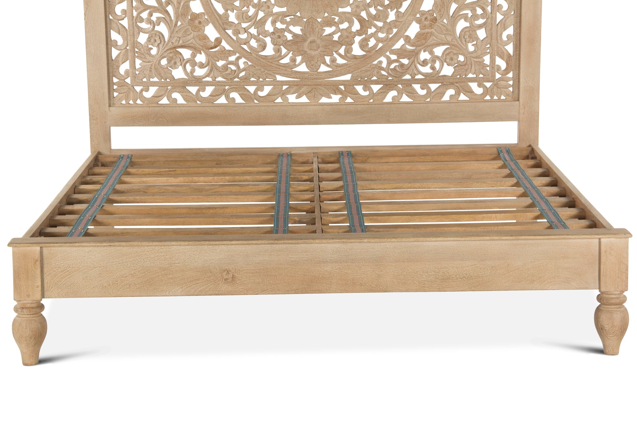 • Headboard features floral and leaf detailing hand-carved by experienced artisans in the wood