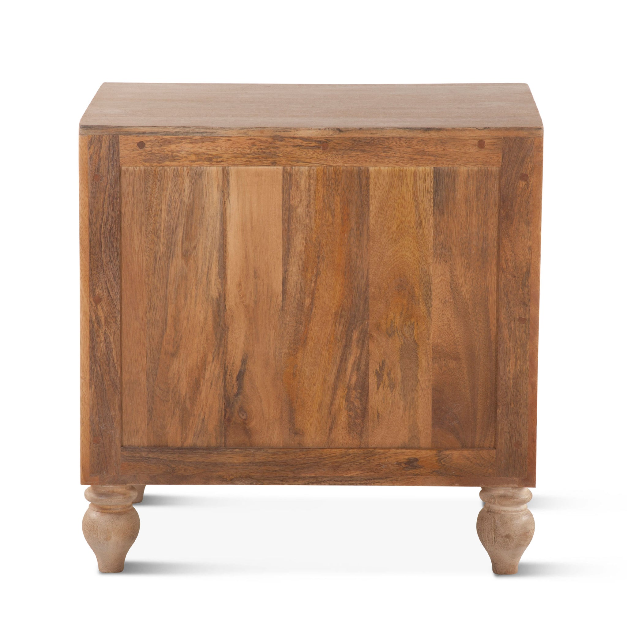 Inspired by Indian culture and architecture, this collection showcases hand turned legs and remarkable floral and geometric pattern detailing hand-carved in the wood by our highly skilled artisans. This beautiful night chest features a water-based, catalyzed finish that enhances the carvings. With two drawers stacked in the center, and each with a small knob handle on the front bordered by a floral carving, this night chest provides enough room to house all your favorite nighttime accessories. The night chest rests atop a pair of hand turned, heirloom quality mango wood legs. No assembly required.