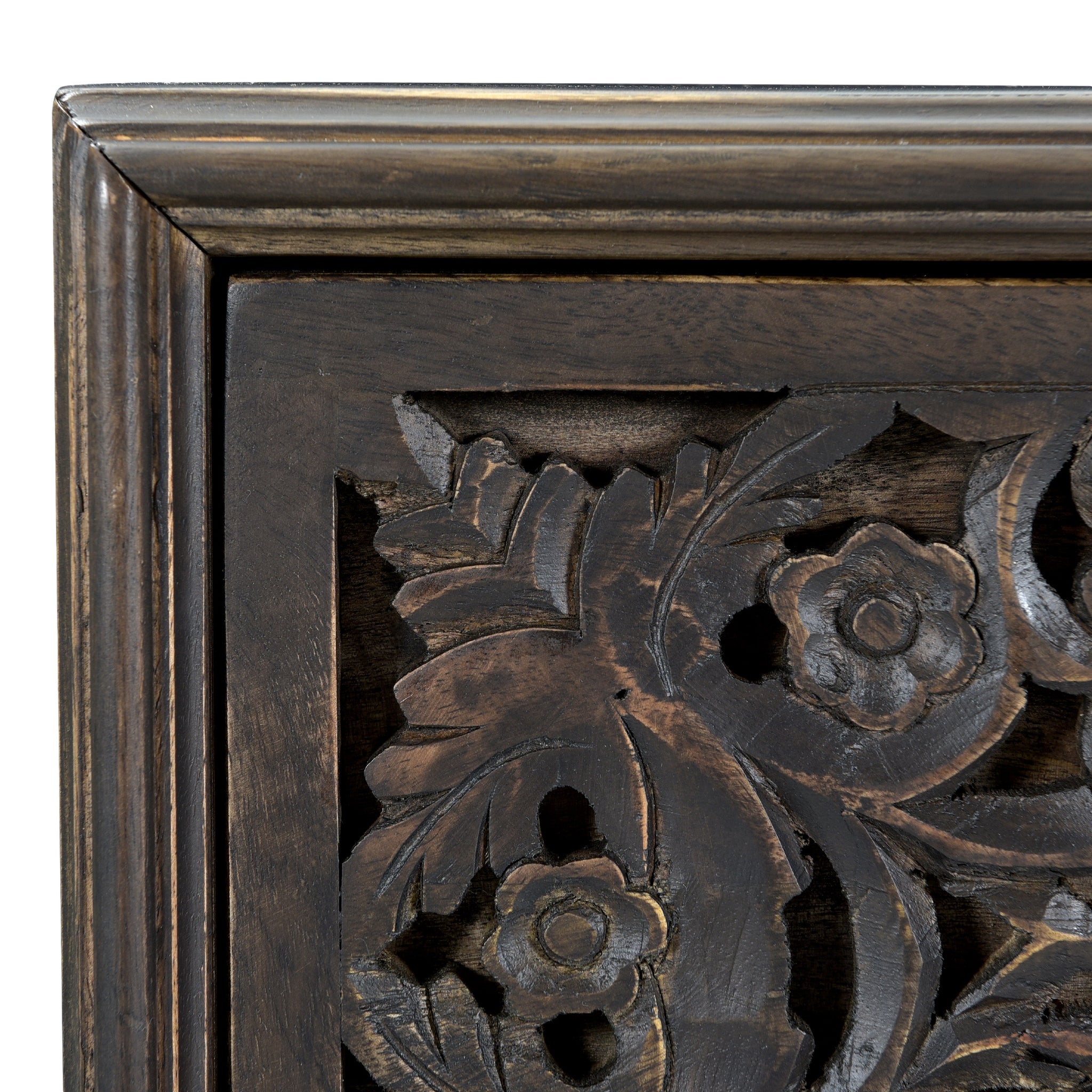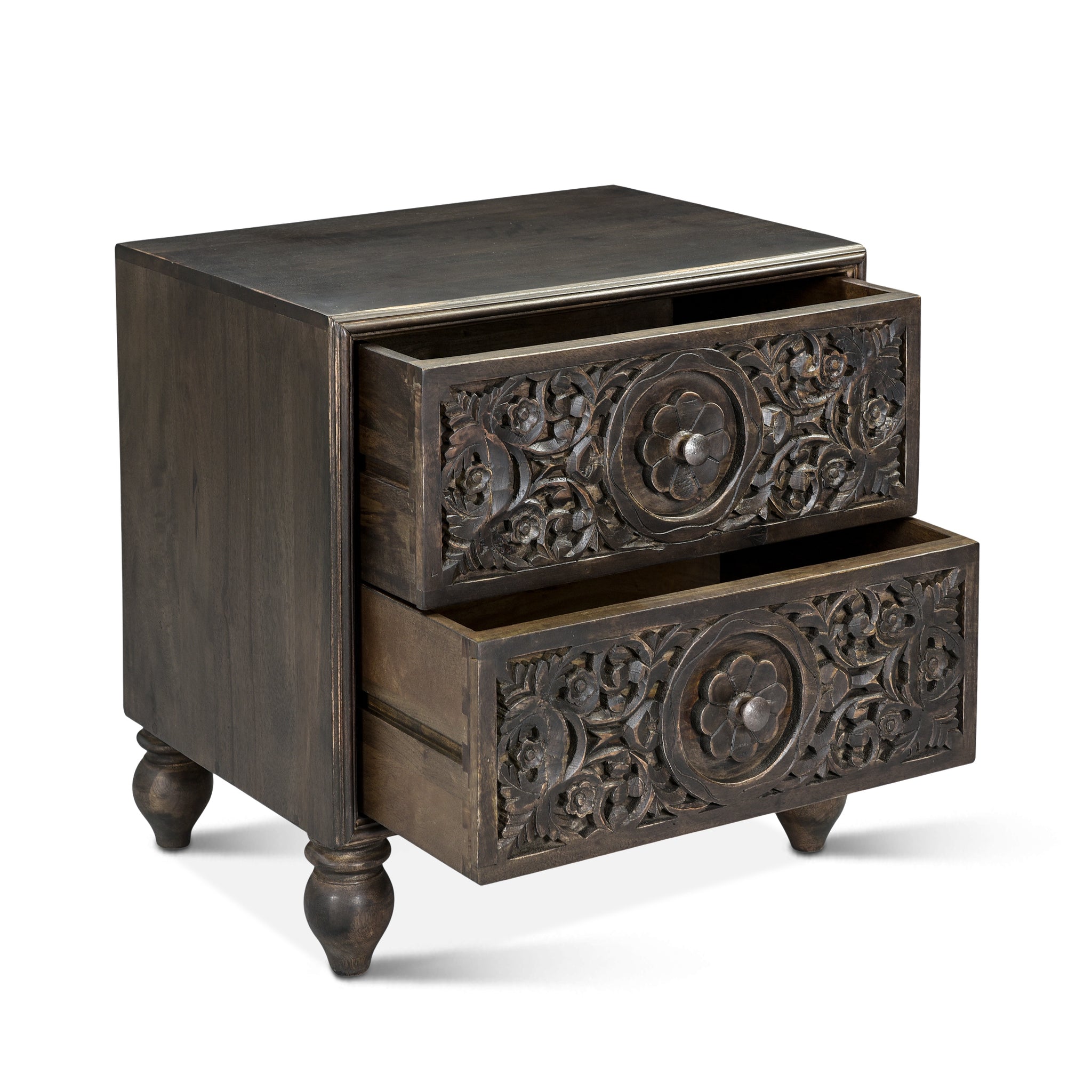 Inspired by India culture and architecture, the Haveli collection of furniture is crafted from sustainable mango wood featuring finishes that highlight the natural beauty of each piece. This collection showcases hand turned legs and remarkable floral and geometric pattern detailing hand-carved in the wood by our highly skilled artisans, creating a stunningly dramatic statement. This beautiful night chest features a water-based, catalyzed, vintage brown finish that enhances the carvings and complements a variety of styles, while also offering durability for daily use. With two drawers stacked in the center, and each with a small knob handle on the front bordered by a floral carving, this night chest provides enough room to house all your favorite nighttime accessories. The night chest rests atop a pair of hand turned, heirloom quality mango wood legs, further emphasizing the attention to detail that this piece evokes. This pre-assembled night chest is made with materials of the finest quality, making it the perfect addition to any bedroom. Due to the handcrafted nature of this item, variations will occur and are a feature of this unique collection.