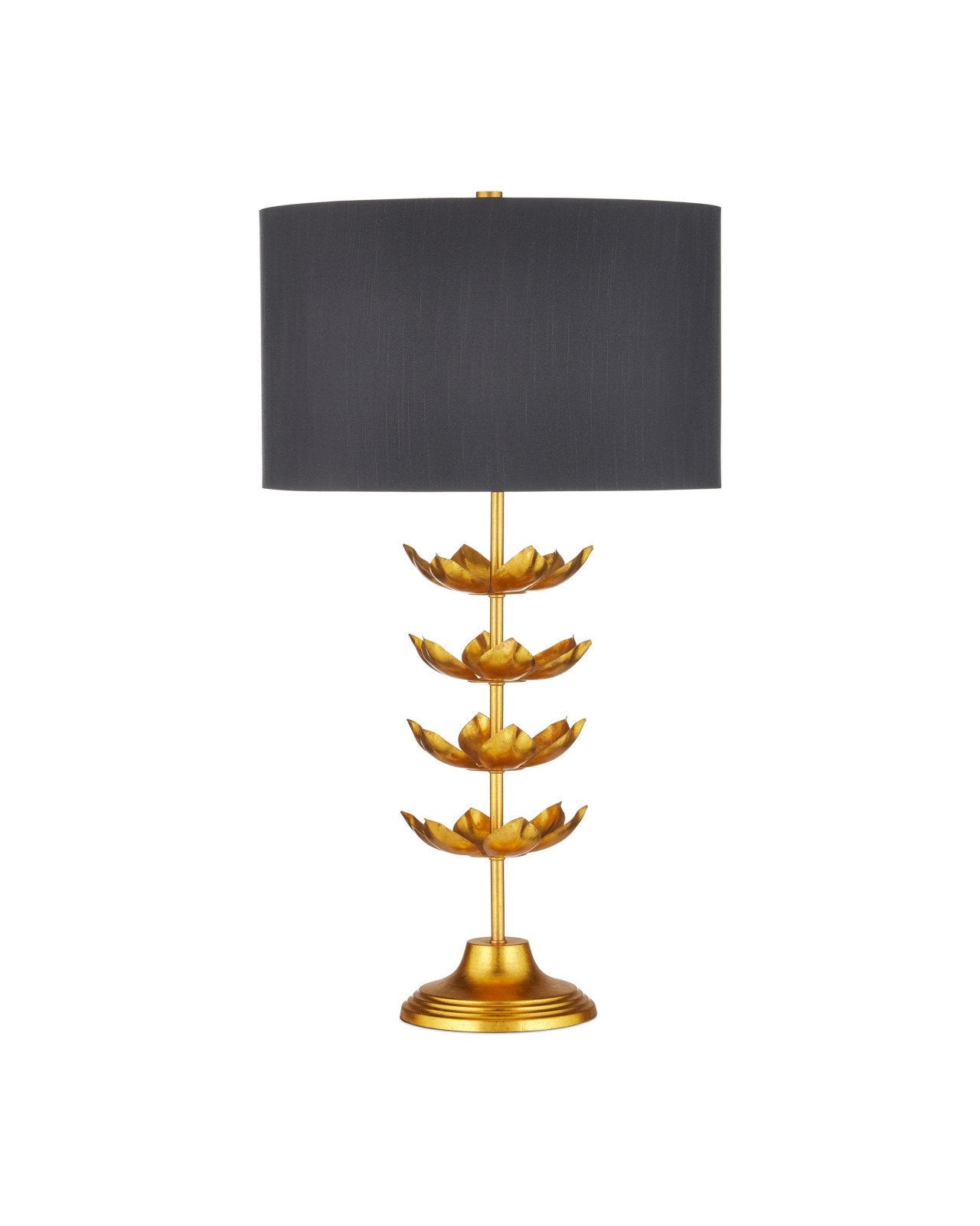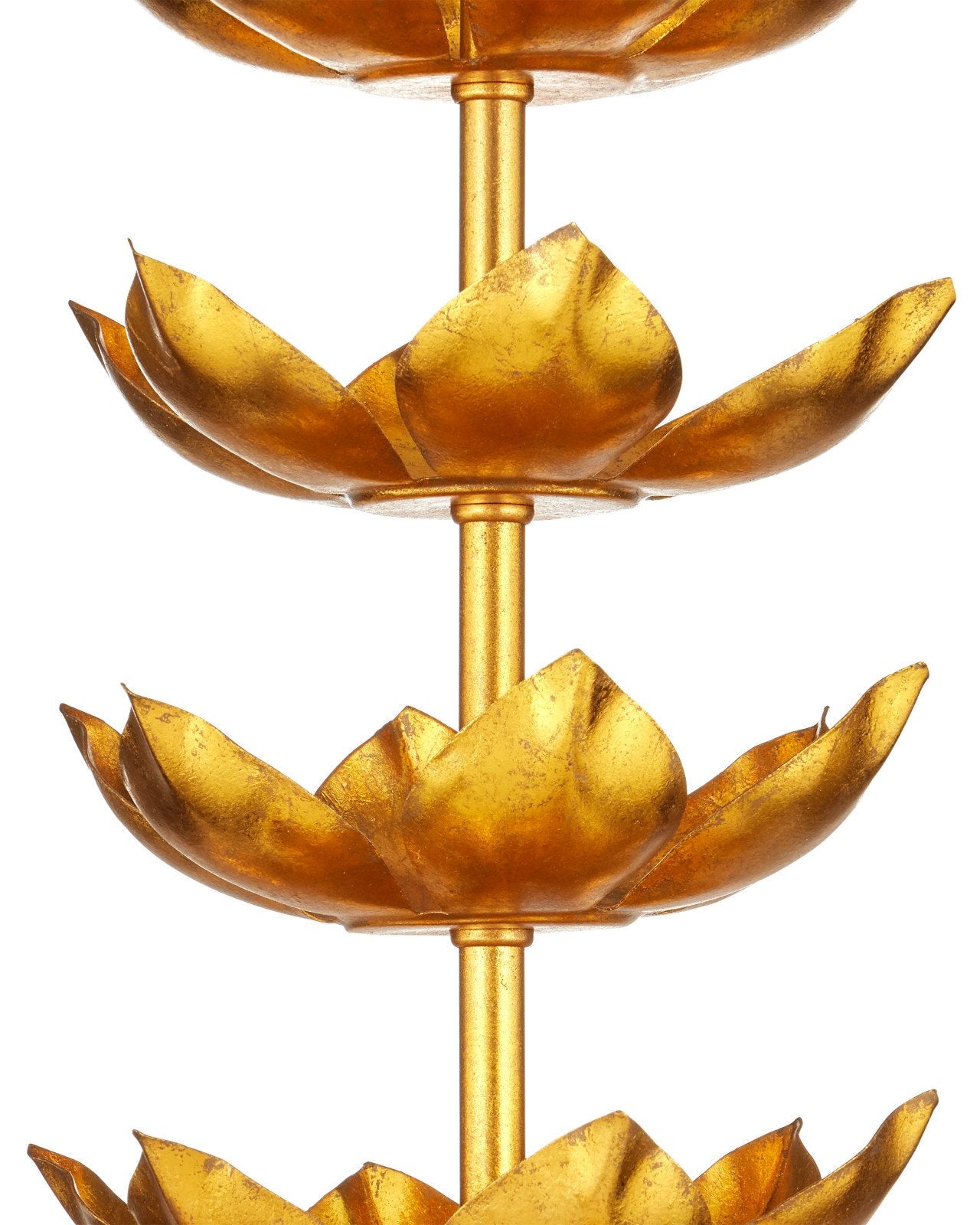 The Awakening Table Lamp is made of iron in a gold leaf finish, its thin stem rising from a round base with lotus-inspired blossoms branching outward. The hand-applied gold foil gives the surface a bright, textured appearance, enhancing the lamp’s resemblance to a fountain of flowers. A black shade tops the design, providing a striking contrast to the luminous base. Due to the artisanal finish, the surface of each lamp could differ slightly.