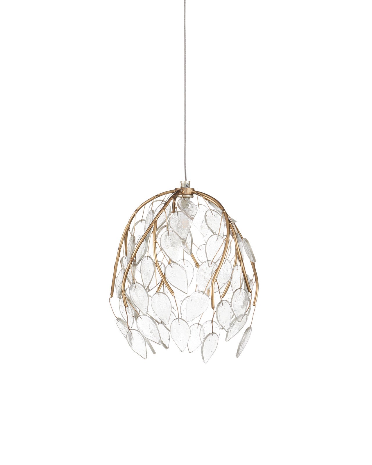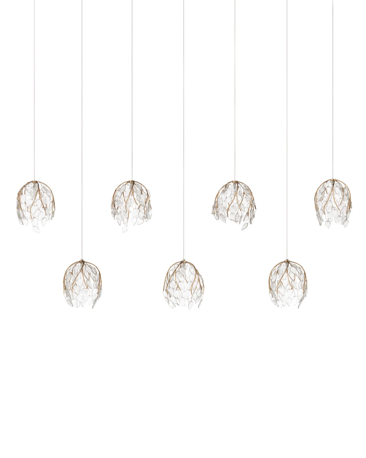 The Banyan 7-Light Linear Multi-Drop Pendant has shades crafted from iron in an antique brass finish with twisting, branch-like forms. Clear glass leaves are set along the curves, their delicate shapes flowing around the bulbs. When illuminated, the glass catches the light, creating shimmer and depth while emphasizing the organic movement of the design. Due to the artisanal material, the surface of the glass could differ slightly on each shade.