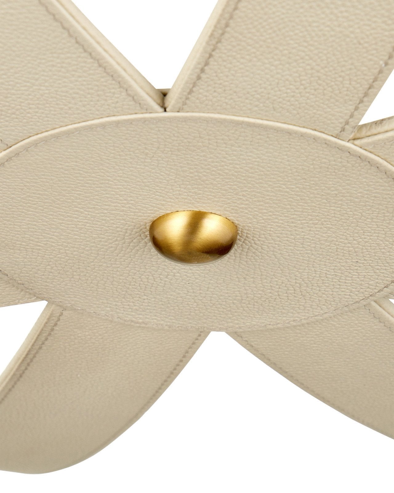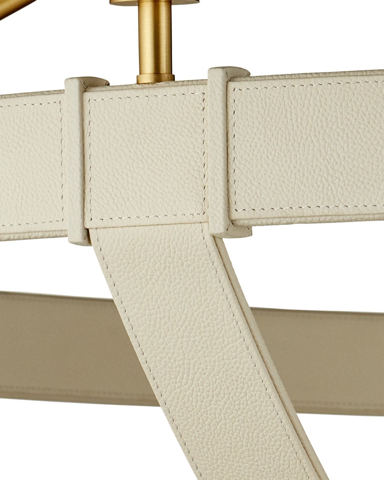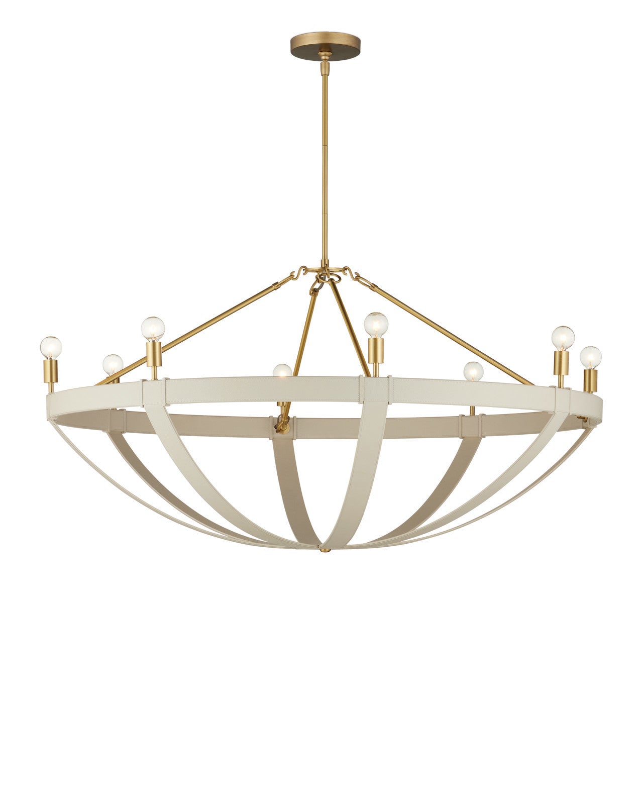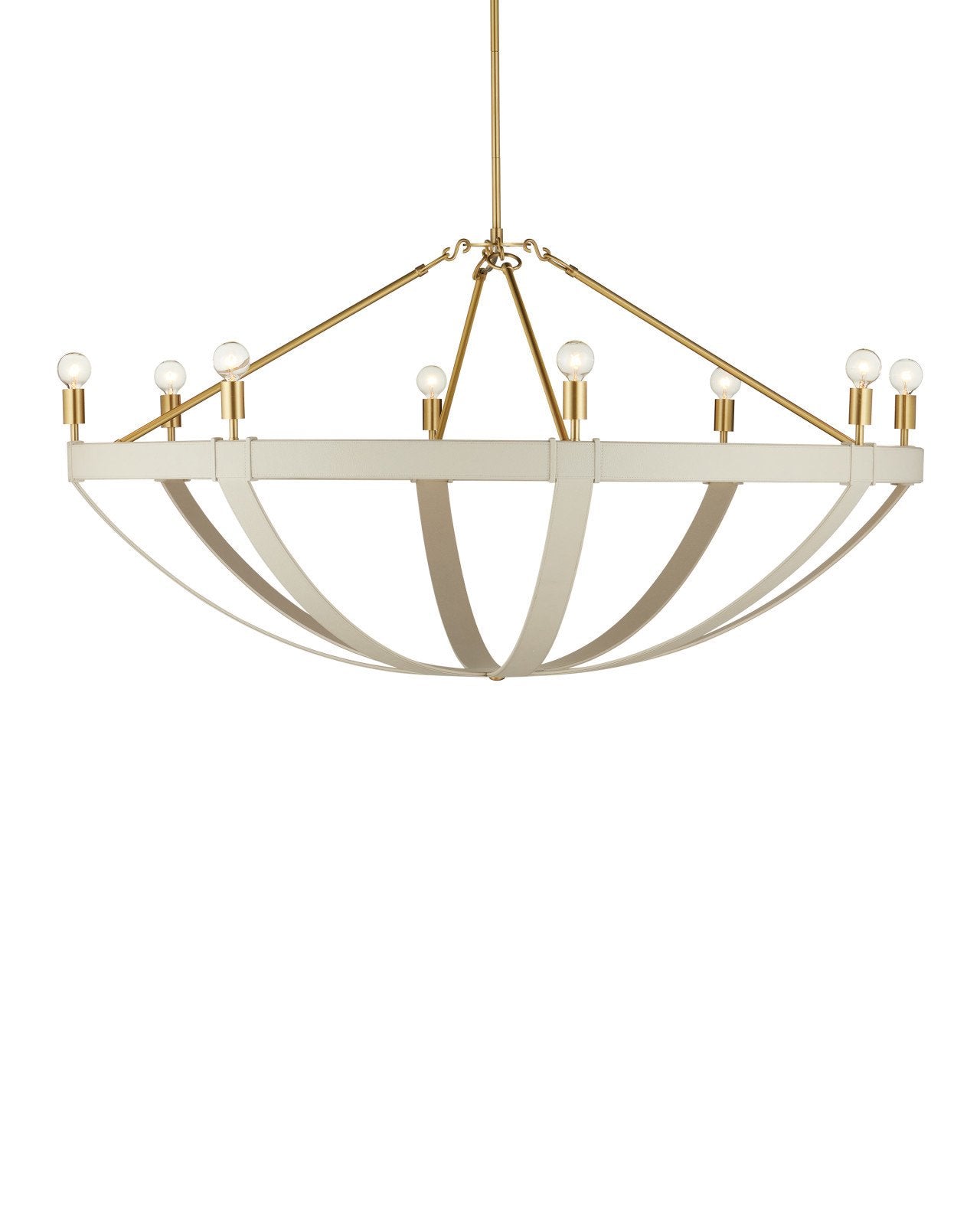 The Barrington Chandelier is a study in restraint with its implied upturned bowl-shape covered in pebbled cream leather. Adding to the lightness of this design are the slender rods that hold the fixture in place. The simplicity of the bulbs also contributes to the chandelier’s classic feel. The buckle-like hardware and the bobeches are in a brushed brass finish for a gleaming contrast to the pale leather. This eight-light fixture is dimmable.