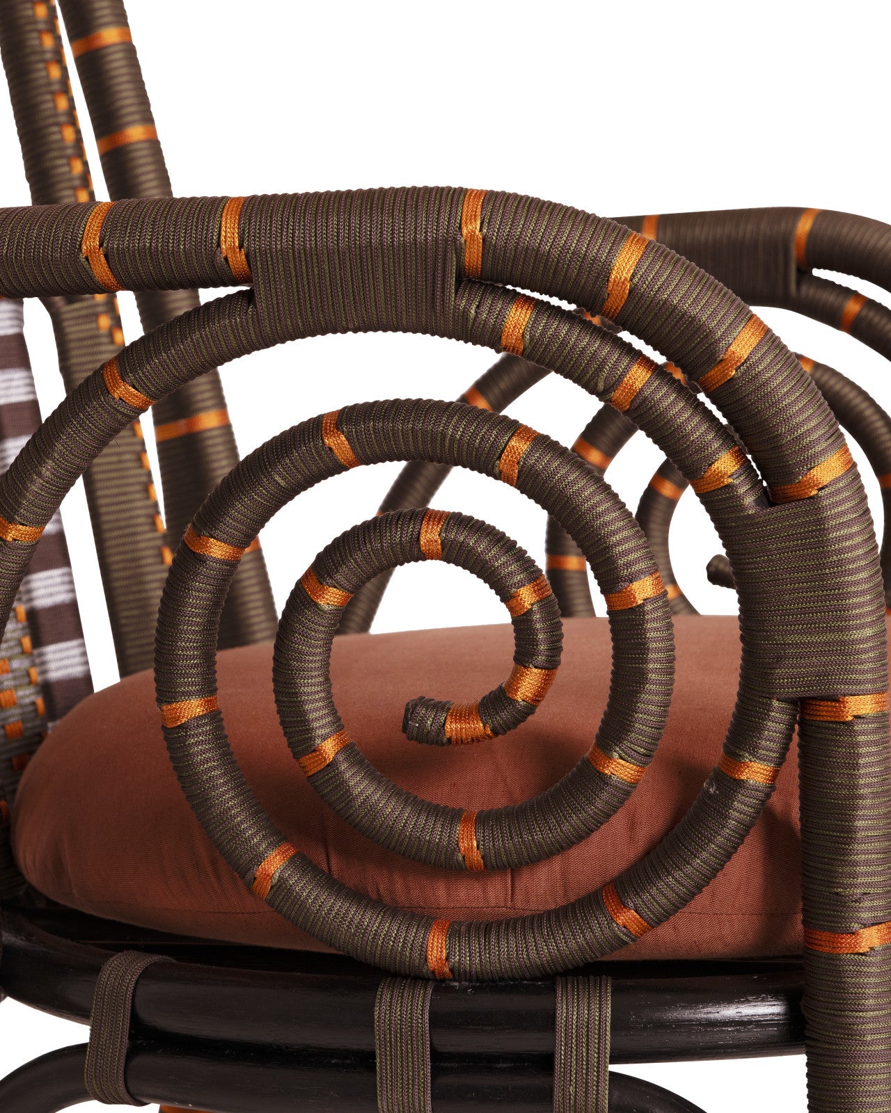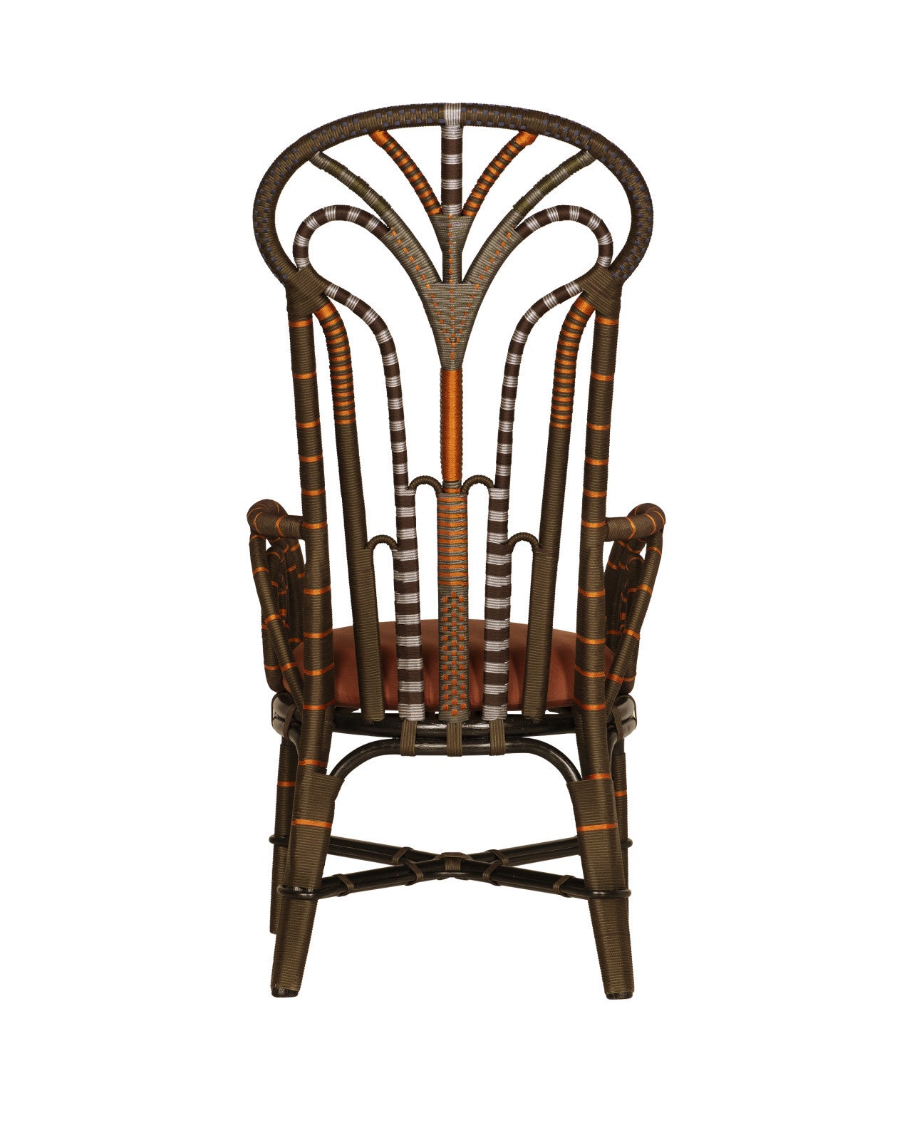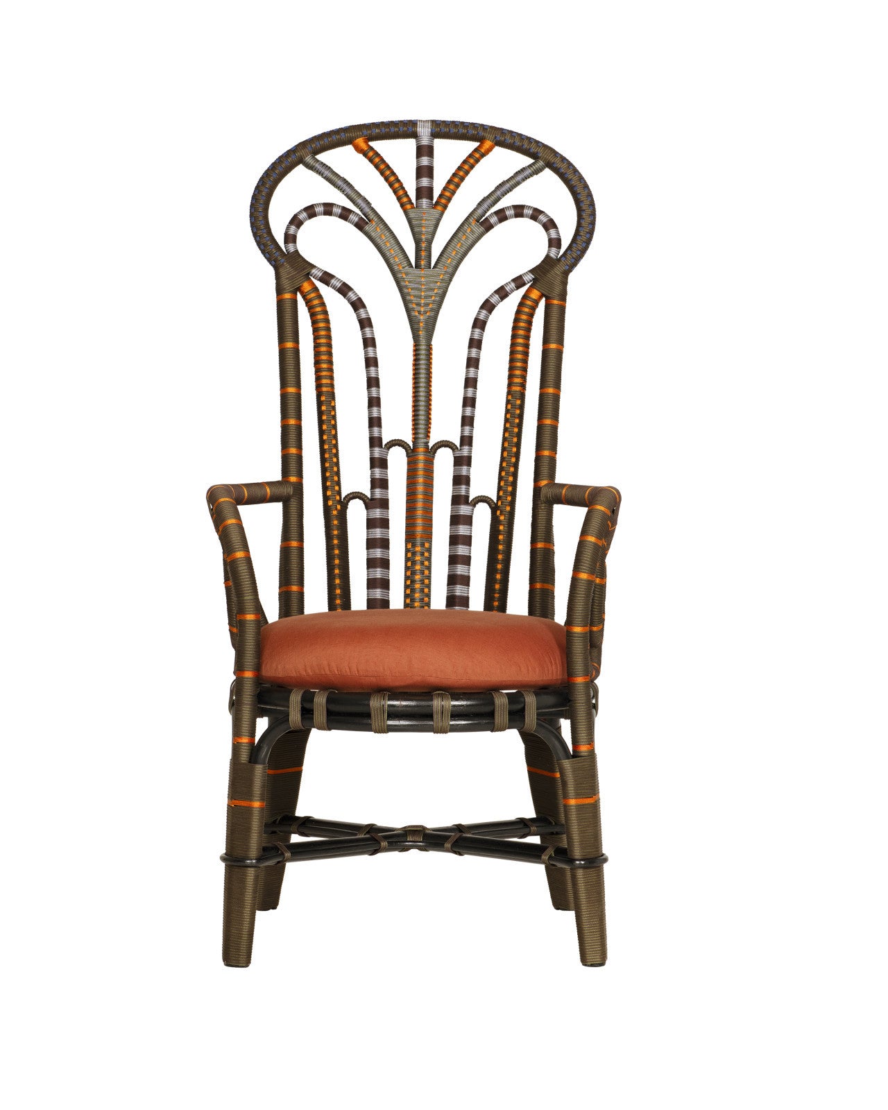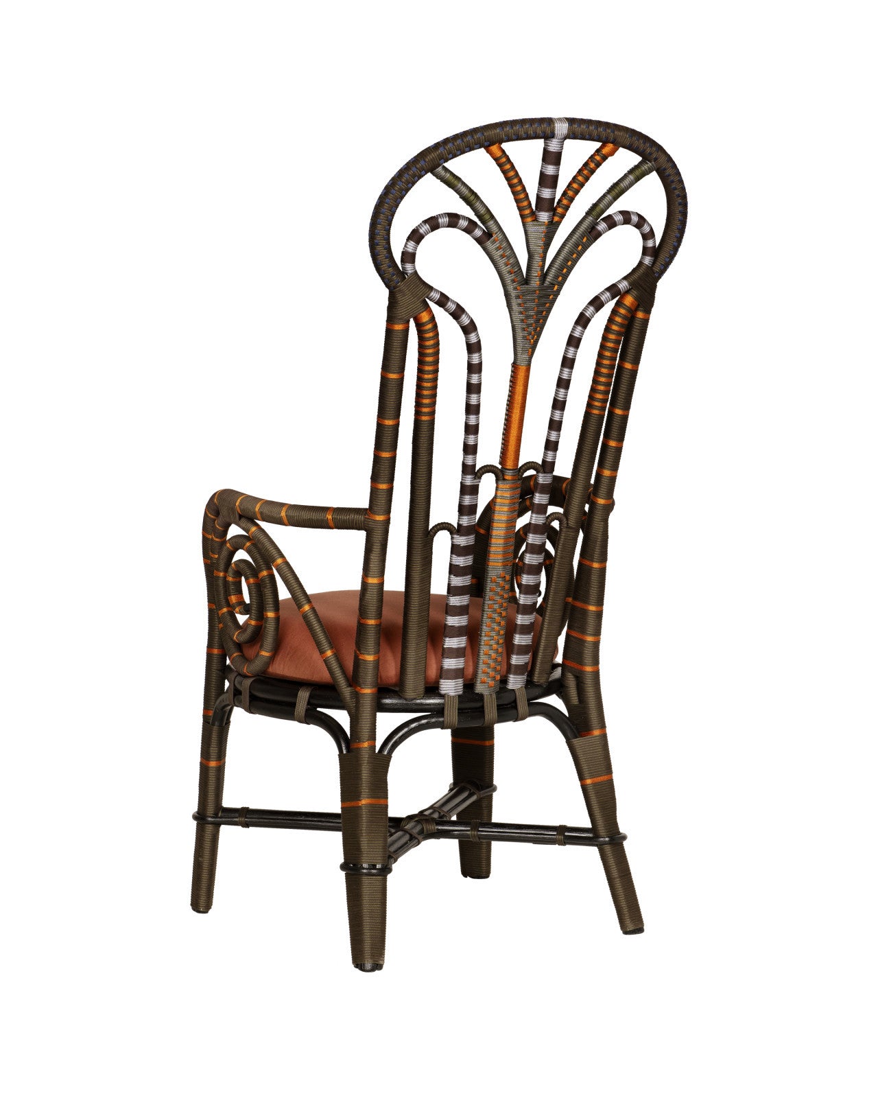 The Benin Throne Brown Armchair is a narrow and tall-backed derivative of the classic Peacock chair silhouette with rich brown, vivid orange and smooth silver performance rope wrapped over a bent rattan frame. This style of rattan chair has long been symbolic of royalty and empowerment, and now celebrates bohemian luxury. While this iteration is slender in scale, it’s a dramatic design demanding of attention. The loose seat cushion is covered in Trevino Julep 100% silk upholstery.