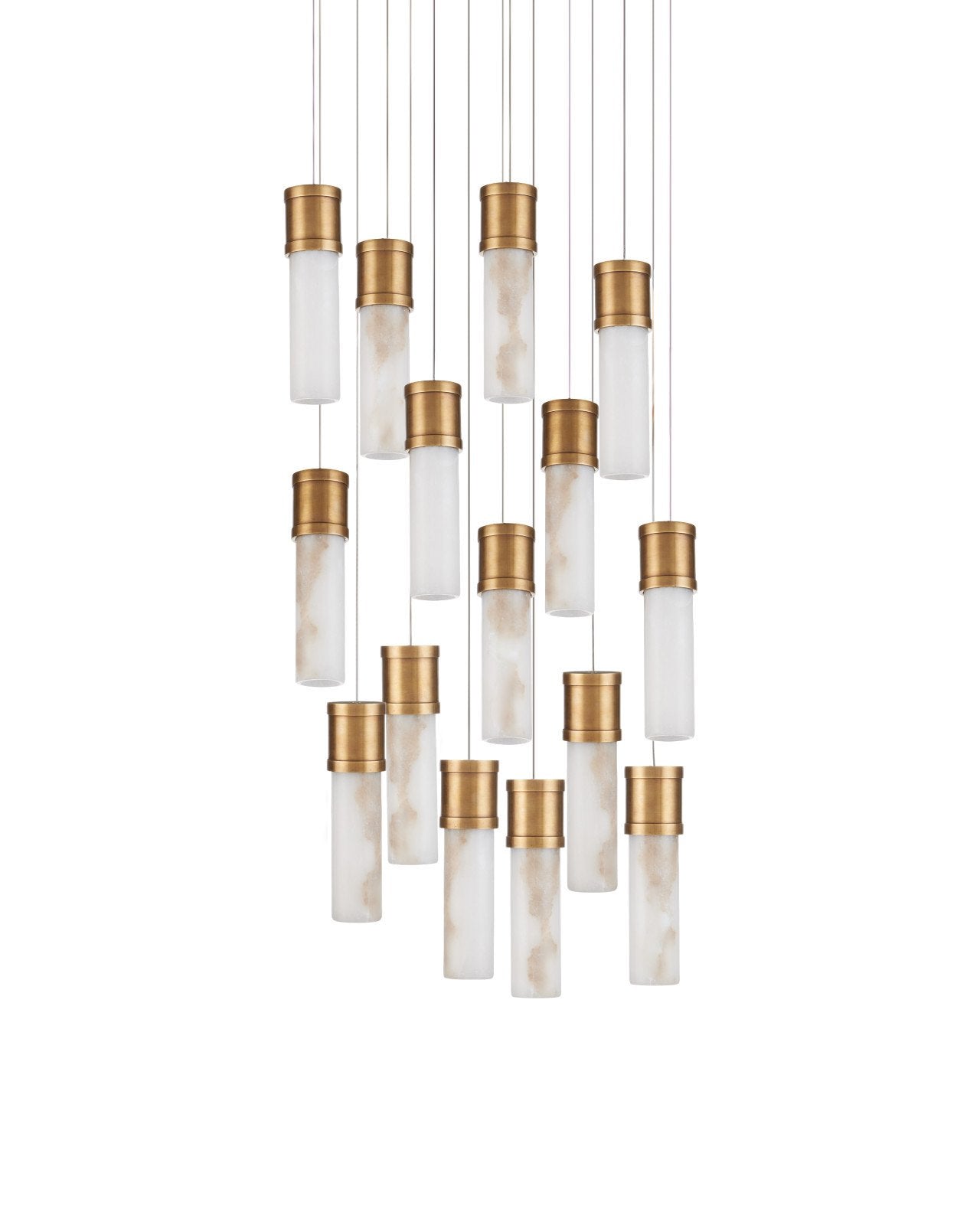 The Cannula 15-Light Round Multi-Drop Pendant features shades with brass caps in a vintage brass finish that has industrial characteristics. Suspended from the caps are tubes made of real alabaster, showcasing the natural variations of the stone so that each piece is slightly unique. The blend of warm metal and luminous stone brings both texture and refinement to the design.