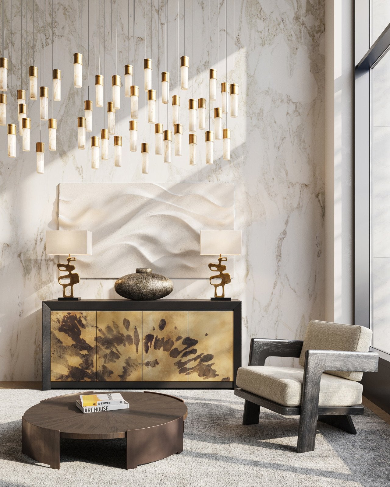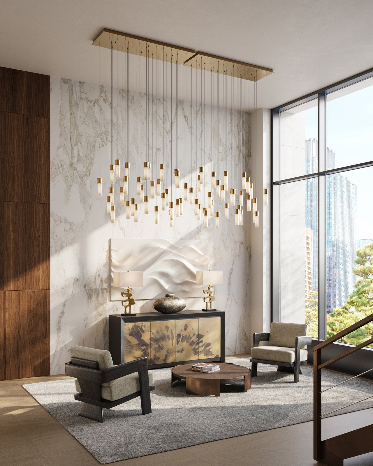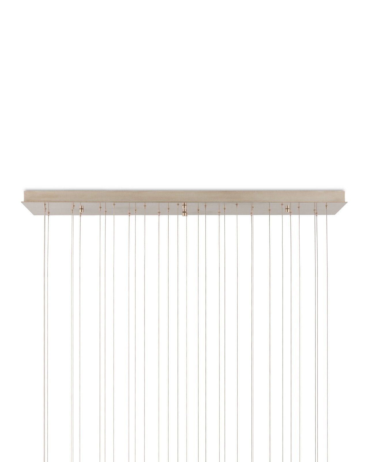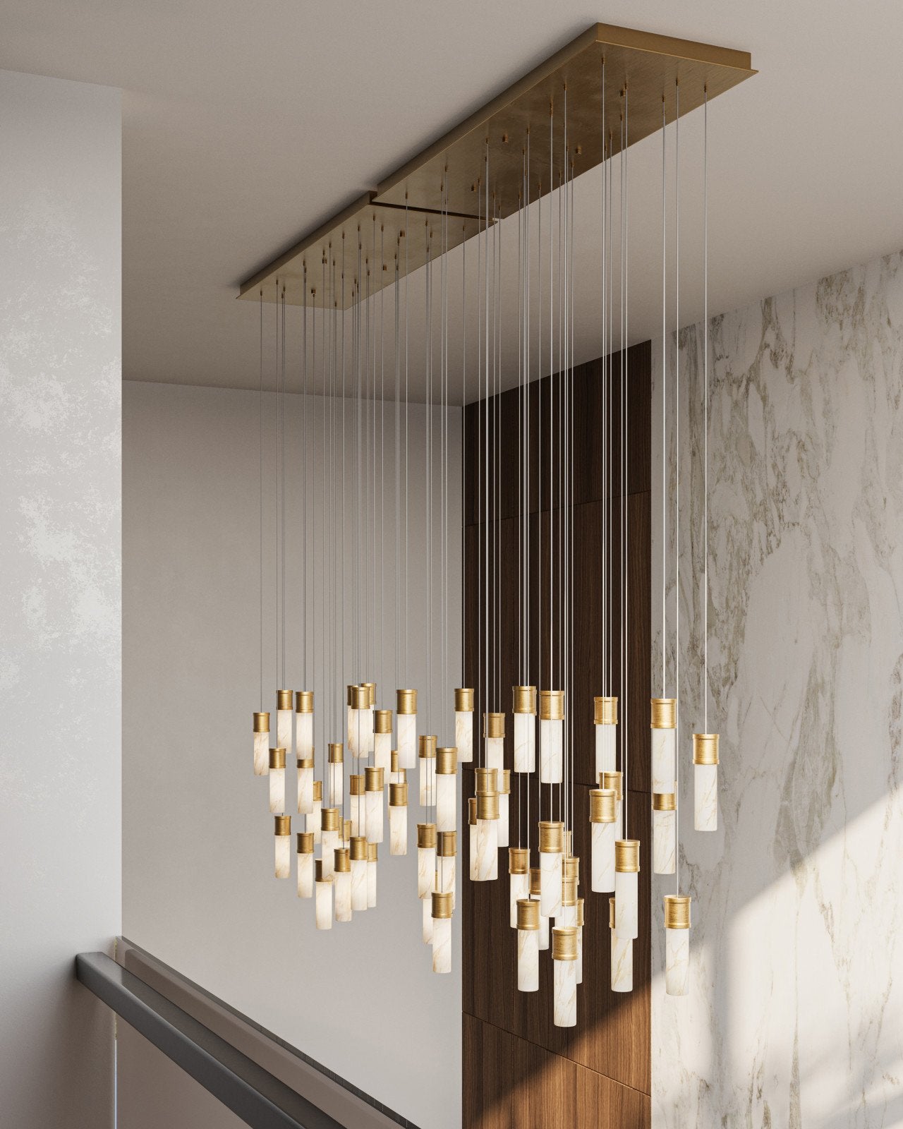 The Cannula 30-Light Linear Multi-Drop Pendant features shades with brass caps in a vintage brass finish that has industrial characteristics. Suspended from the caps are tubes made of real alabaster, showcasing the natural variations of the stone so that each piece is slightly unique. The blend of warm metal and luminous stone brings both texture and refinement to the design.