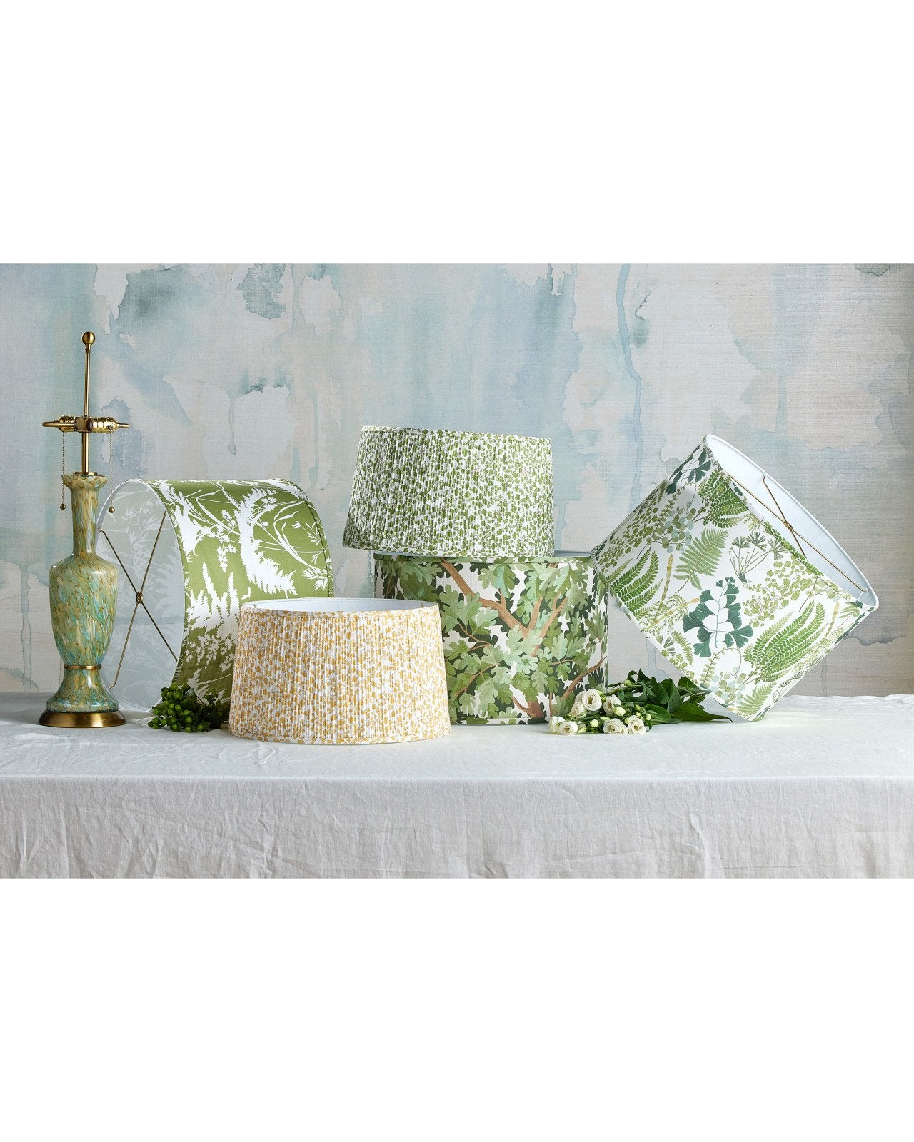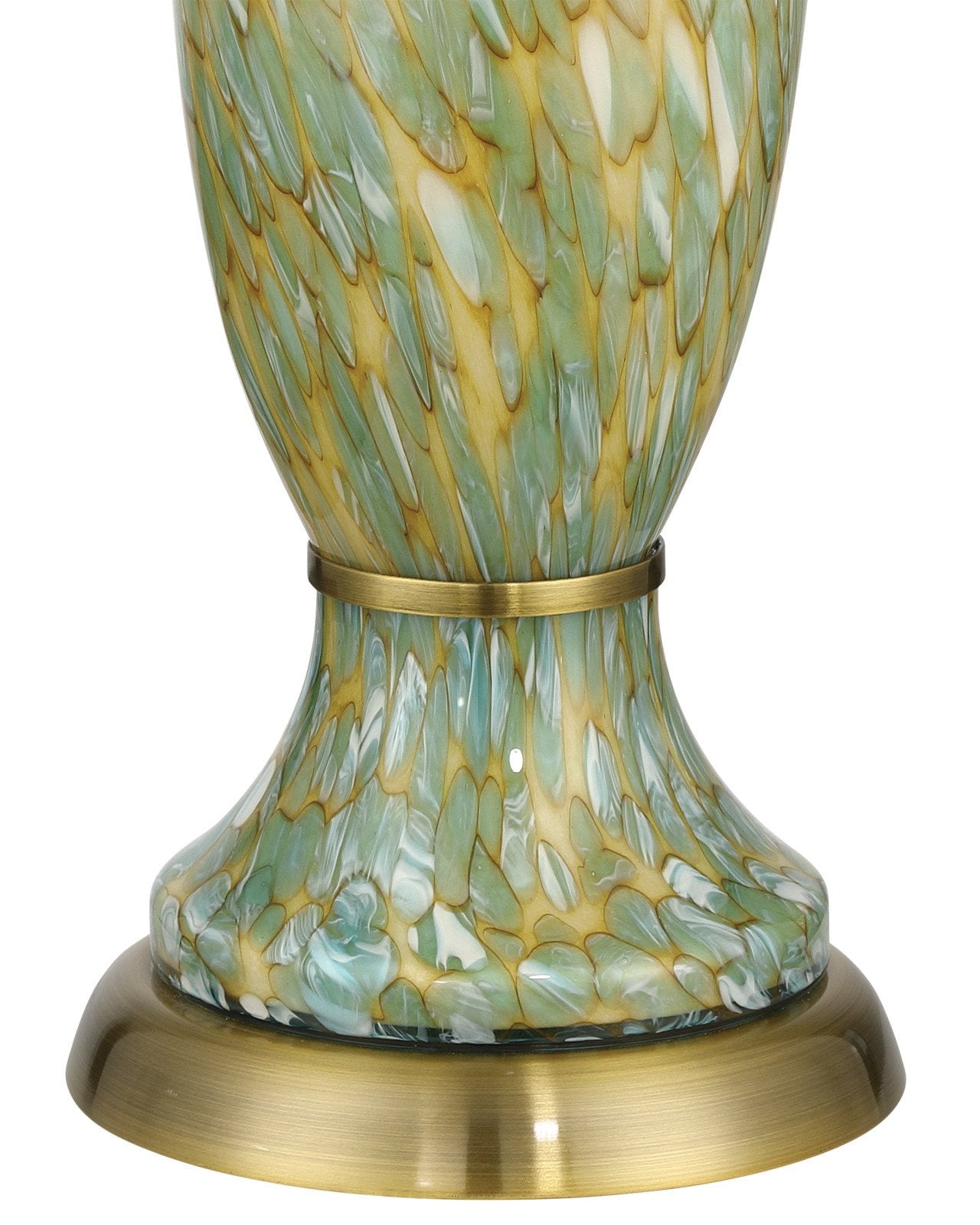 The shape of the Classico Green Table Lamp was inspired by a 19th-century Zanfirico vase created by Venetian glassmakers on the island of Murano. The mottled-green mouth-blown material from which the body is made was created in two pieces that are cinched by a band of metal in an antique brass finish. The matching metal base and finial add to the warmth of the profile, and the empire shade bathes the swirling green, yellow, and beige patterning on its surface in illumination. Because it is made of an artisanal material, its surface may vary slightly from lamp to lamp.