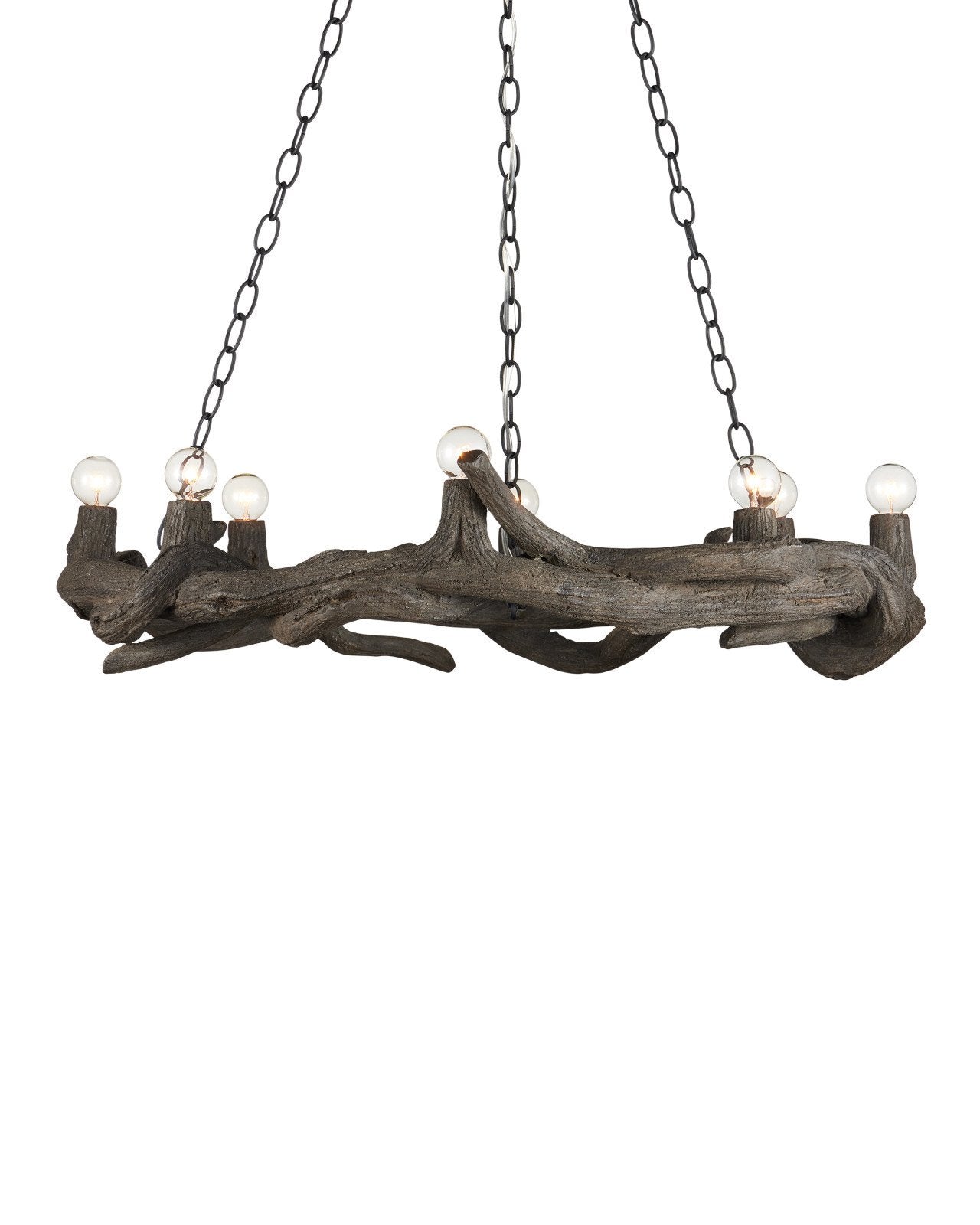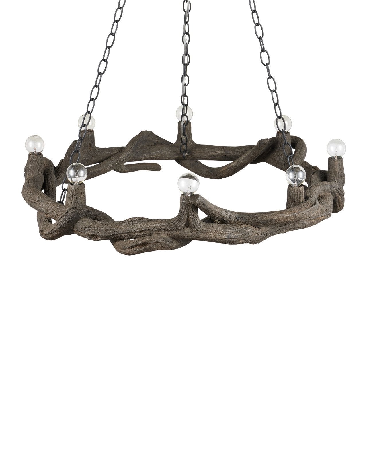 The Dunmore Chandelier features a gnarled ring made of concrete in the tradition of faux bois with a Charbon de Bois finish that gives it the look of natural, dark brown timber. Eight bulbs are set along the circular frame; their placement highlighting the sculptural texture of the design. The combination of organic form and durable materials makes this chandelier a striking centerpiece with a strong natural character. This fixture is dimmable.