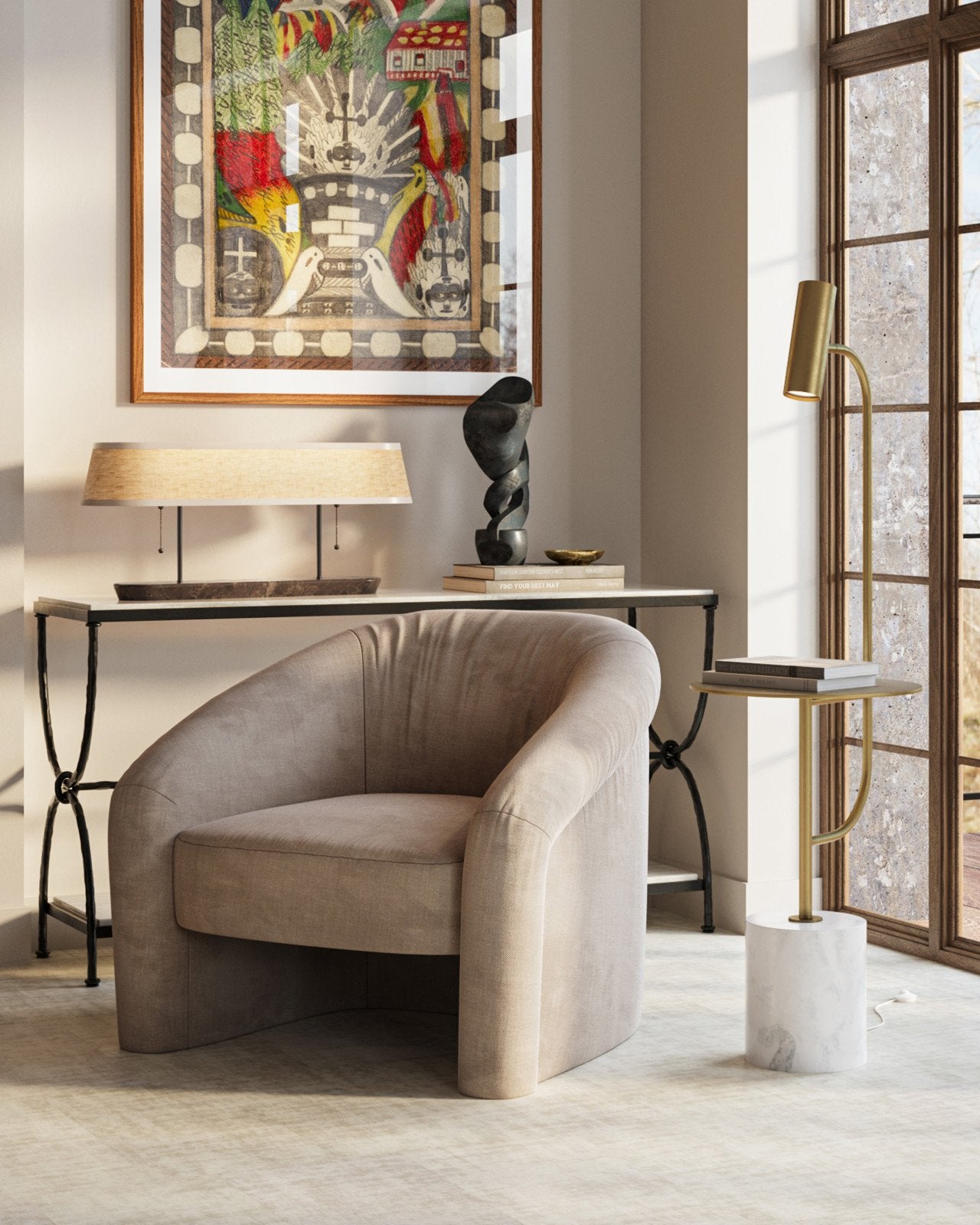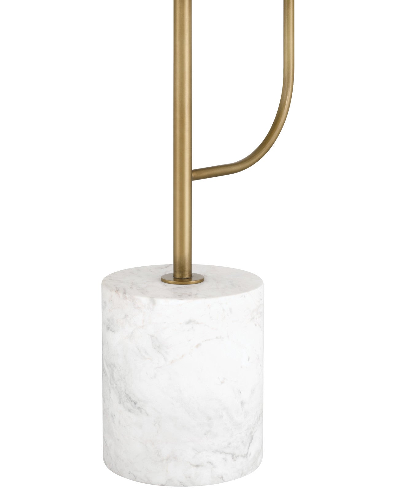 The Eastlin Floor Lamp with Table has a complex profile created by simple shapes and lines. From a heavy cylindrical white marble base, a side table rises on a thin stem. An arcing rod that intersects the top holds a canister shade, also made of metal, that can be tilted and rotated to change the direction of the illumination. The white marble juxtaposes with the antique brass finish on the metal to create a contrasting color story. Because it features a natural material, the surfaces of the stone may vary slightly from piece to piece.