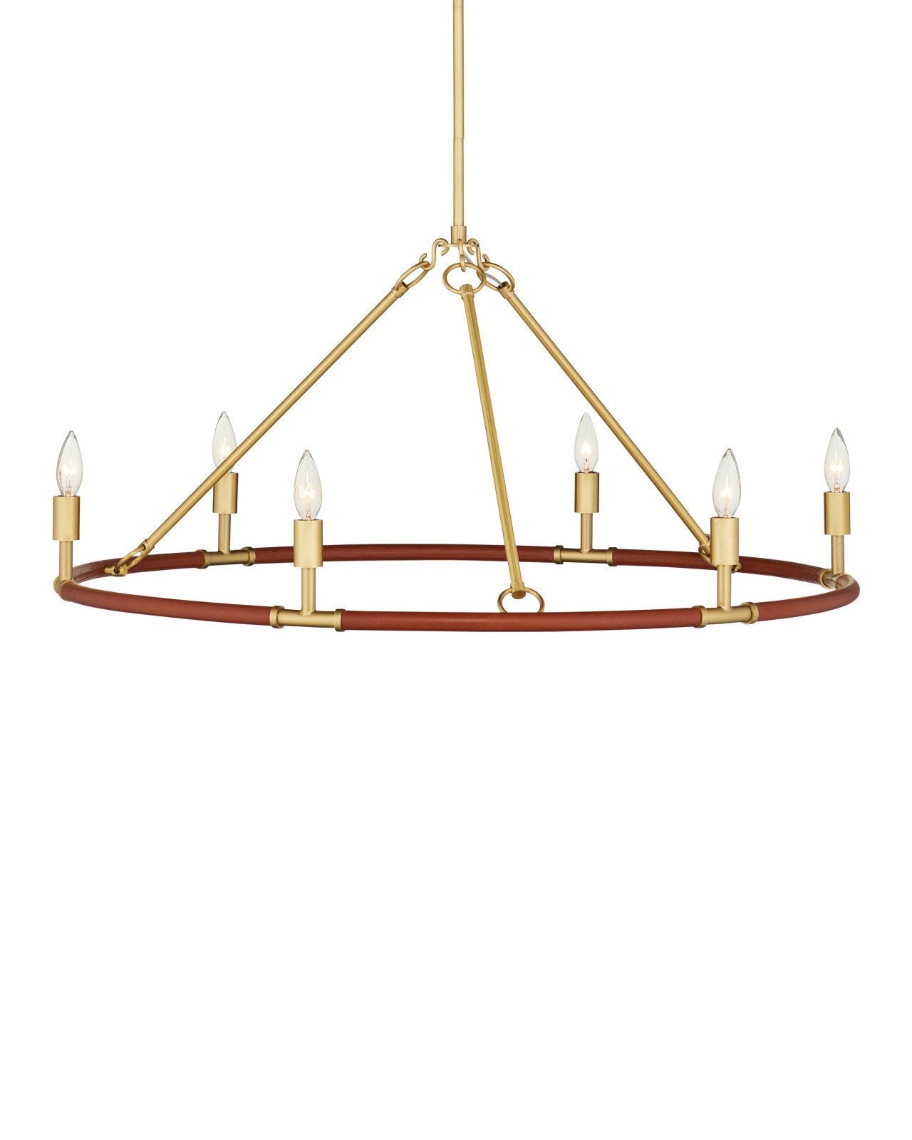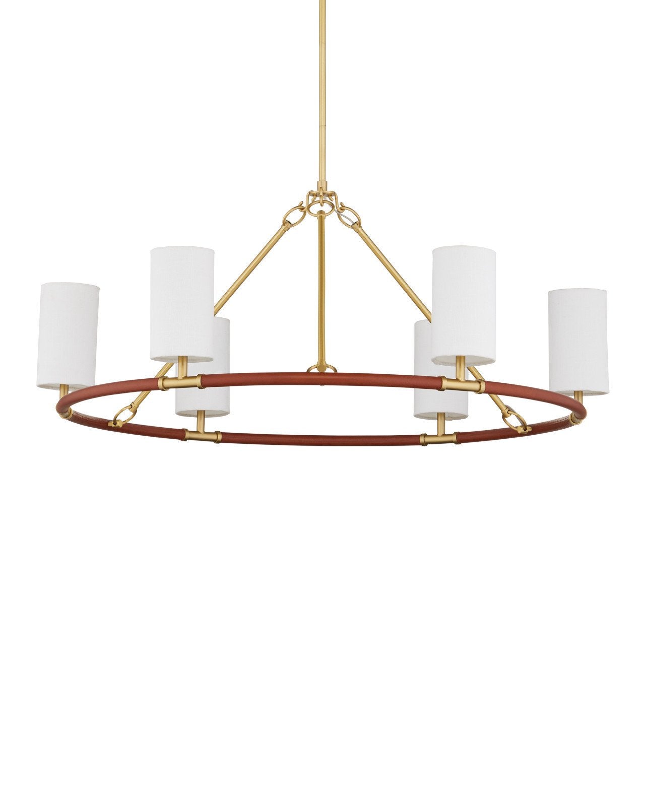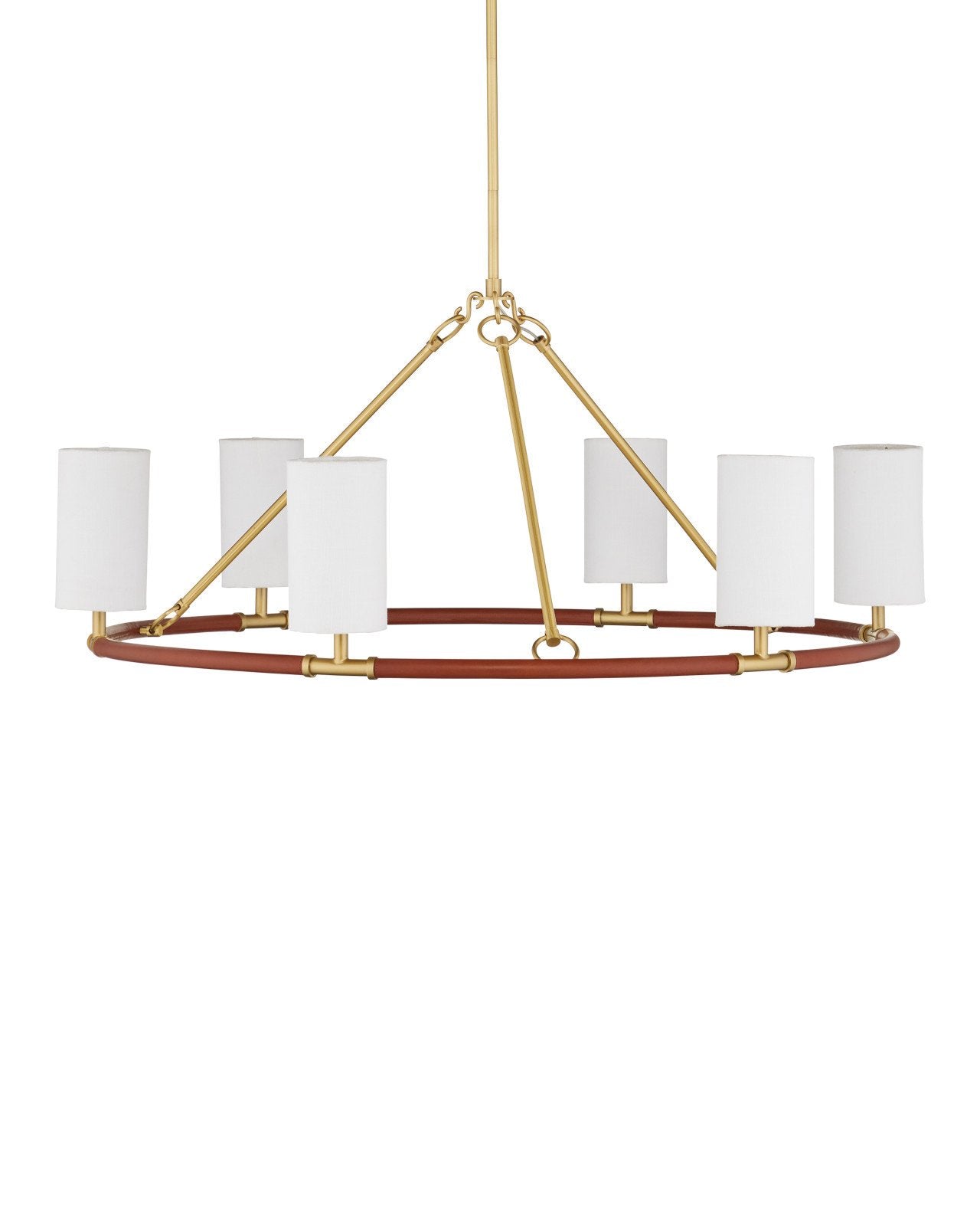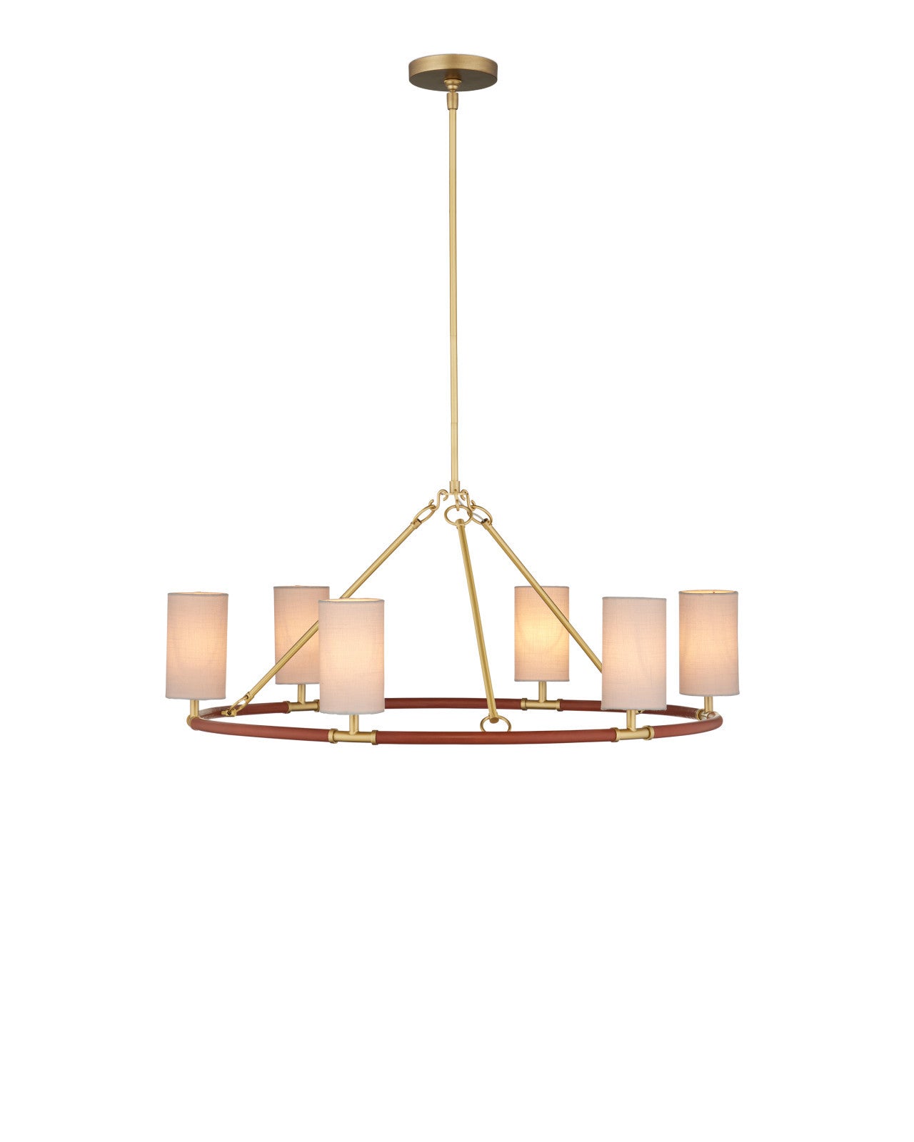 The Ellerston Medium Tan Chandelier features an exceptionally thin ring for its 36-inch diameter, giving the fixture a light, airy profile. Made of stainless steel in a brushed brass finish, the ring is detailed with brass at the points where the shades rise and wrapped in tan leather along the rest of its circumference. Off-white linen canister shades extend upward from the brass accents, their tailored look inspired by modern equestrian design. This six-light tailored fixture is dimmable.