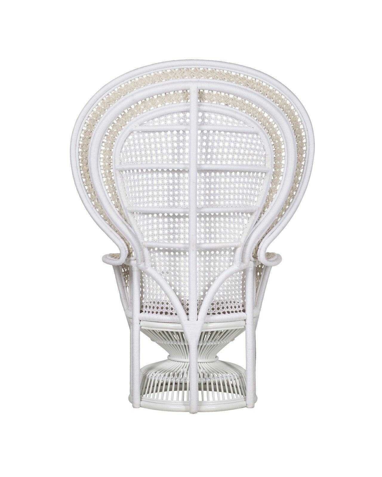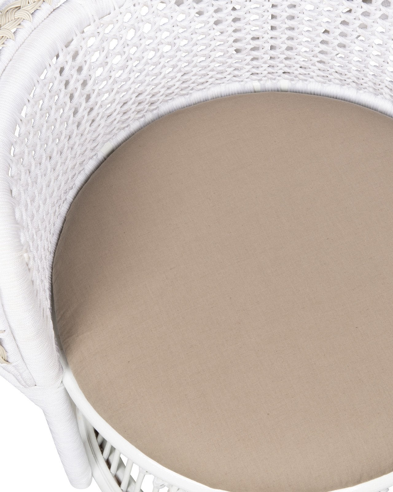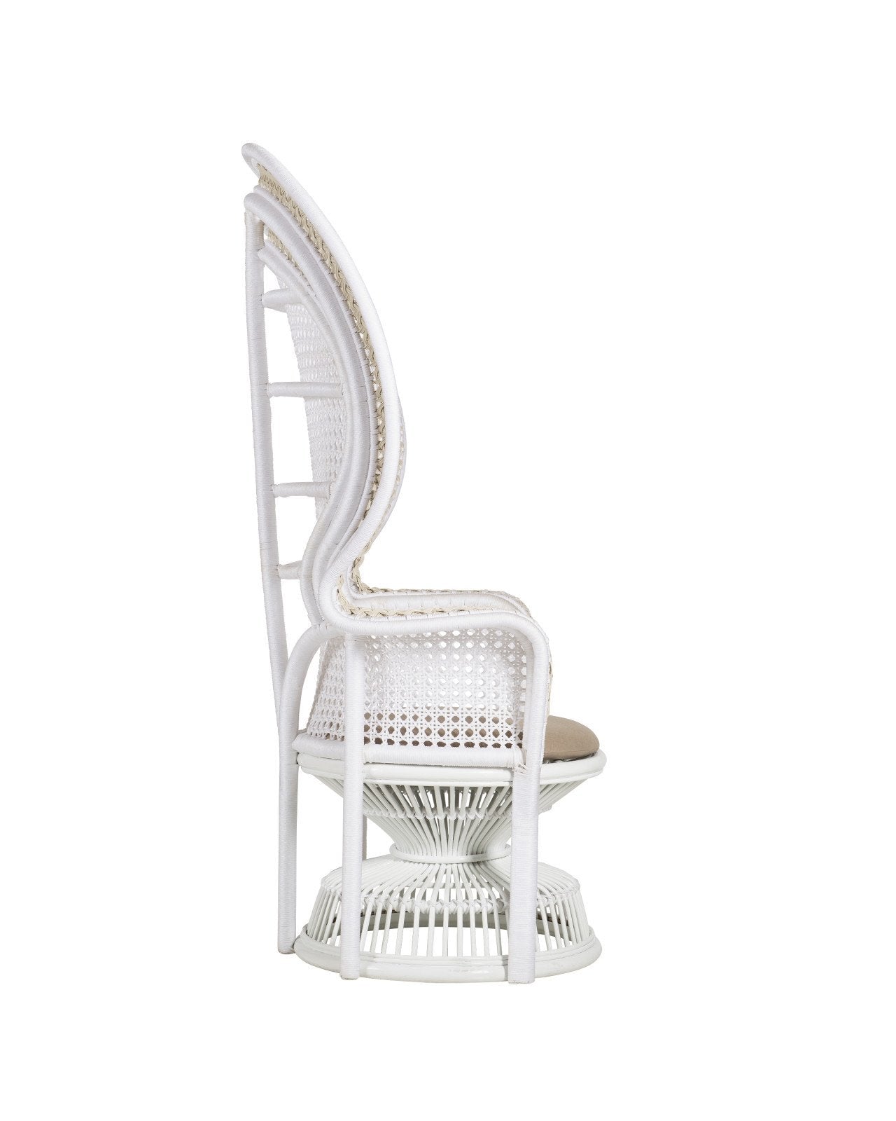 The Emanuelle White Armchair is a stunning, classic Peacock chair silhouette with white performance rope wrapped over a bent rattan frame with beige poly-woven accents. This style of rattan chair has long been symbolic of royalty and empowerment, and was popular in the 1960s and ‘70s. Now, this look prevails as a symbol of luxury, bohemian style. The loose seat cushion is covered in Linho Adobe linen-cotton blend upholstery.